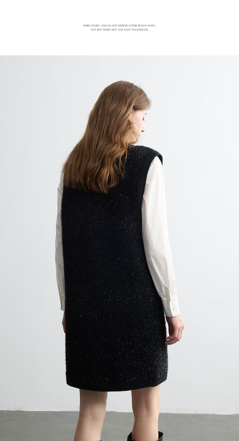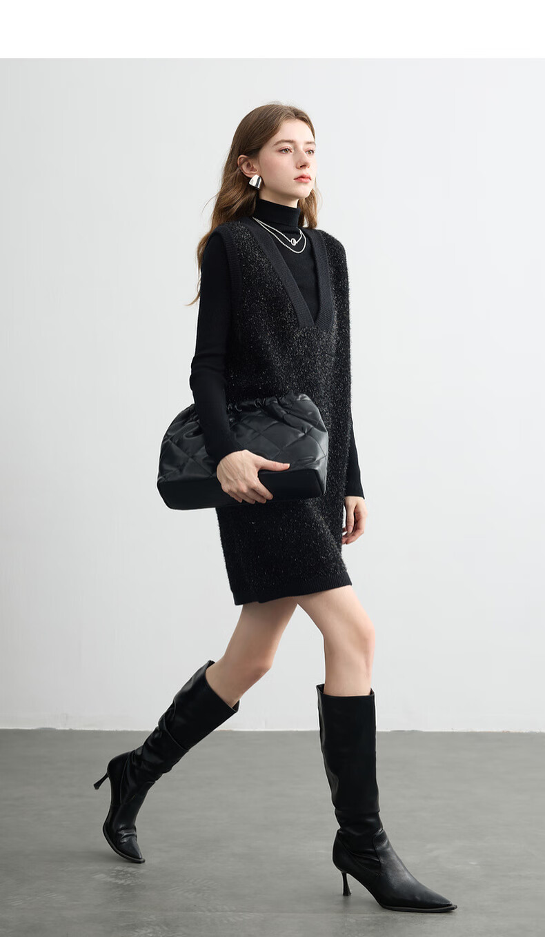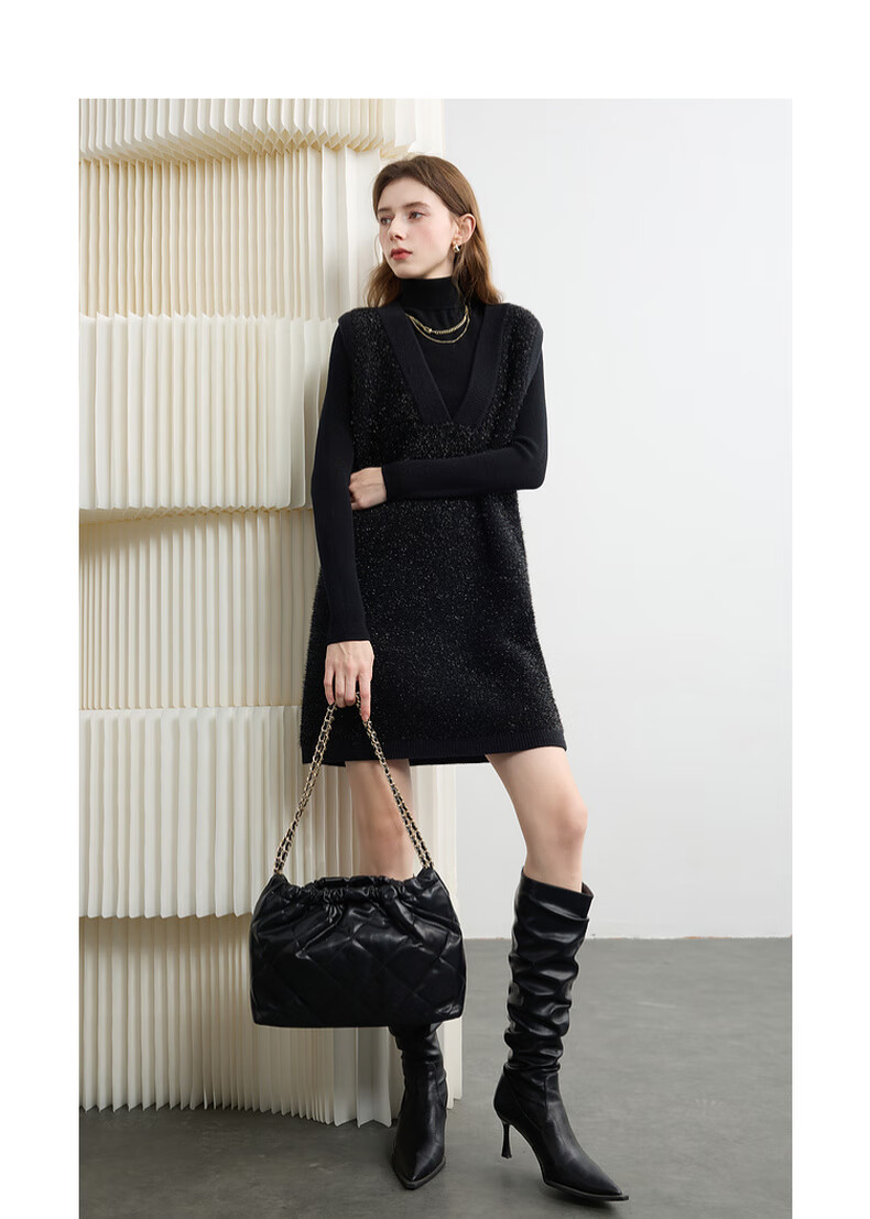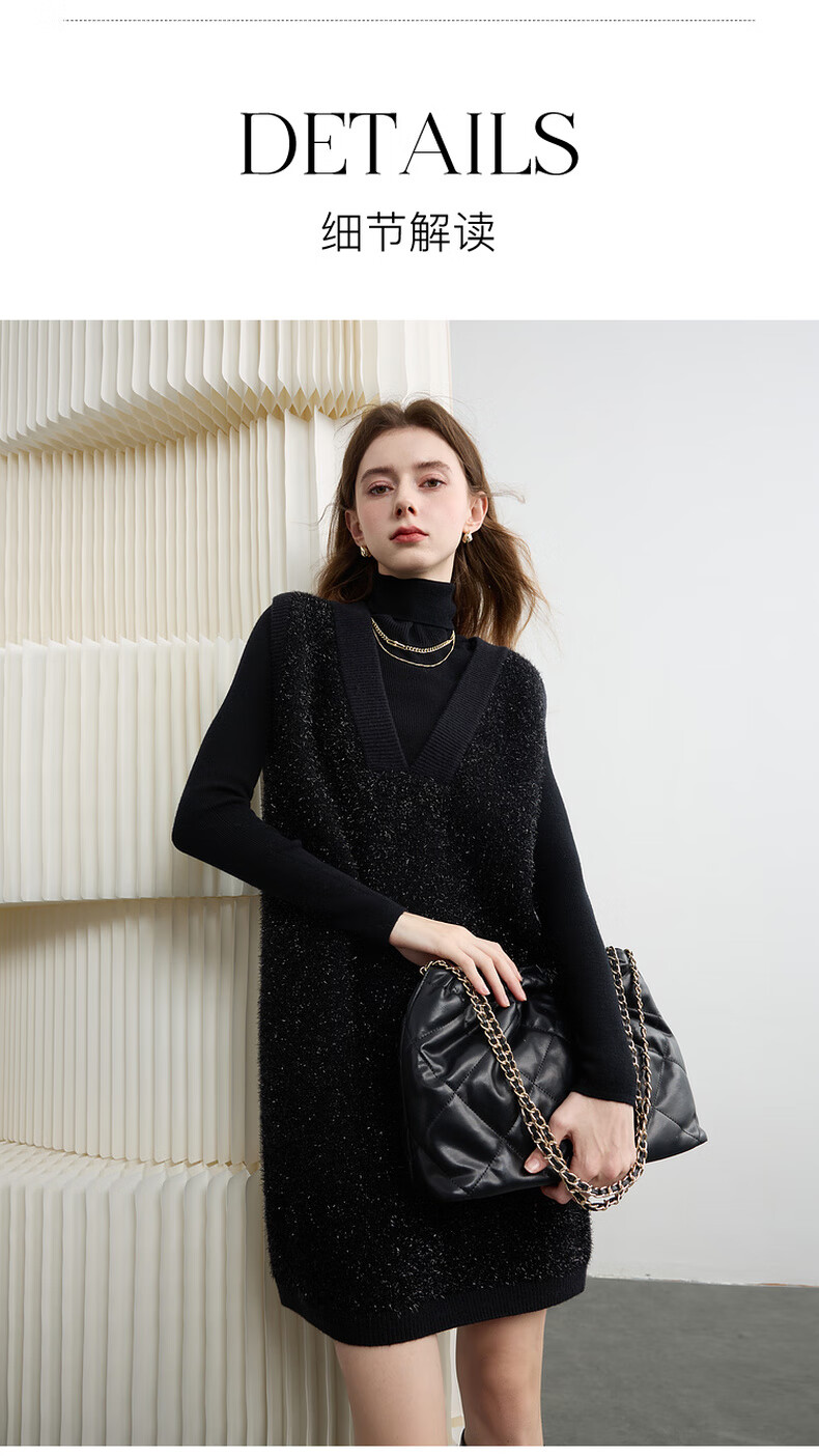 三彩2025冬季新款无袖亮丝针织连衣裙V领直筒短裙背心裙叠搭女