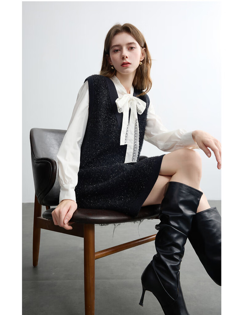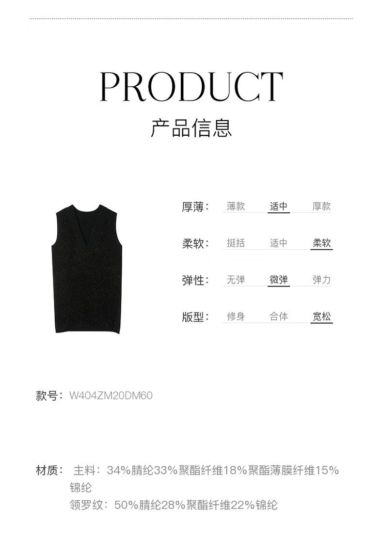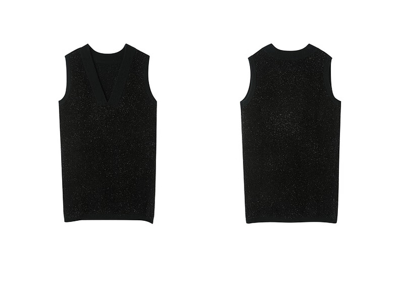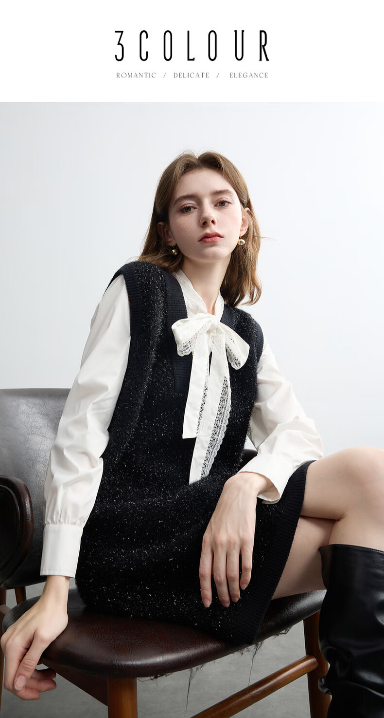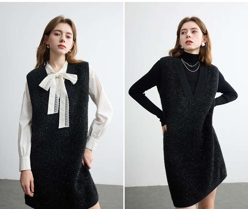 三彩2025冬季新款无袖亮丝针织连衣裙V领直筒短裙背心裙叠搭女
