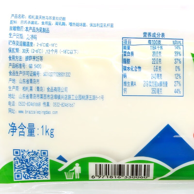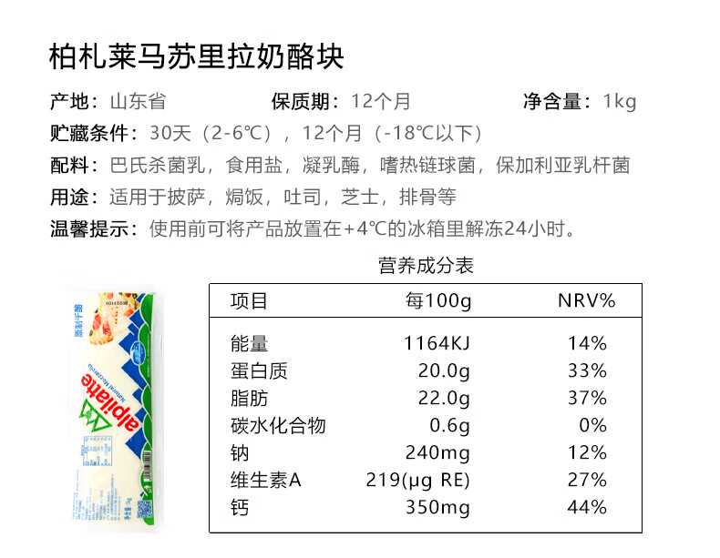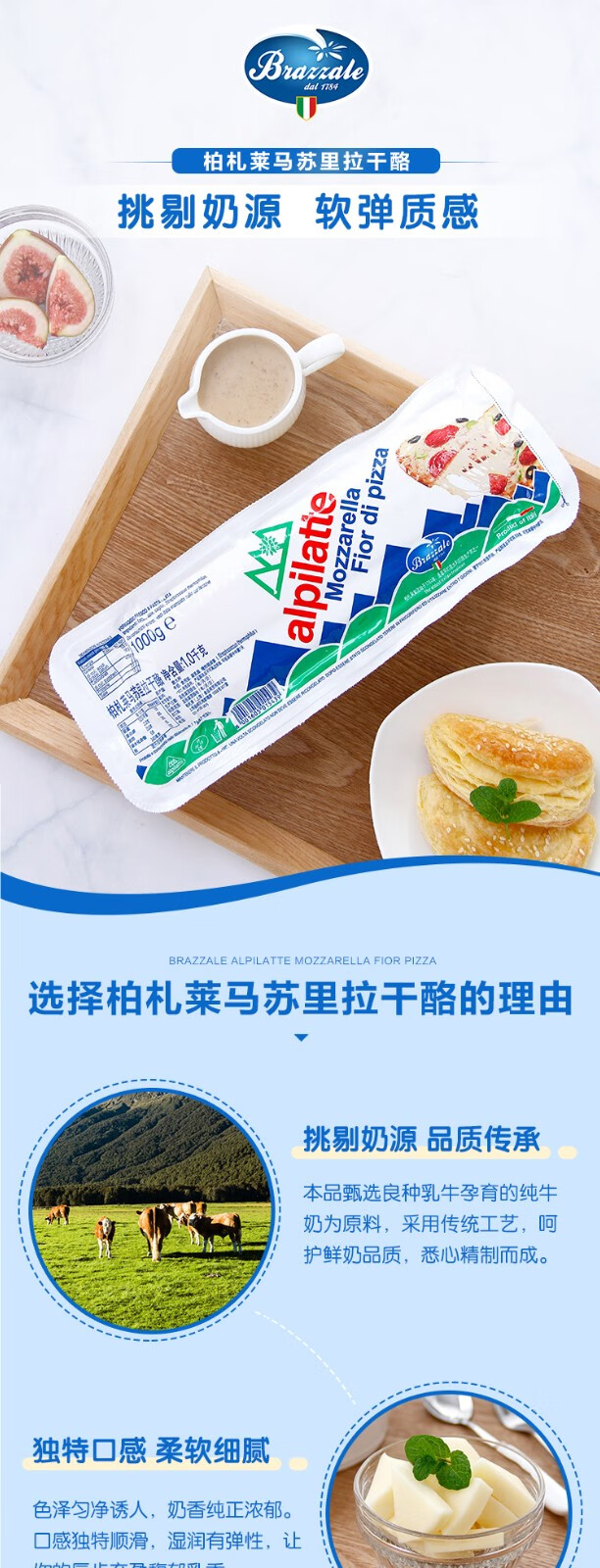 柏札莱阿尔卑马苏里拉奶酪块1kg 拉丝芝士干酪披萨原制家用烘焙材料碎 马苏里拉奶酪块 1kg*1袋 (买就送番茄膏,不叠加送)