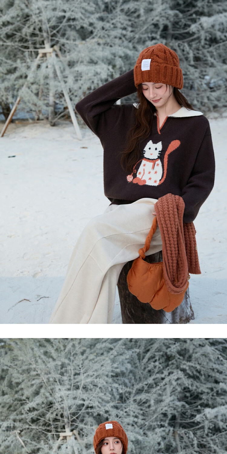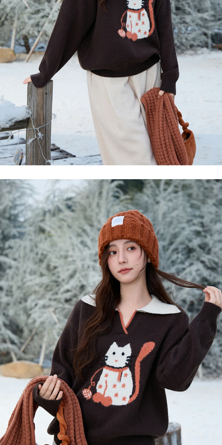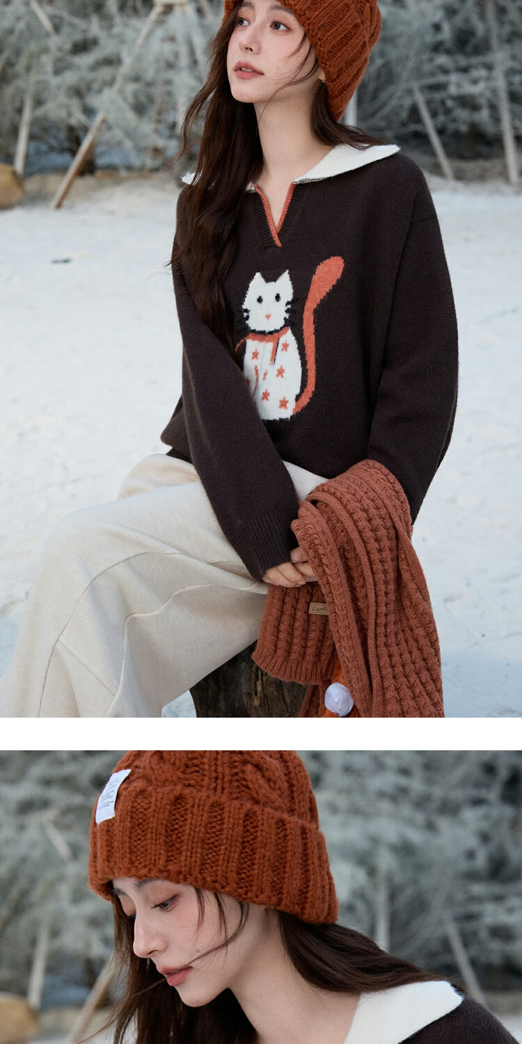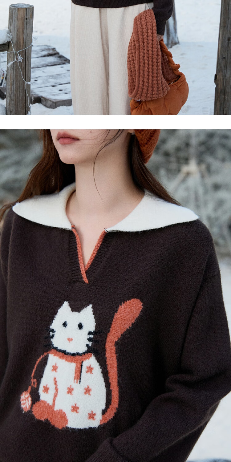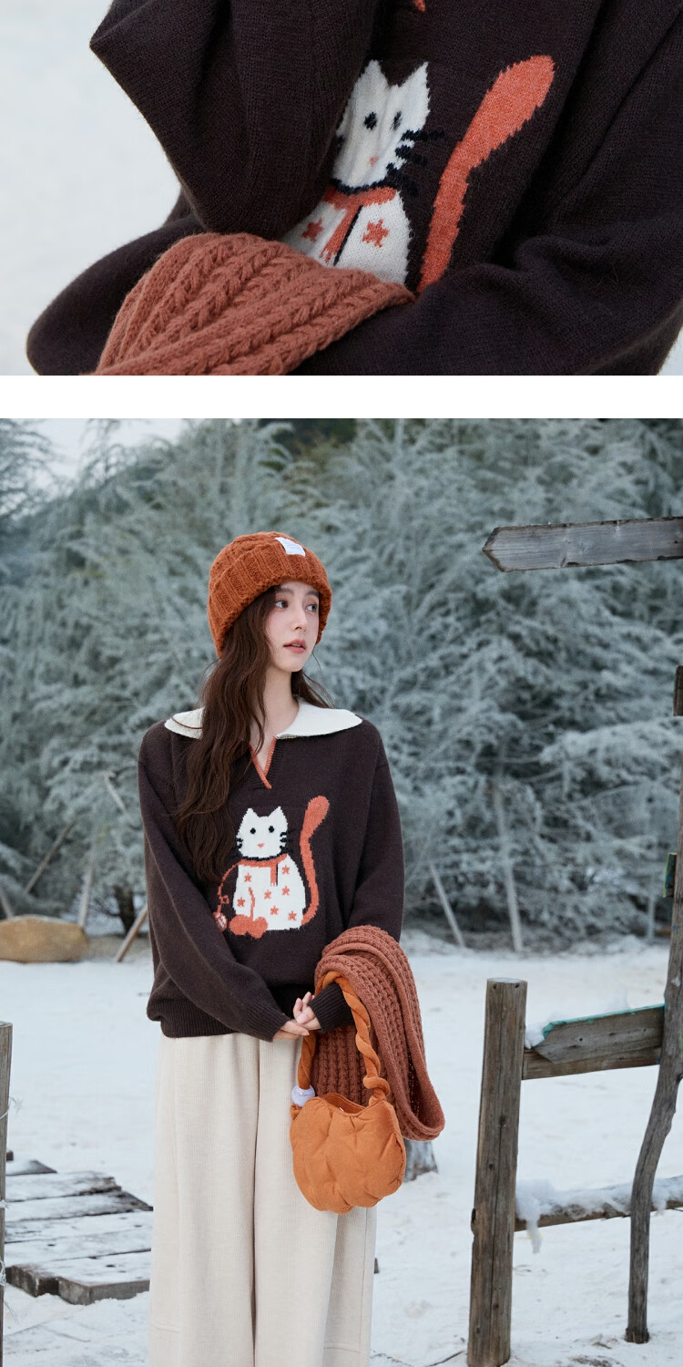 谜秀复古猫咪加厚针织衫2025冬礼遇季撞色翻领立体提花新年鸿运毛衣女 咖啡色 咖色 均码