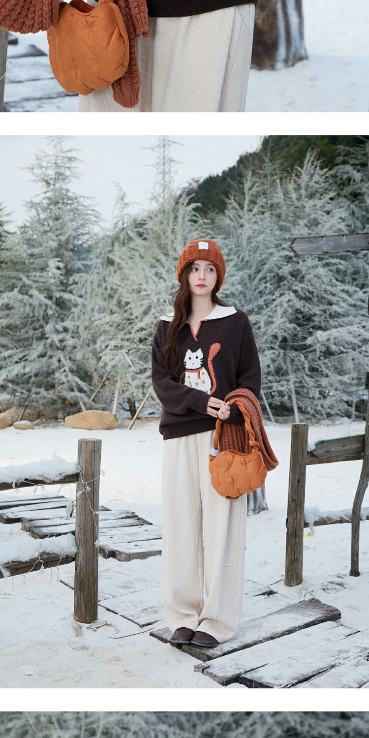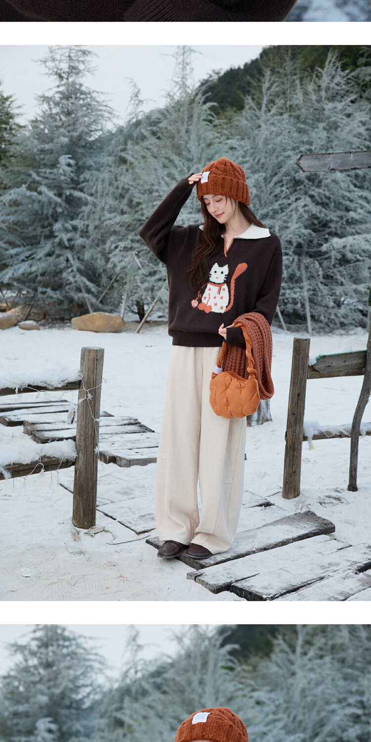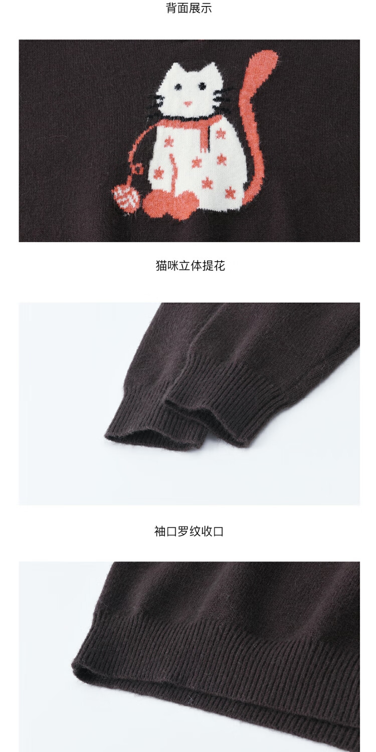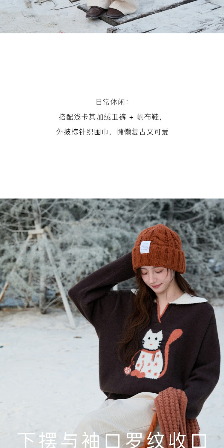 谜秀复古猫咪加厚针织衫2025冬礼遇季撞色翻领立体提花新年鸿运毛衣女 咖啡色 咖色 均码