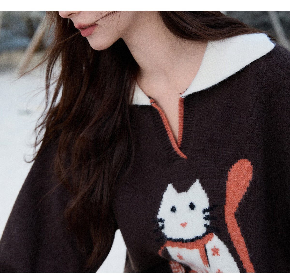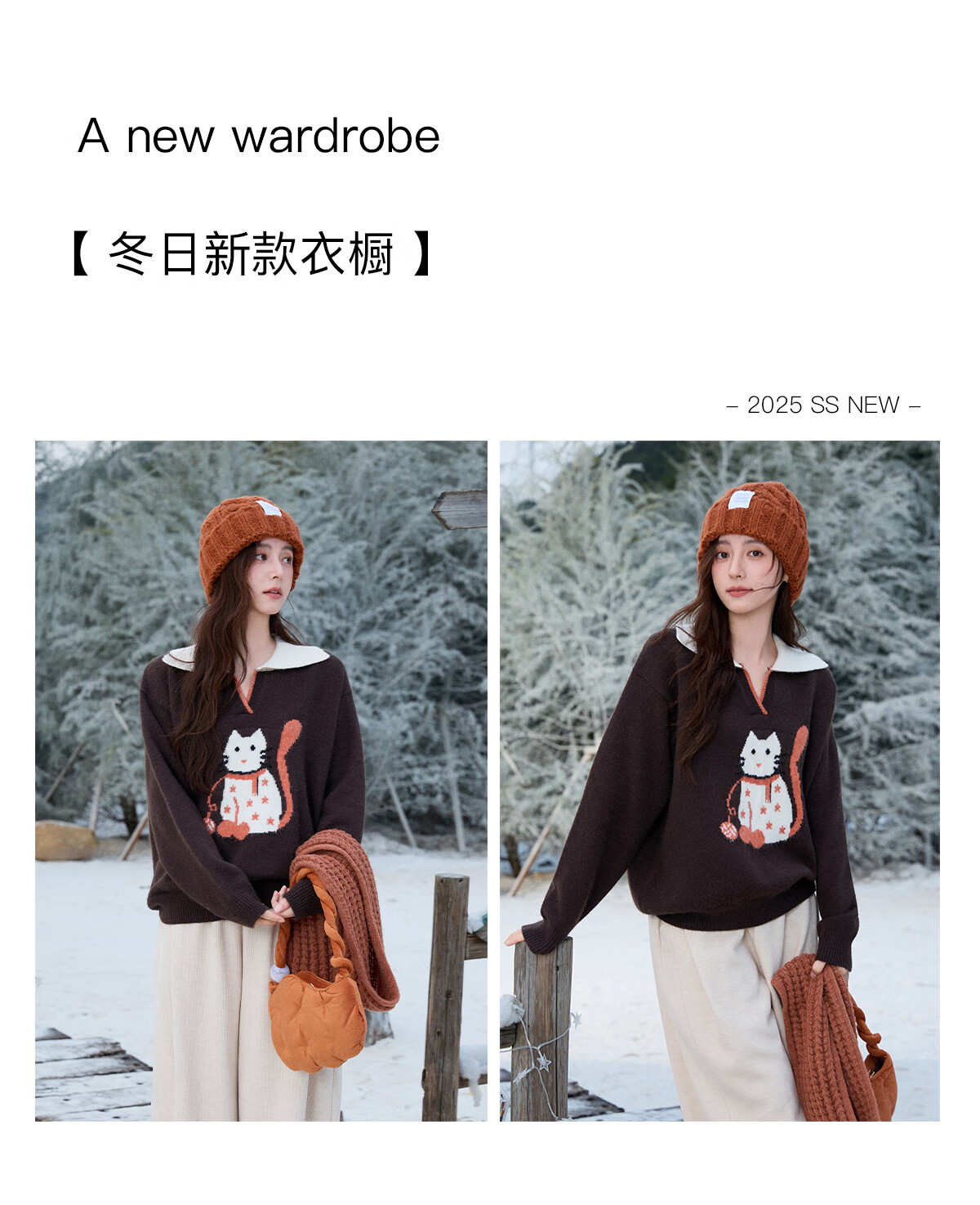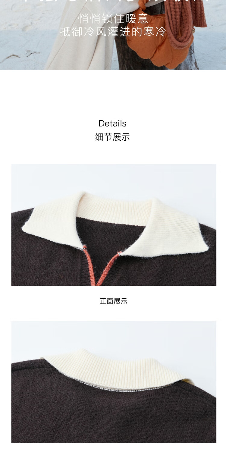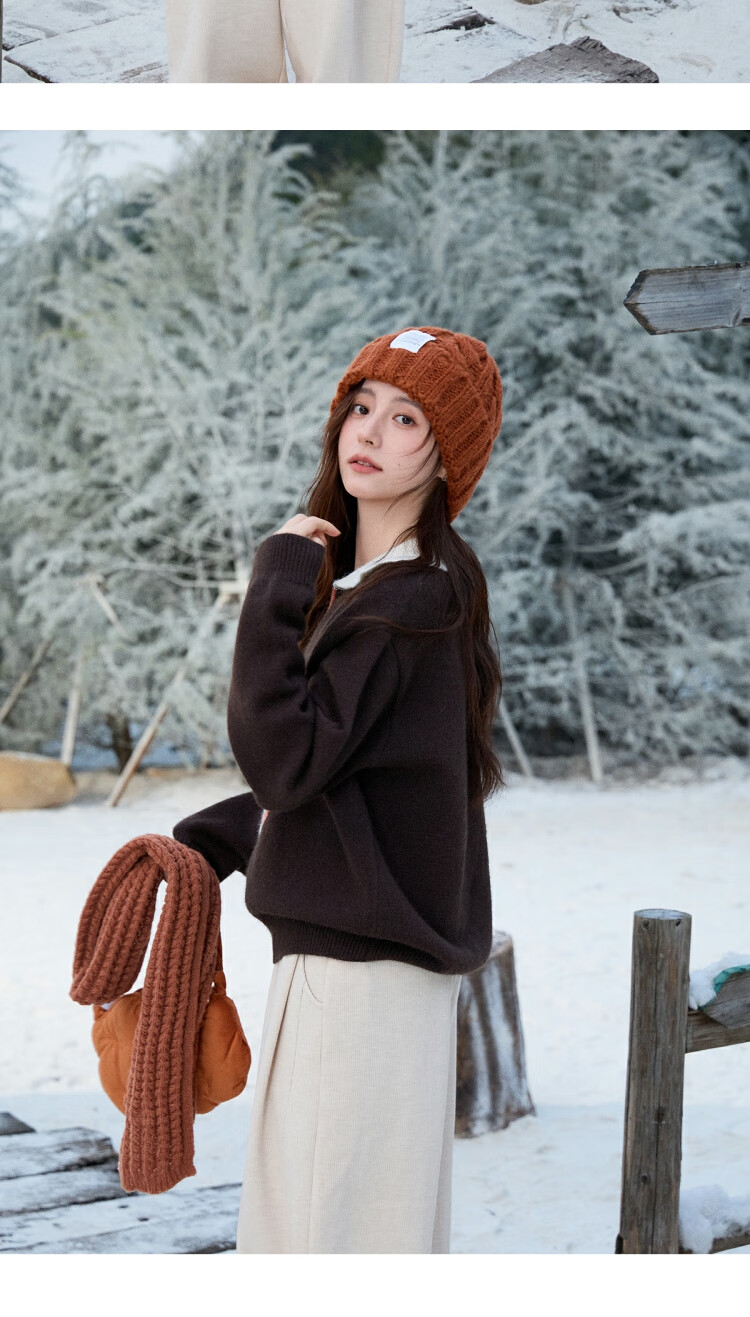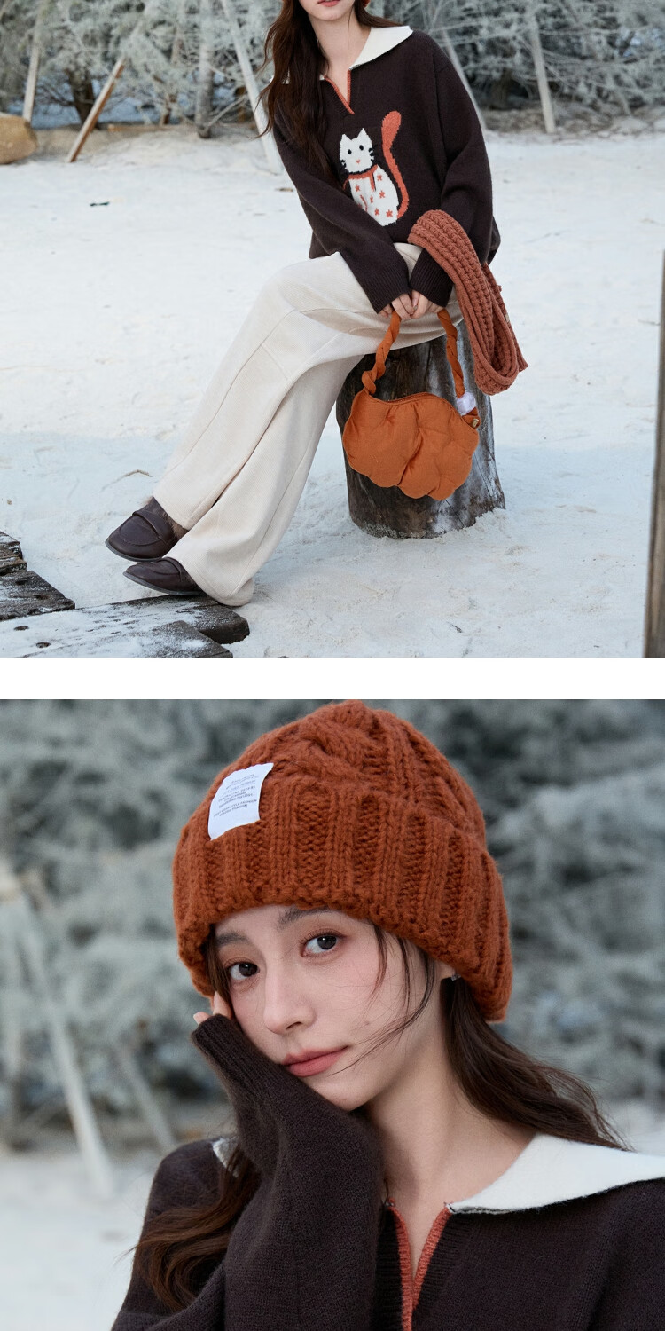 谜秀复古猫咪加厚针织衫2025冬礼遇季撞色翻领立体提花新年鸿运毛衣女 咖啡色 咖色 均码
