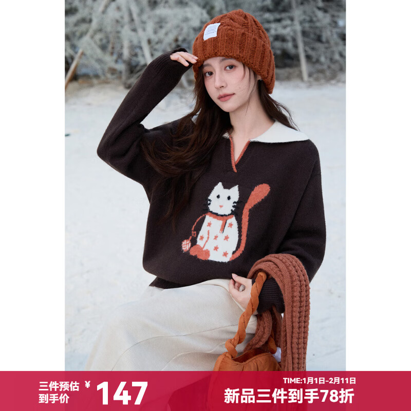 谜秀复古猫咪加厚针织衫2025冬礼遇季撞色翻领立体提花新年鸿运毛衣女 咖啡色 咖色 均码
