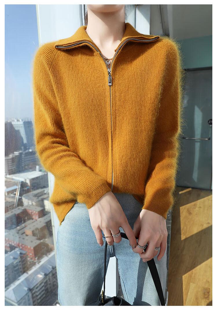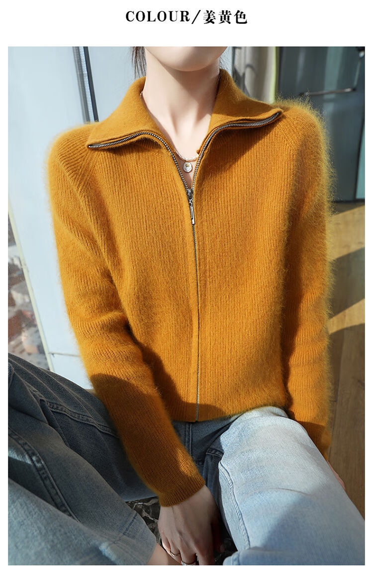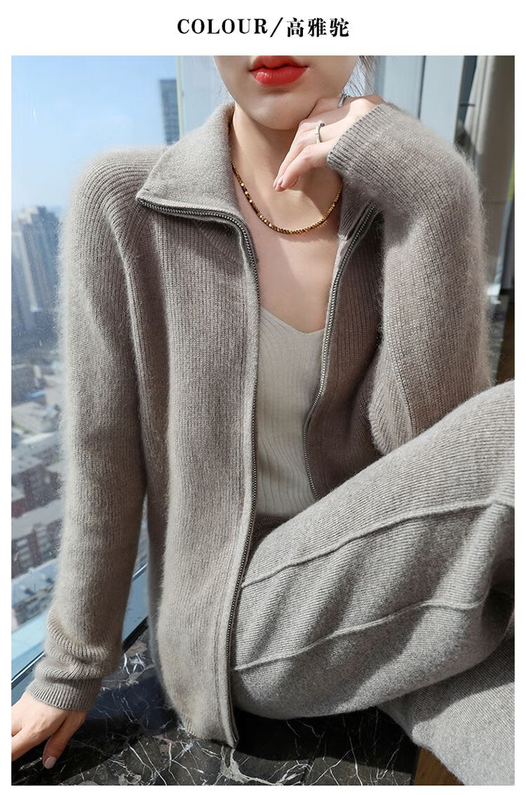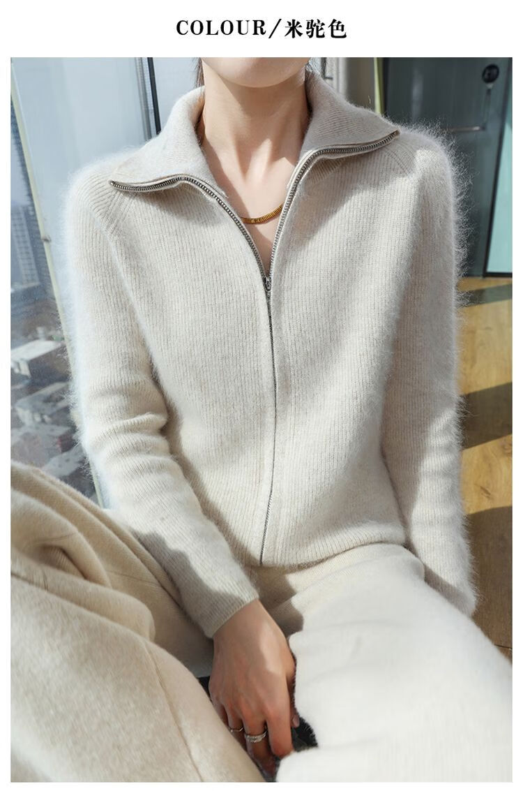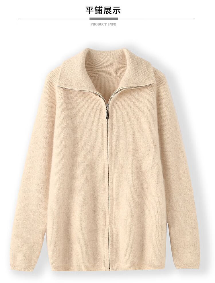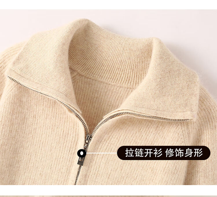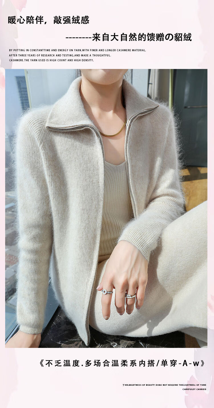 皮尔卡丹(pierre cardin)加厚秋冬新款貂绒翻领拉链针织开衫女短外高领毛衣保暖外搭上衣 米驼色 S 90-100斤