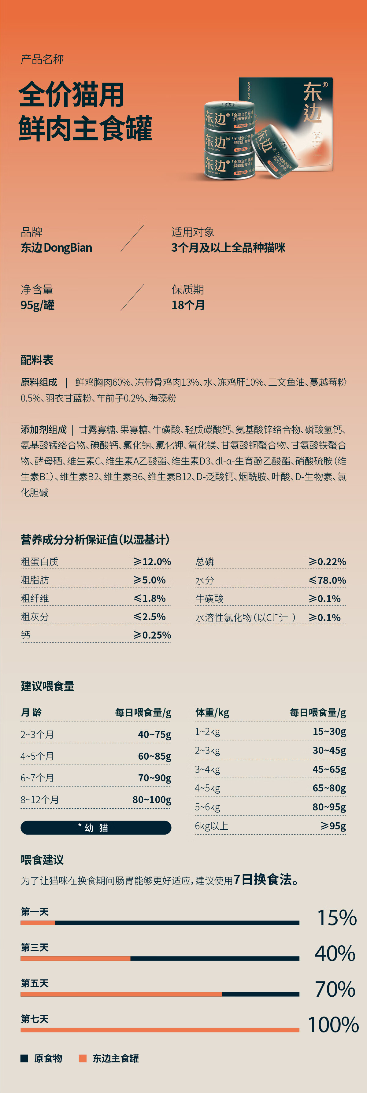 东边全价猫罐头主食罐猫湿粮低敏鲜肉呵护肠胃鸡肉味95g*4罐