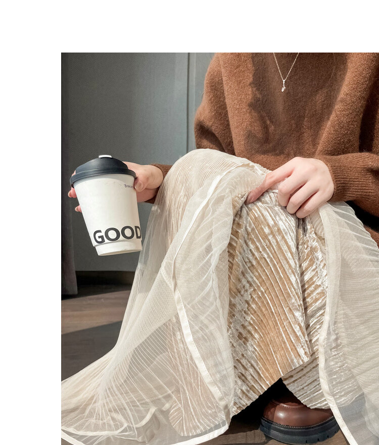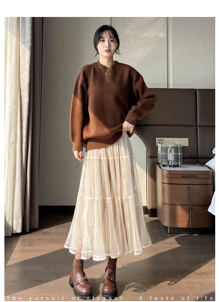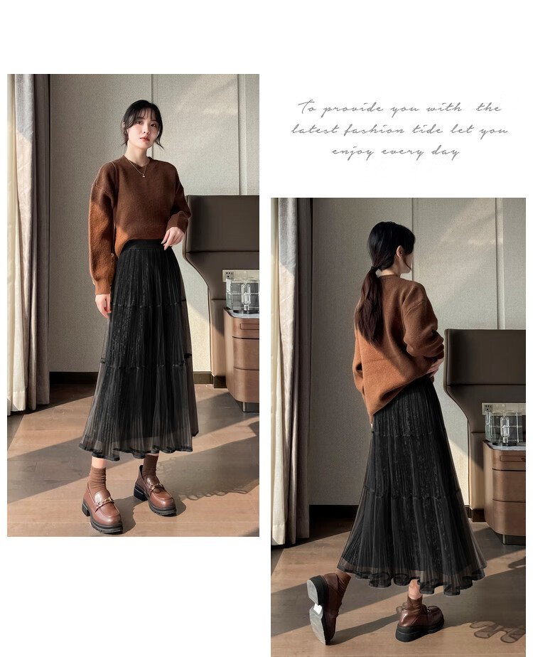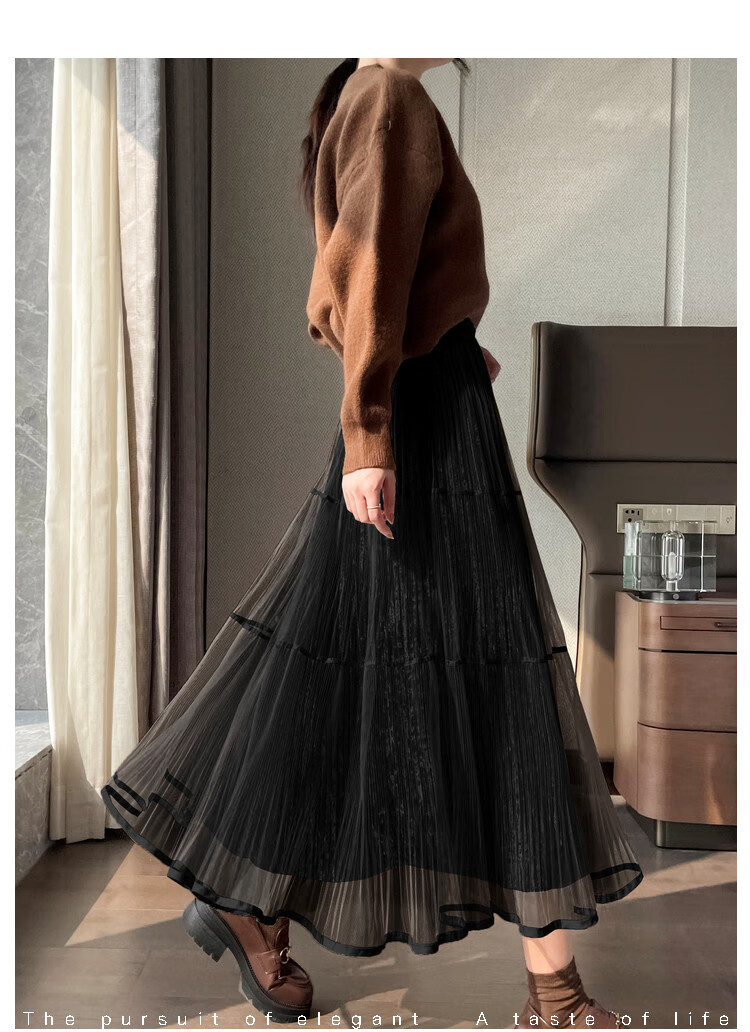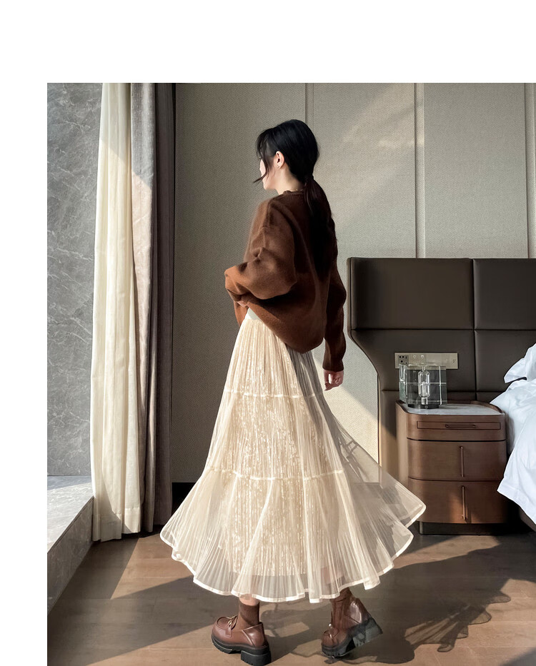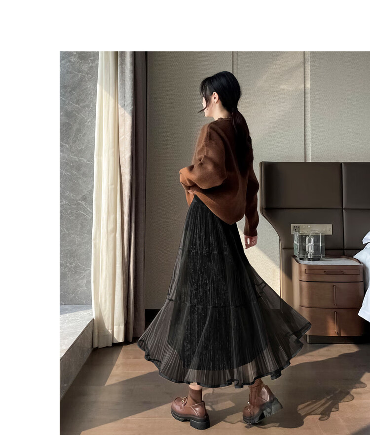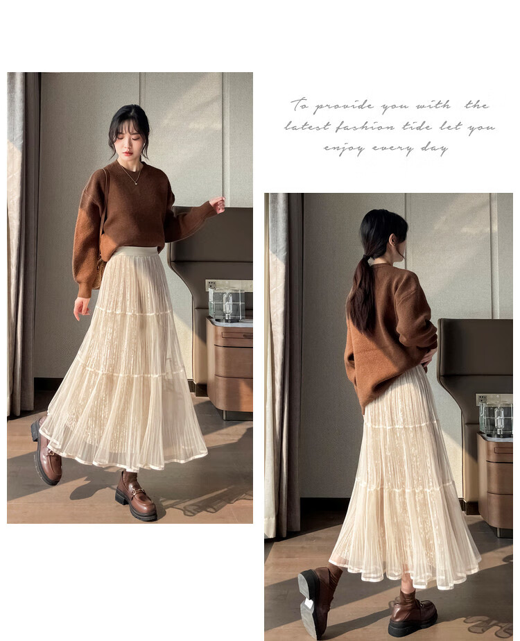 苏醒的乐园冬季小个子百搭a字长裙网纱拼接蛋糕裙半身裙 米杏色 均码