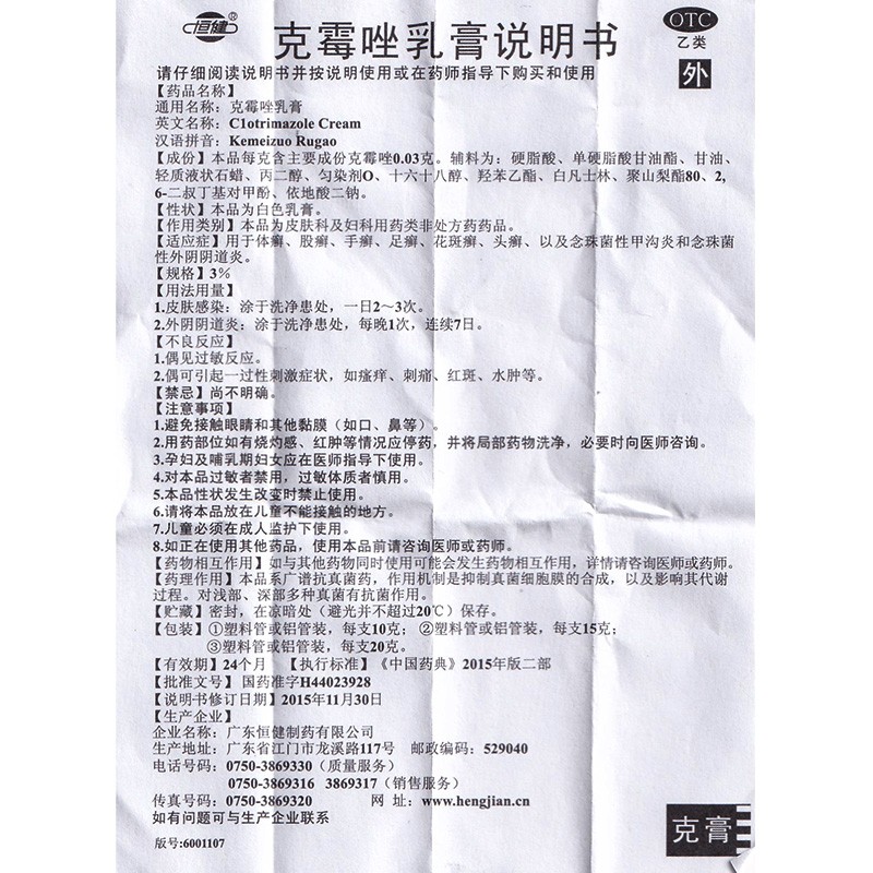 恒健 克霉唑乳膏 3% 10g 体癣 股癣 手癣 足癣 花斑癣 头癣 念珠菌性甲沟炎
