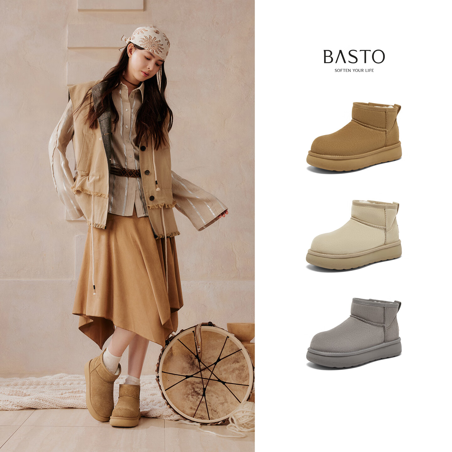 百思图2025冬季新款雪地靴时尚简约户外休闲女短靴J9512DD5 米杏色 37