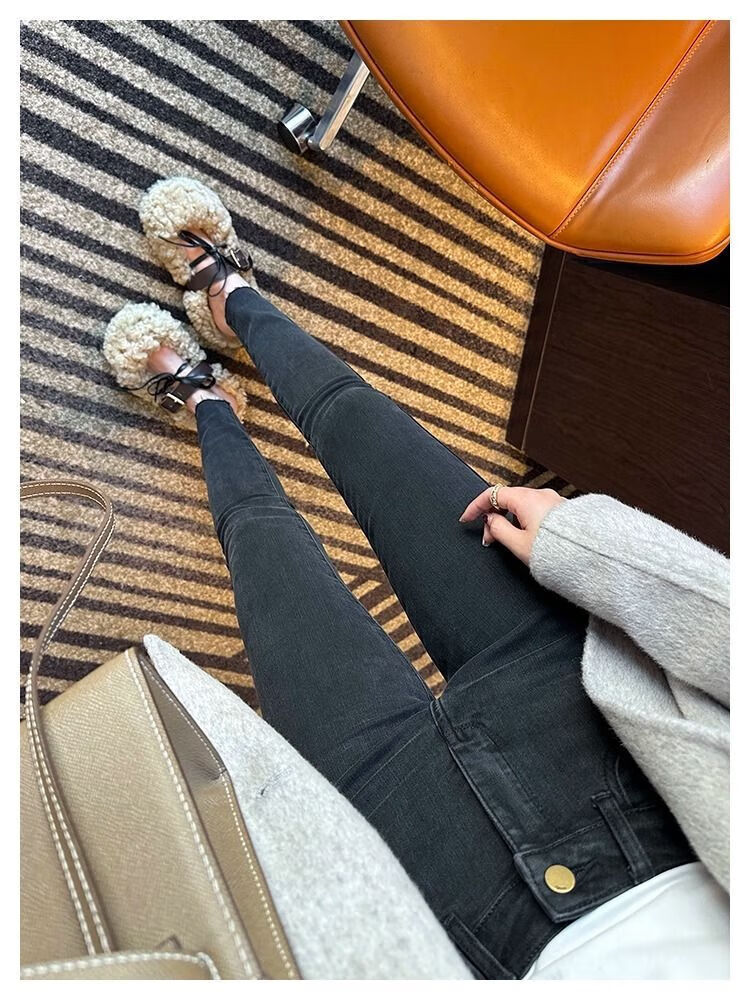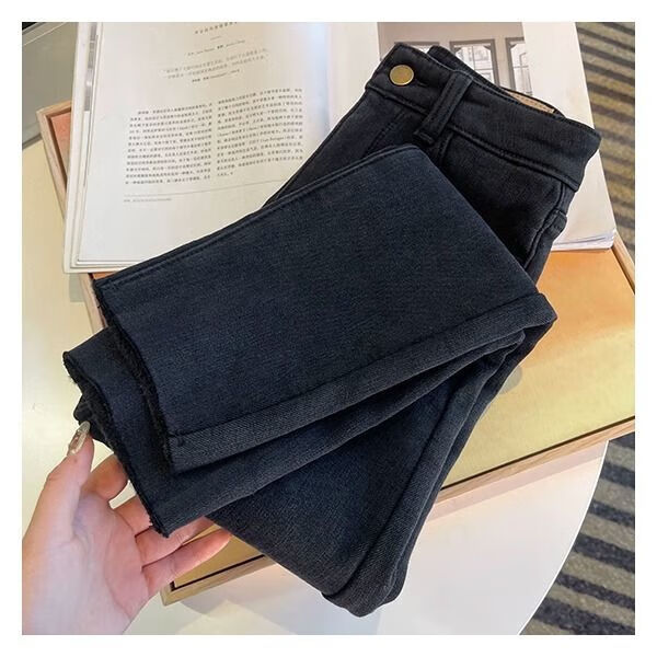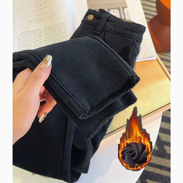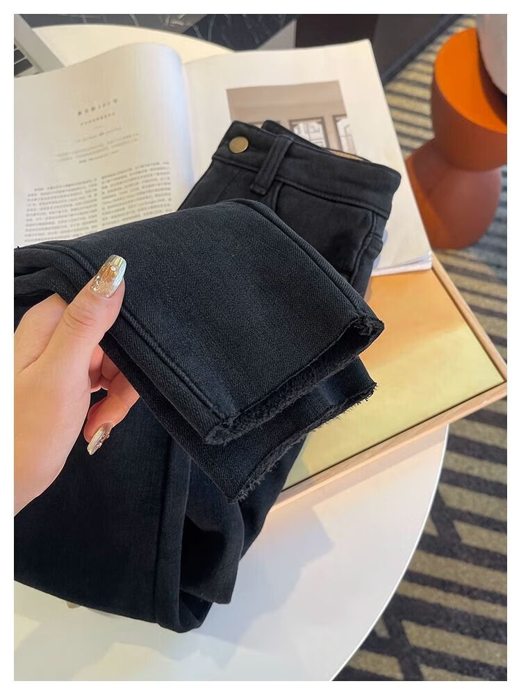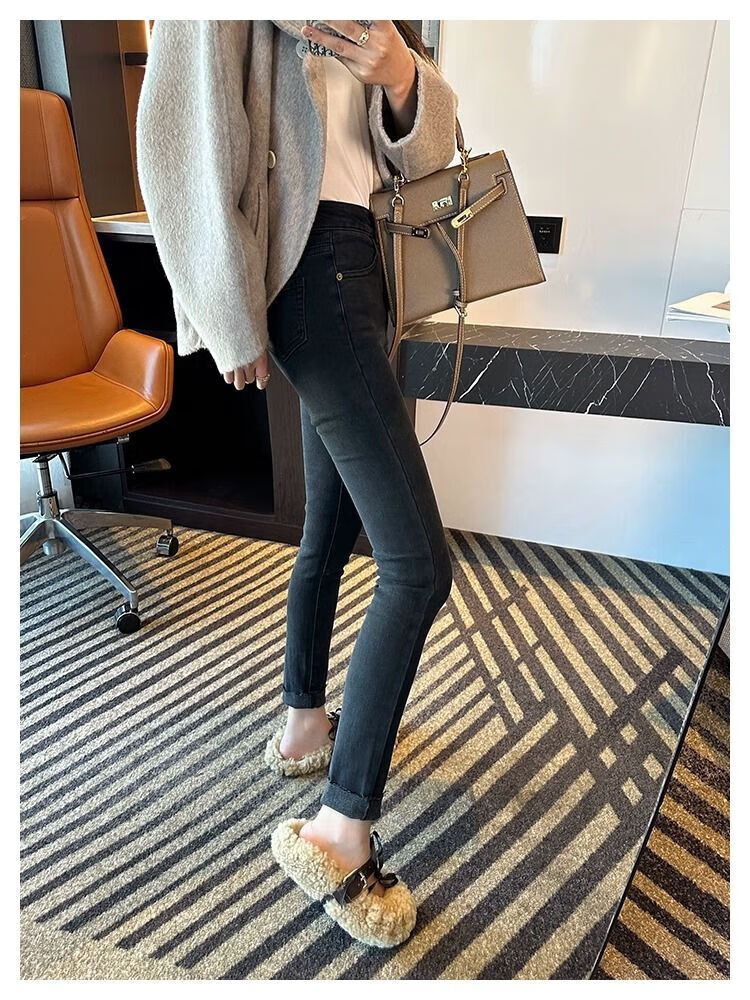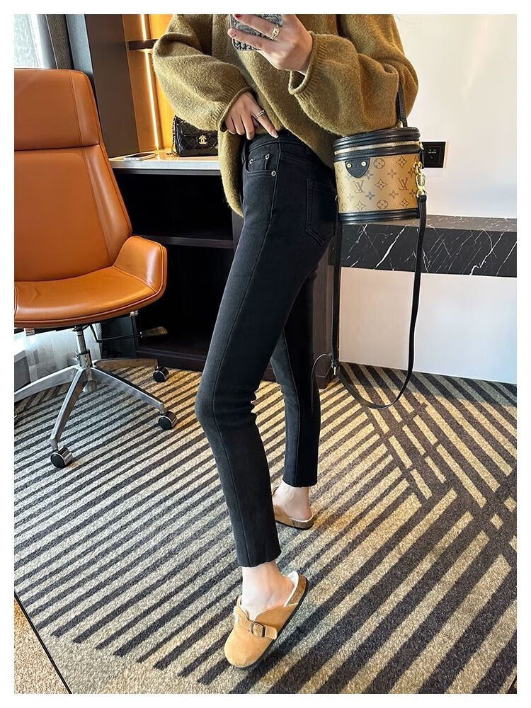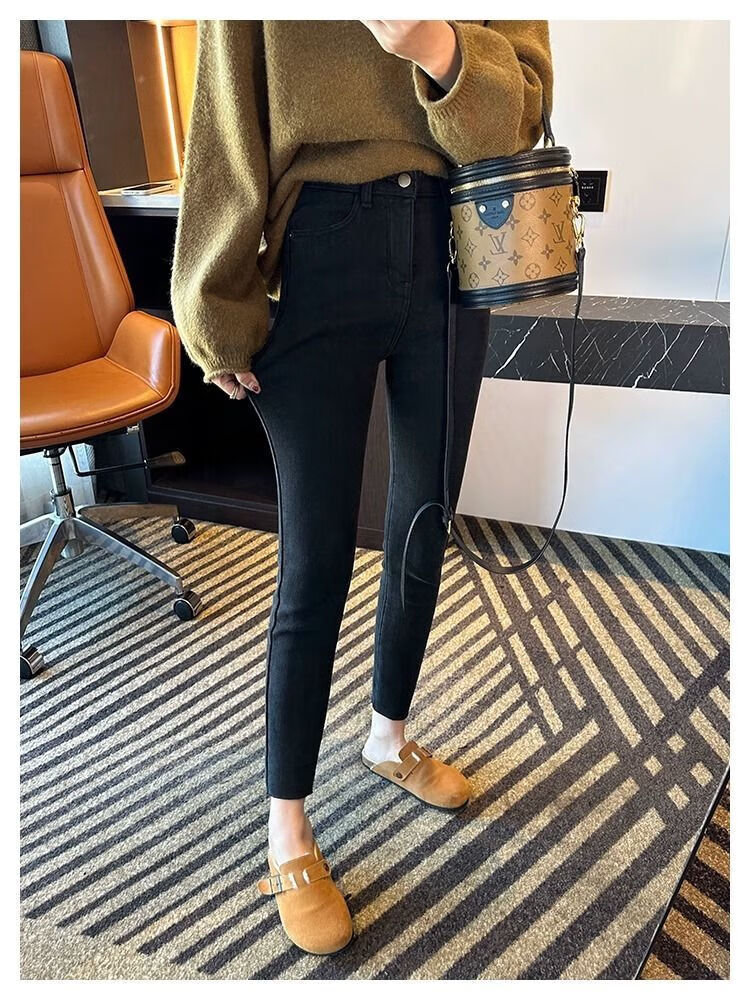 苜戈小脚牛仔裤女2025秋季修身弹力加绒高腰显瘦修身铅笔裤子冬季 黑色(八分单裤) 25 建议75-85斤