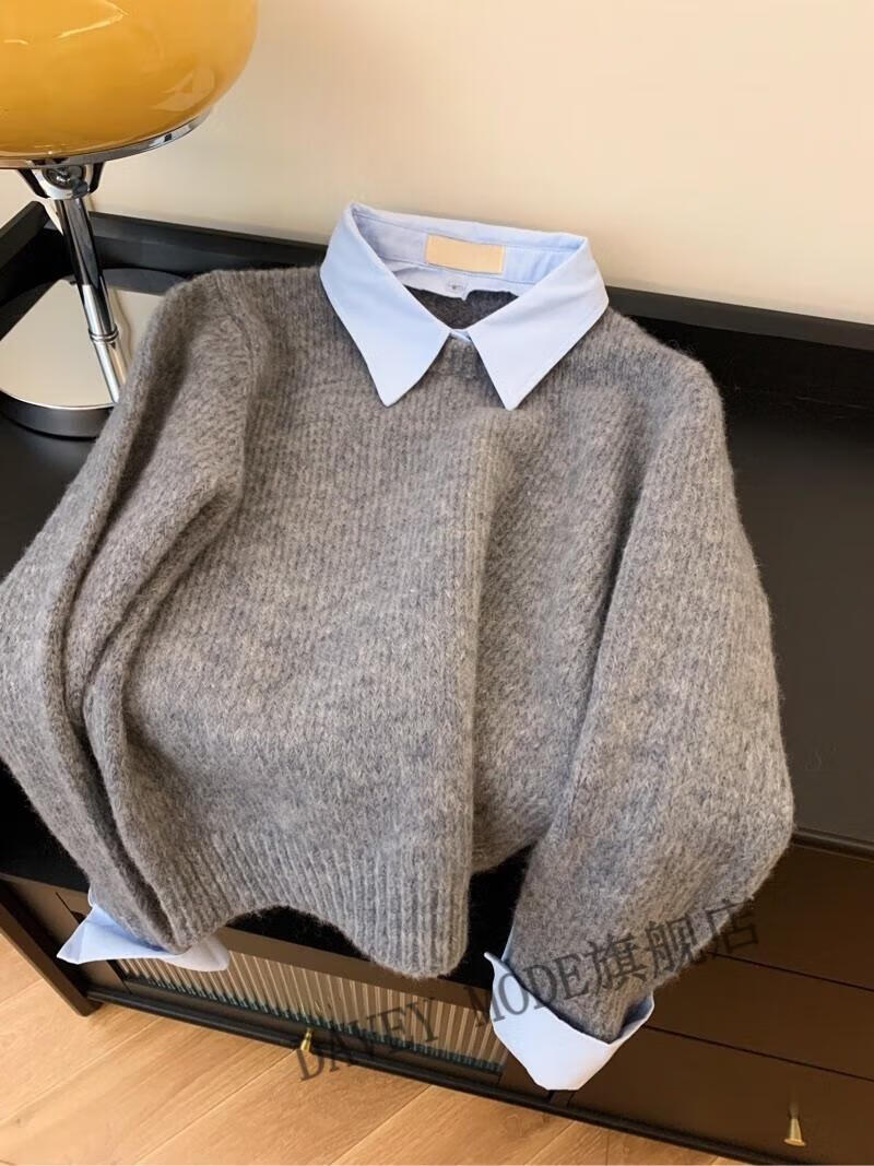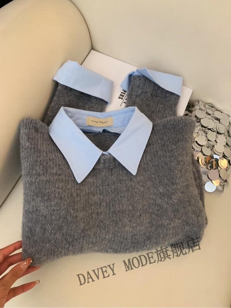 DAVEY MODE假两件衬衫领毛衣女秋装新款内搭慵懒风撞色翻领灰色针织衫上衣 灰色【zt】 L 建议105-115斤