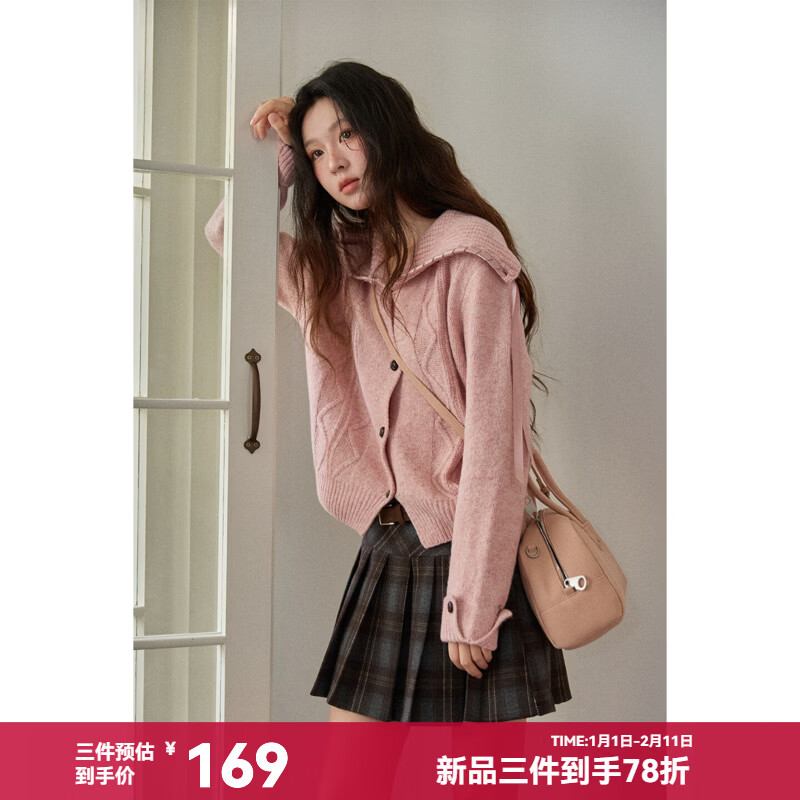 谜秀新年礼遇季大翻领麻花针织开衫秋2025冬复古纽扣宽松慵懒毛衣外套 粉紫色 粉色 M