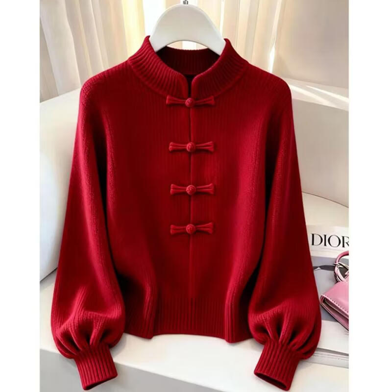 新年跨年穿搭新中式国风立领针织毛衣秋冬季大码慵懒软糯上衣 红色毛衣(单件) 均码 L(建议100-115斤)