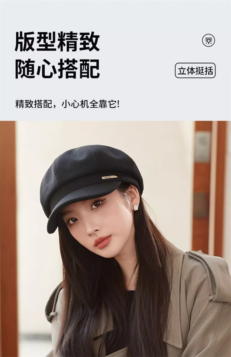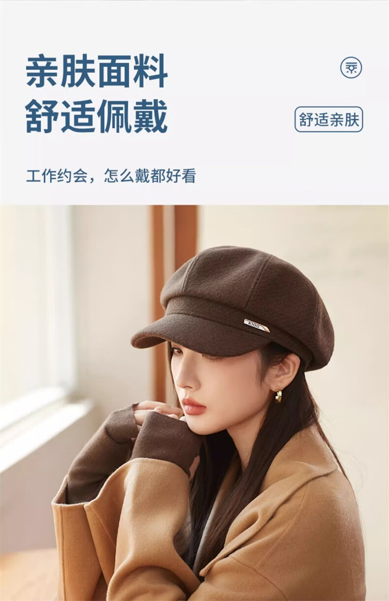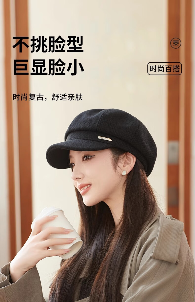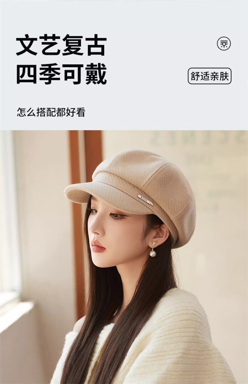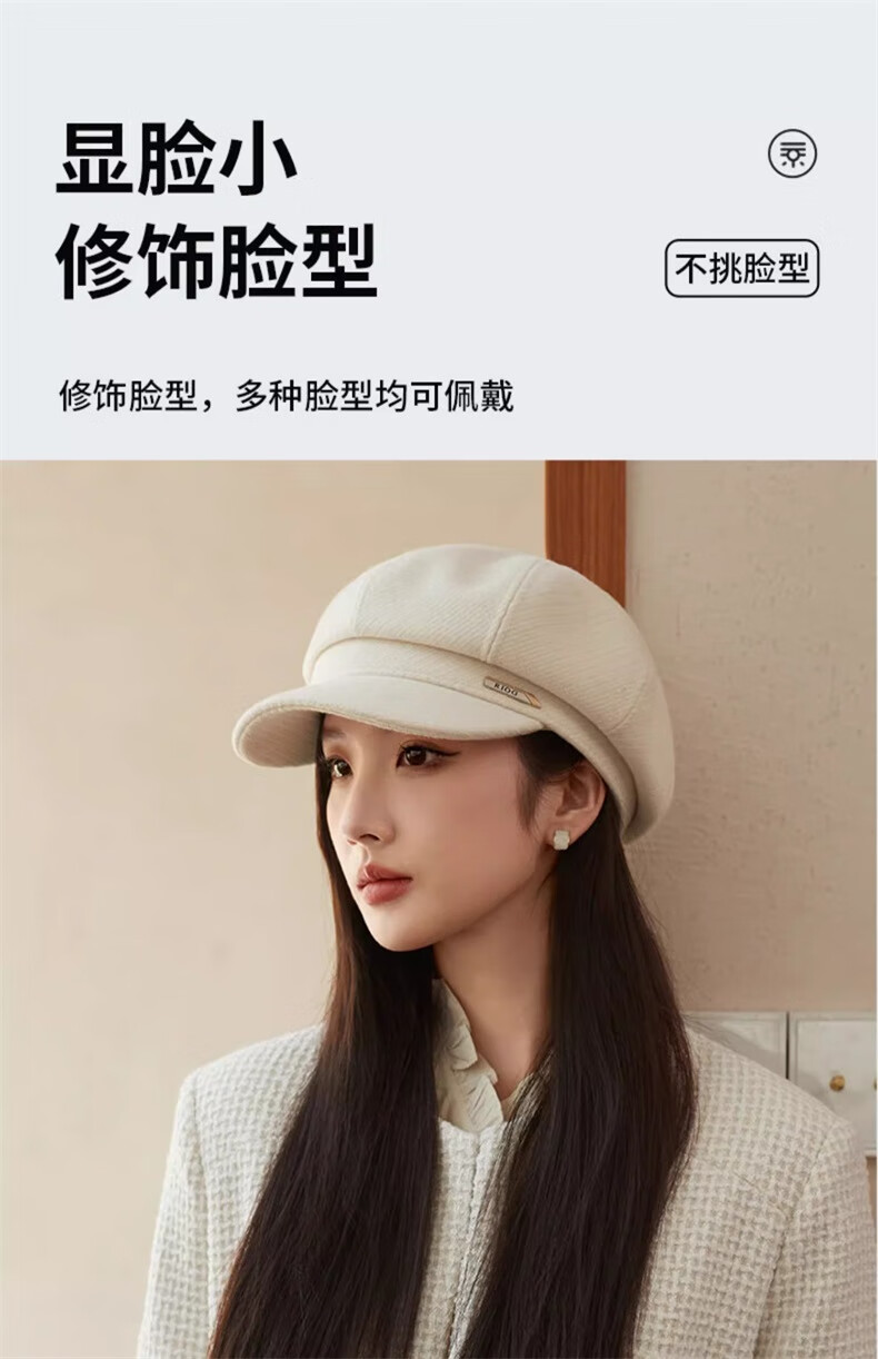 啄木鸟贝雷帽女款秋冬八角帽韩版百搭显脸小帽子英伦复古鸭舌报童帽 米白色