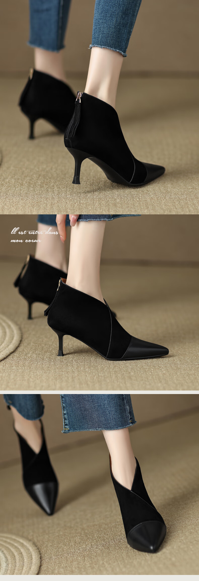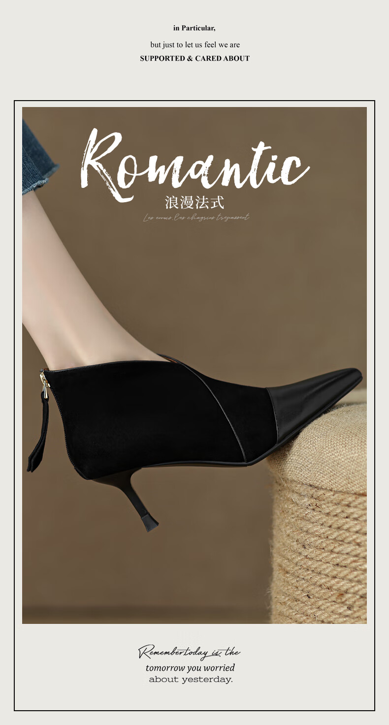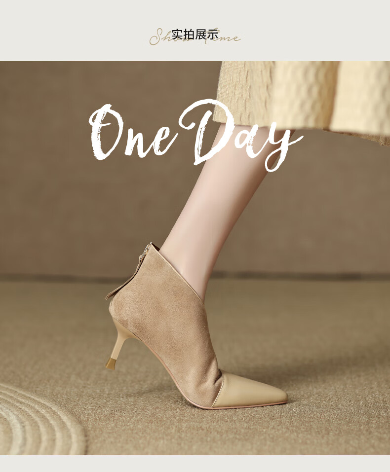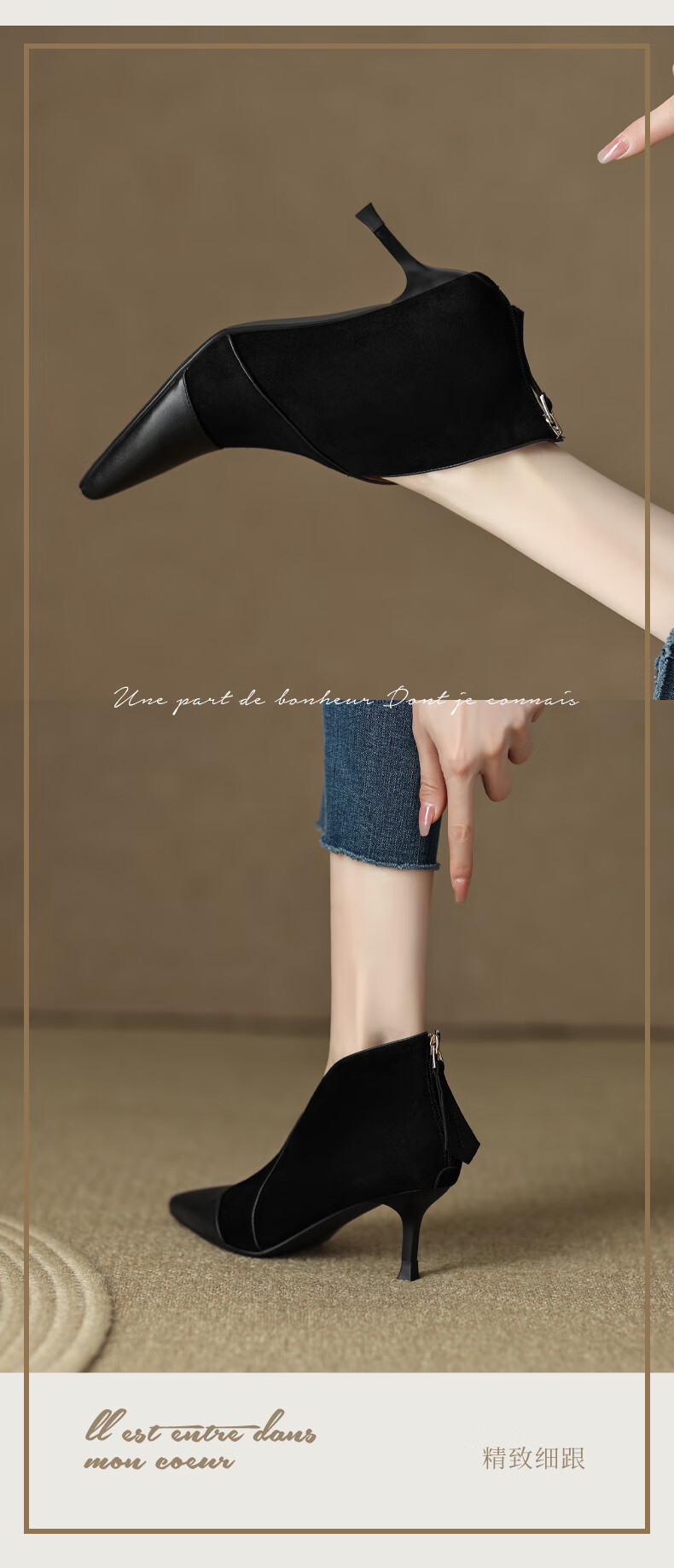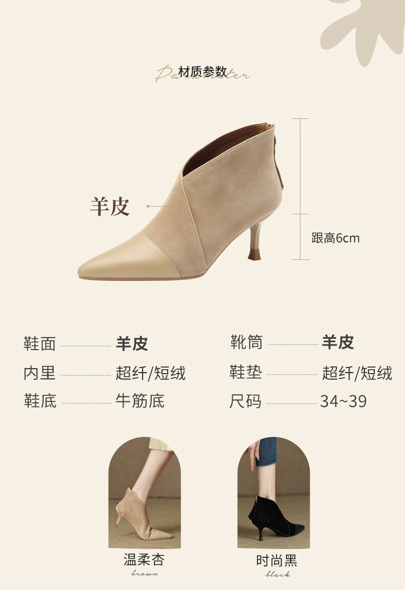 啄木鸟羊皮法式小踝靴短靴感尖头细跟单鞋小众裸色高跟鞋真皮靴子女 杏色绒里 39
