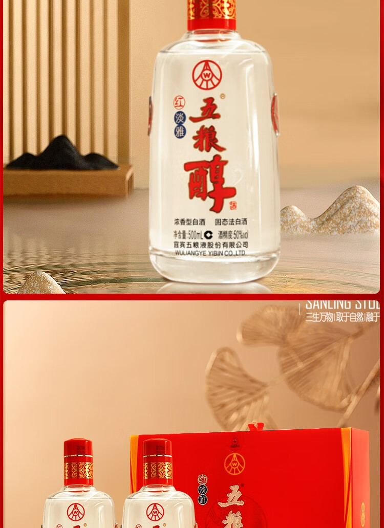 五粮液股份五粮醇红淡雅浓香型白酒50度500mL*2瓶礼盒装