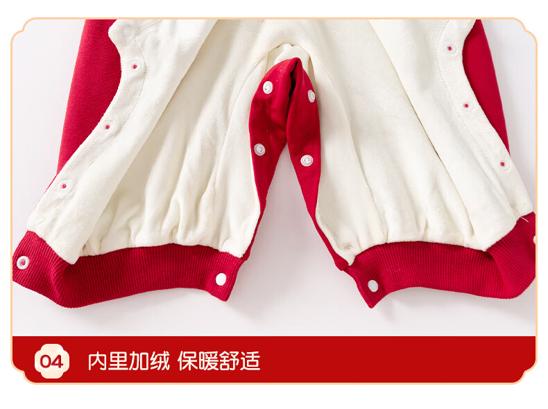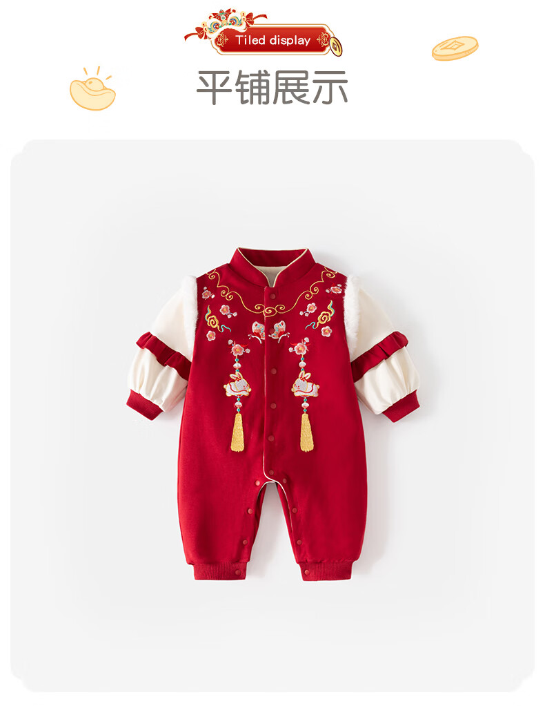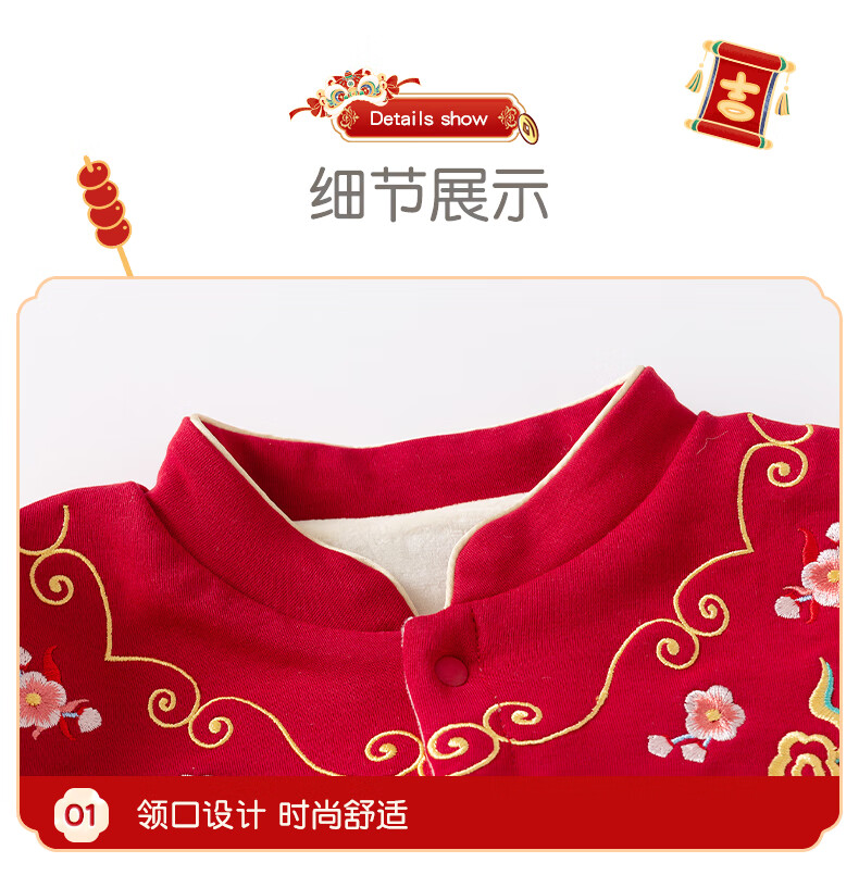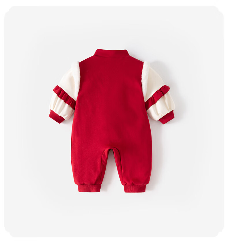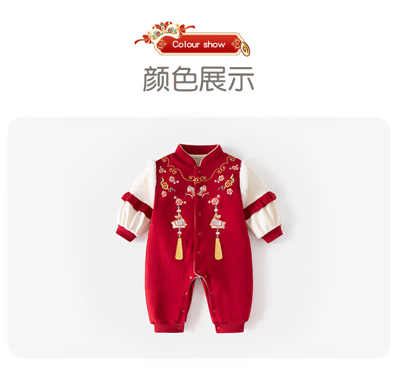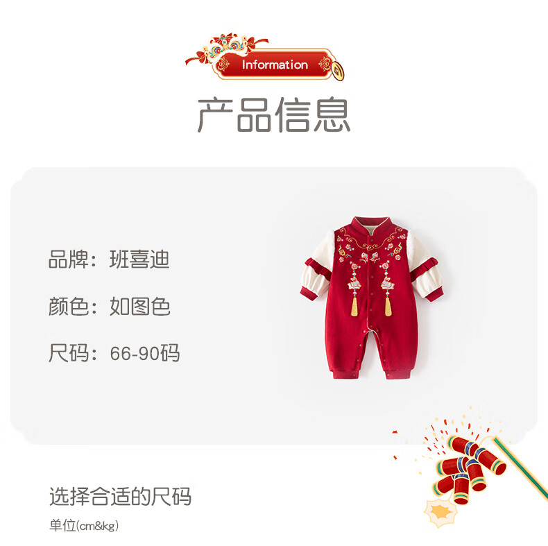 班喜迪婴儿衣服冬装婴幼儿加绒连体衣国风周岁女宝宝礼服百天过年拜年服 红色 90cm