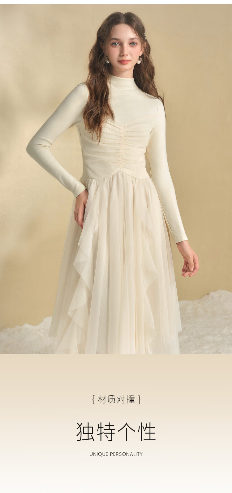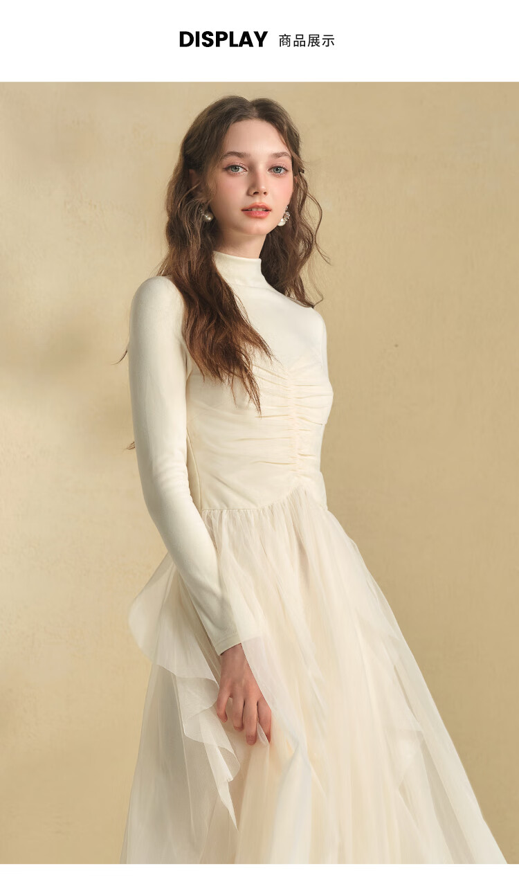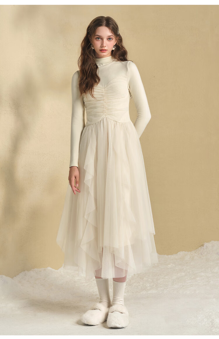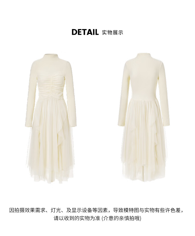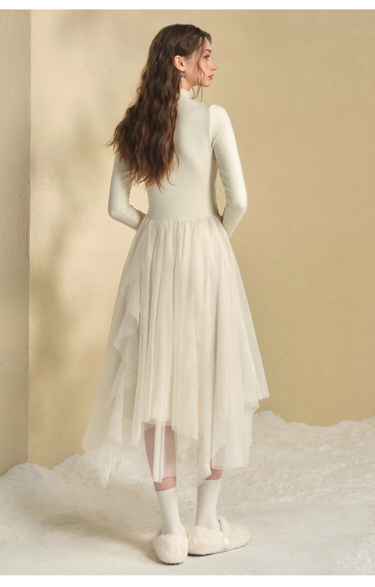 糖力商场同款秋冬季新款仙气长袖不规则网纱拼接针织连衣裙女 黄色 M