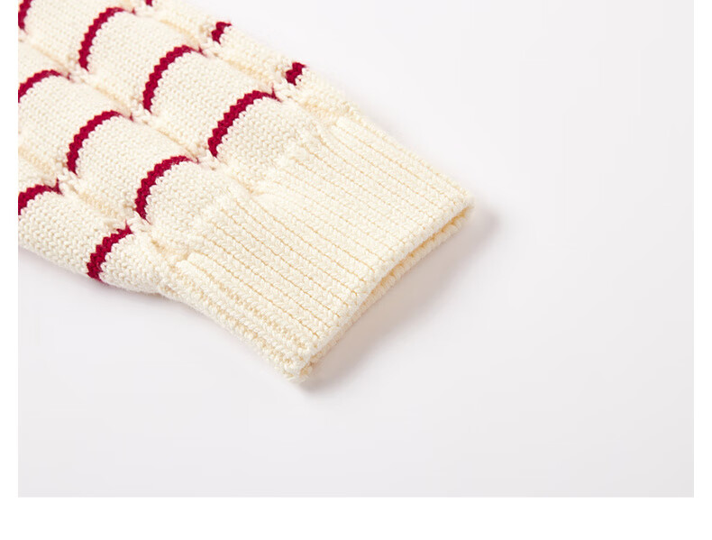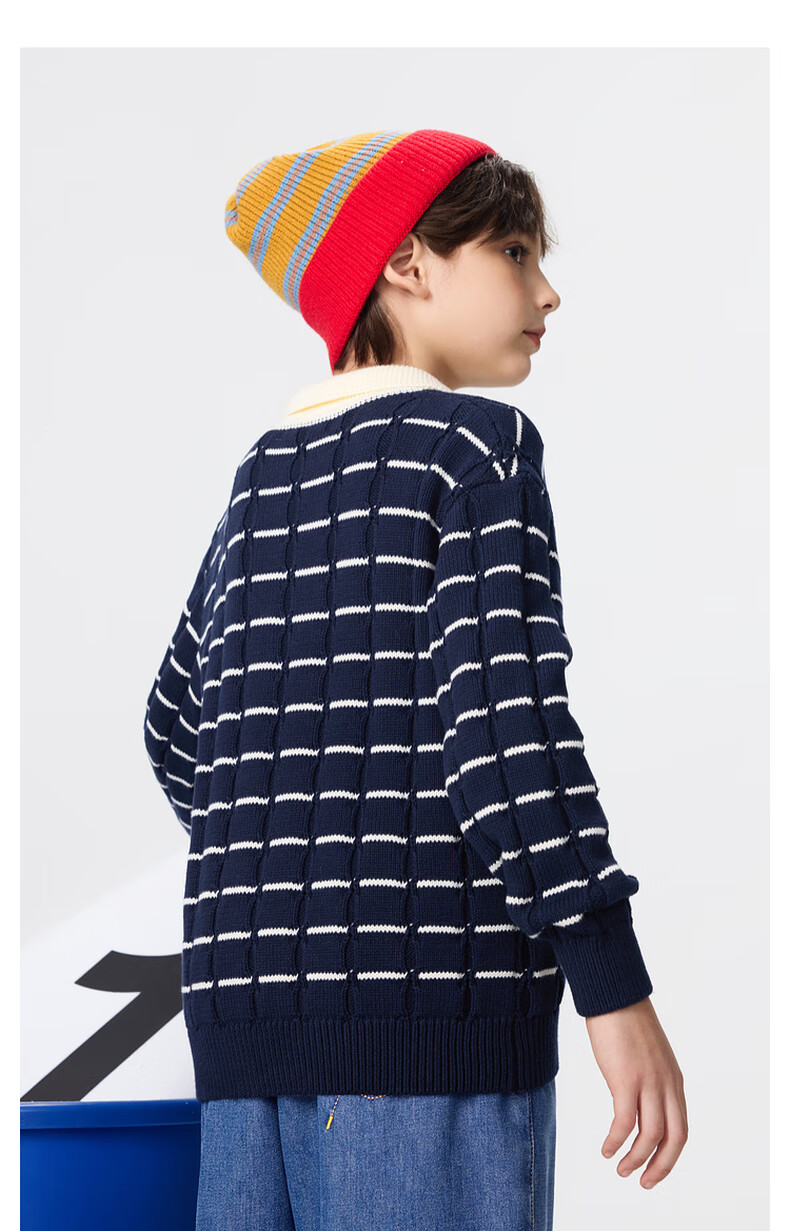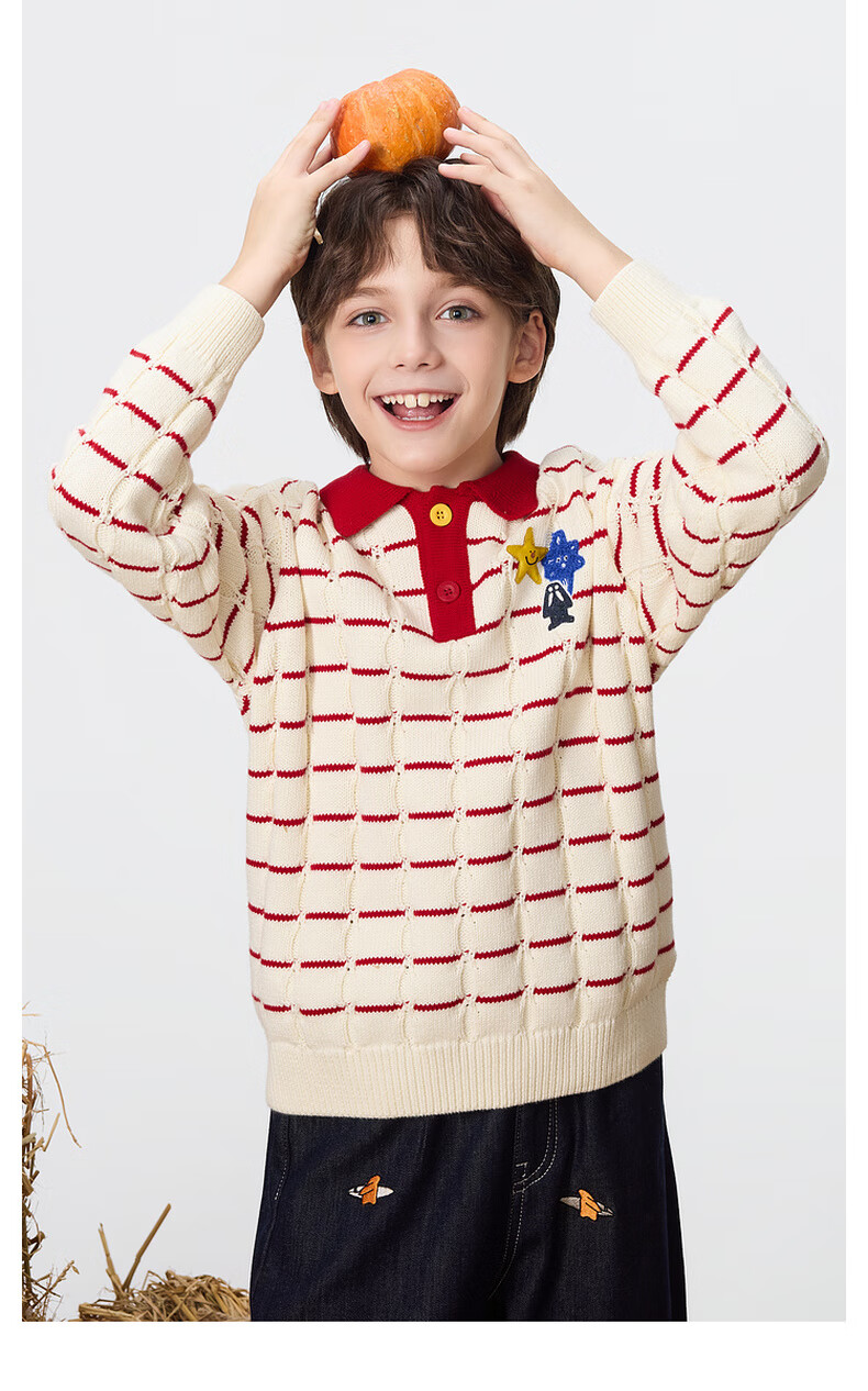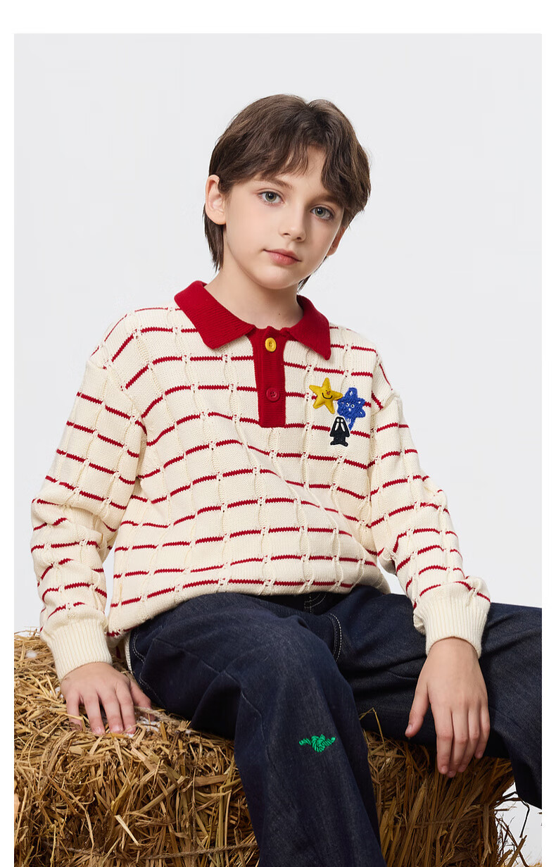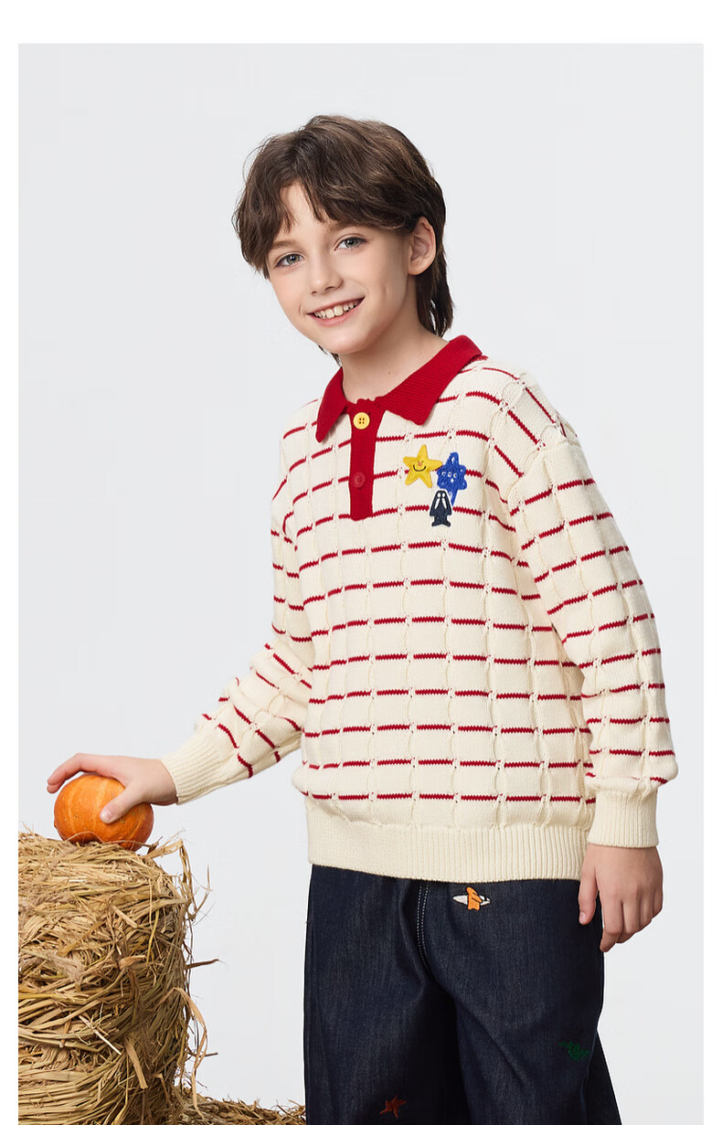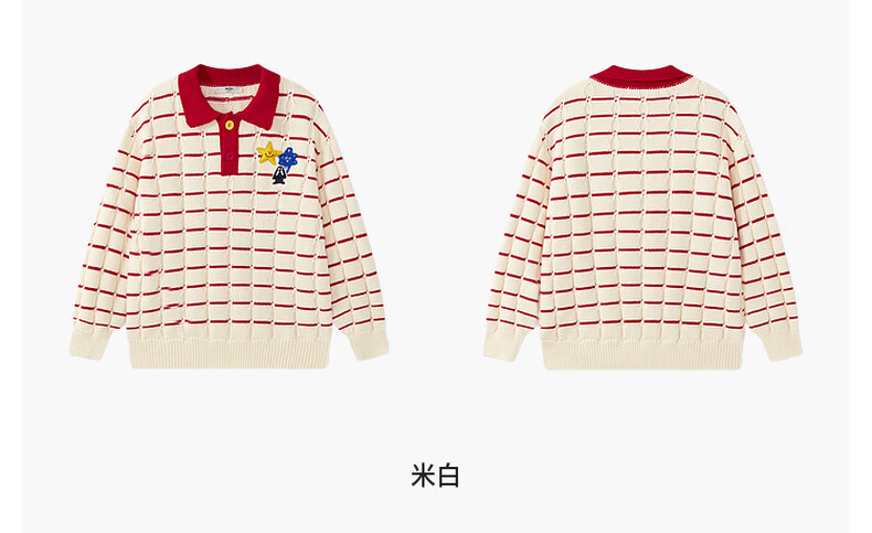 马骑顿【艺术系列】MQD男童25冬新款学院风老钱风条纹翻领毛衣 米白 140