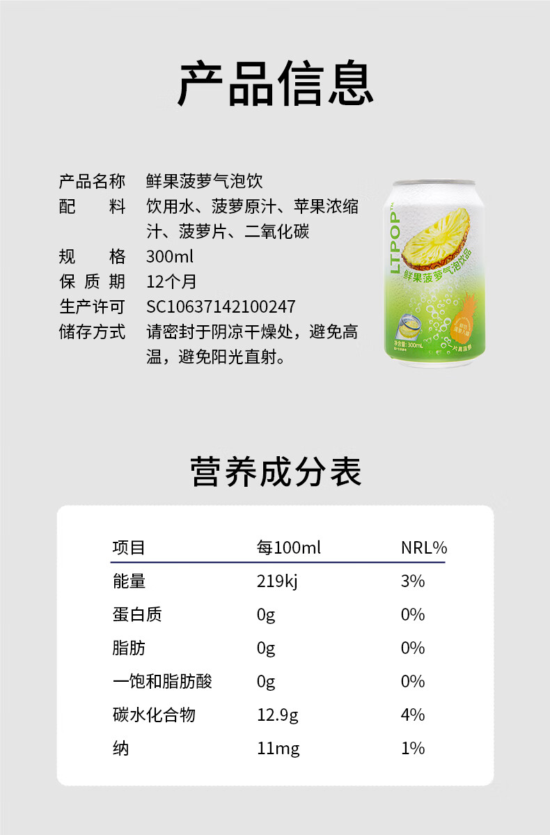 萨瑞斯一片真菠萝鲜果菠萝气泡饮300ml*4罐 清爽果汁年货囤好喝解腻饮料
