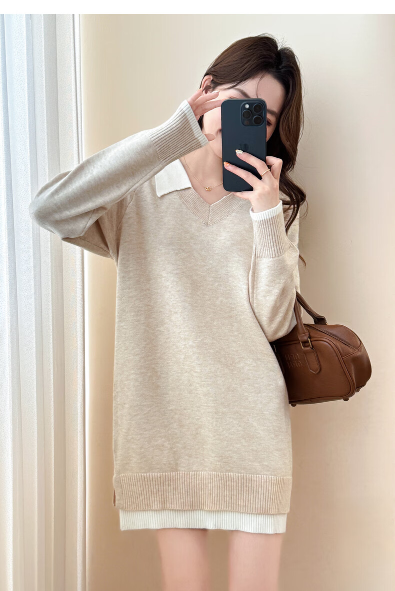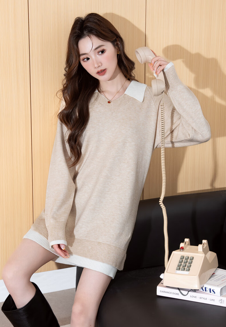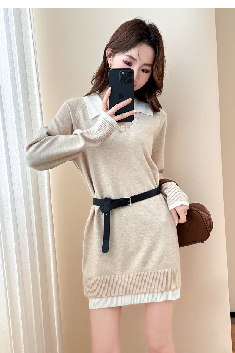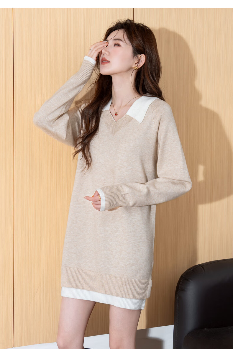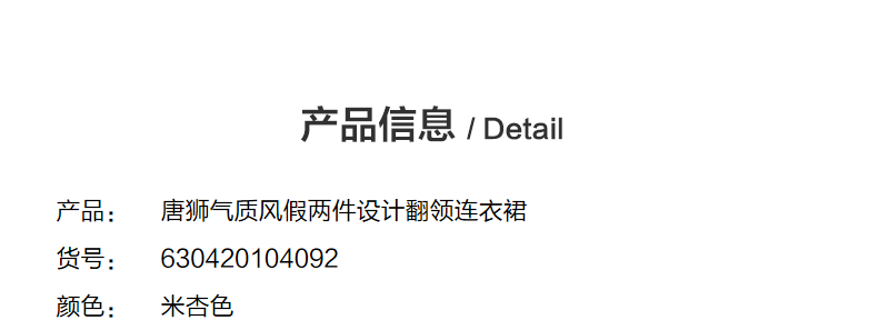 唐狮(TonLion)2025秋冬气质风假两件设计翻领连衣裙女 米杏色 S