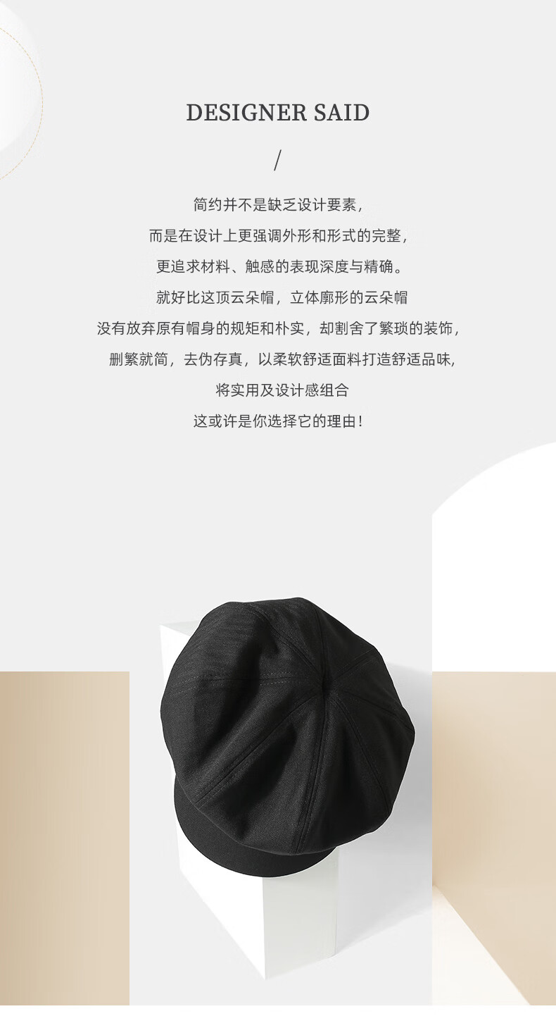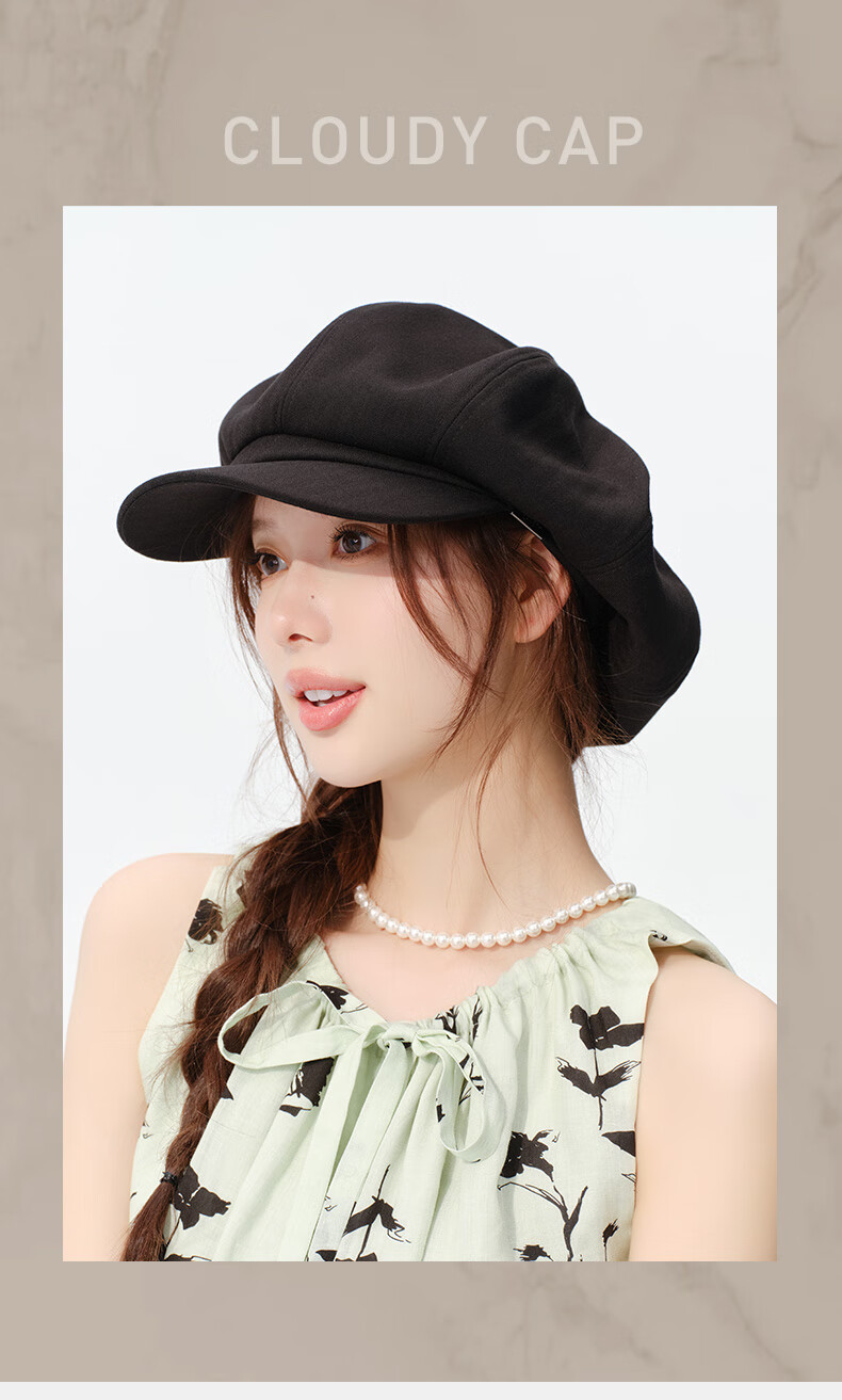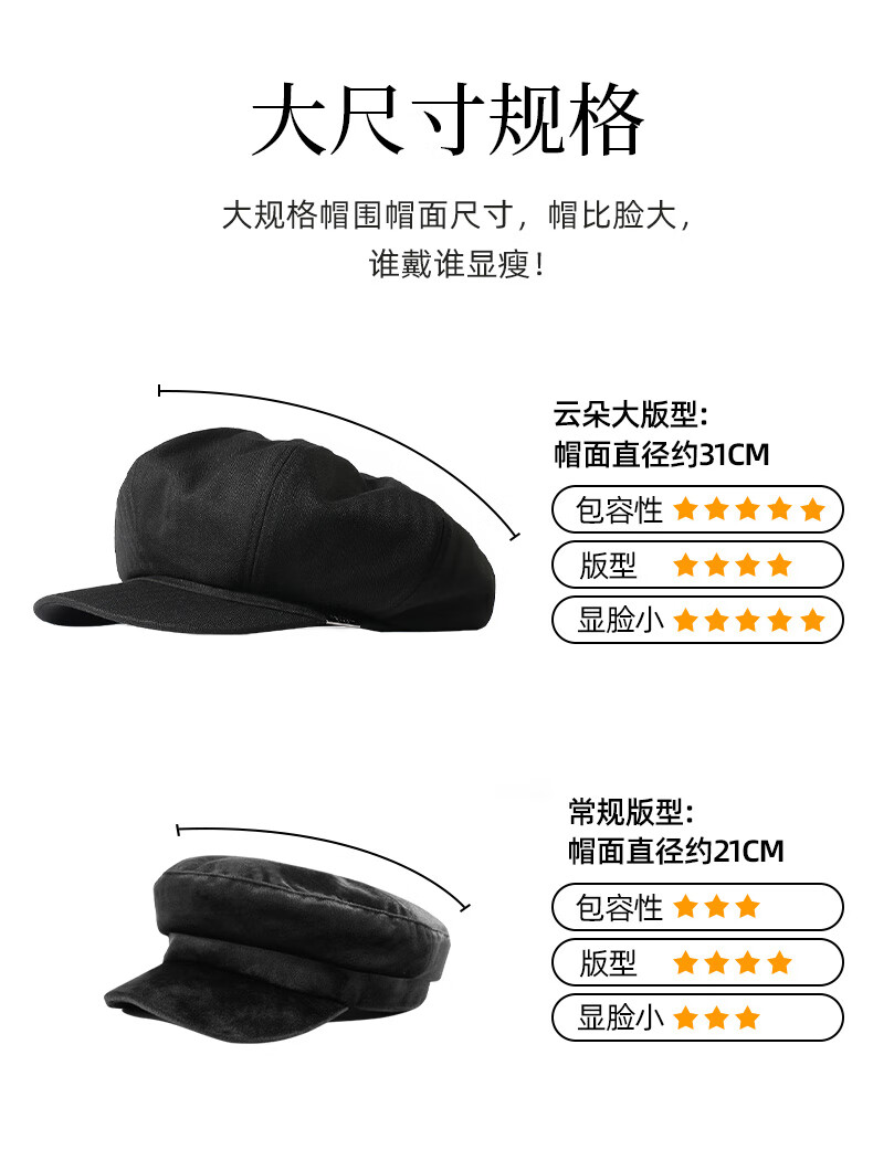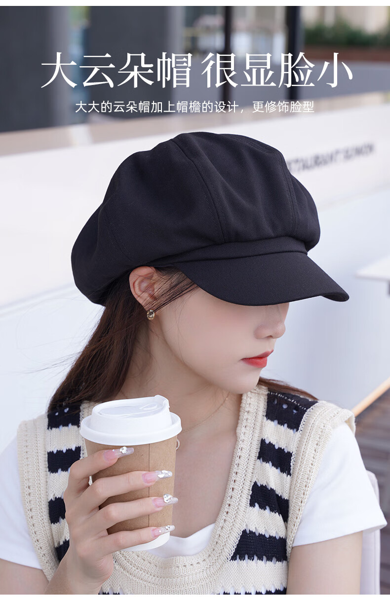 CACUSS贝雷帽女八角帽画家帽大头围云朵帽显脸小帽子女 黑色