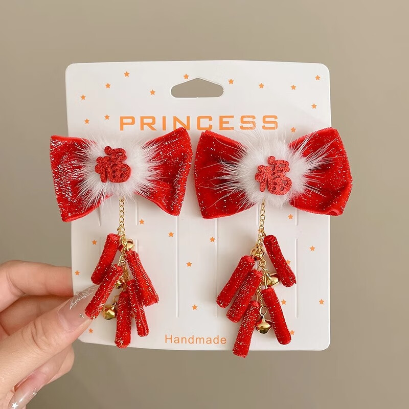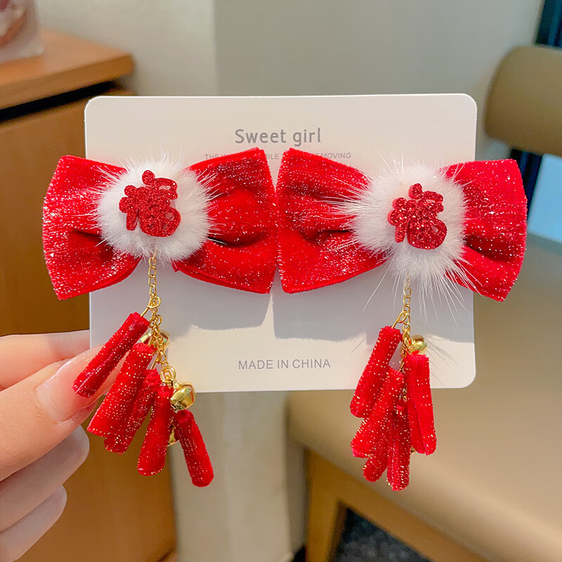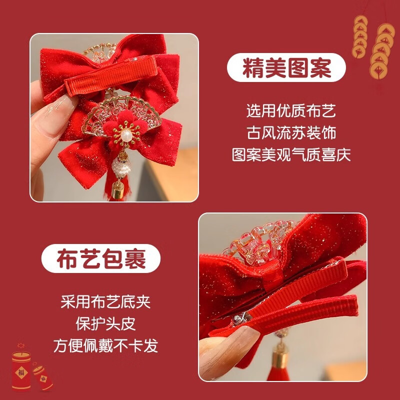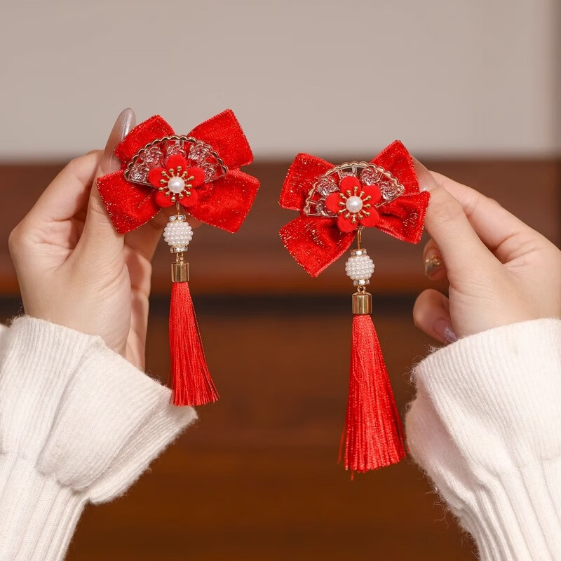捷懿新年汉服头饰女童红色蝴蝶结流苏发夹中国风过年发卡女童宝宝发饰 1对【扇子蝴蝶结珍珠流苏】5*5cm