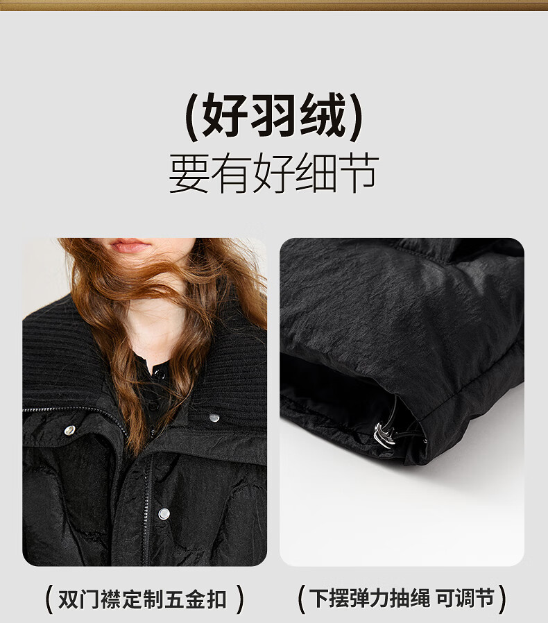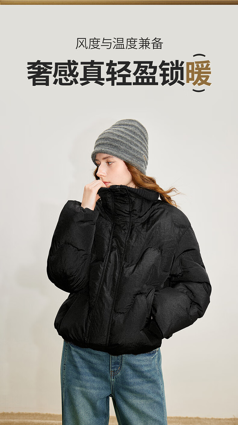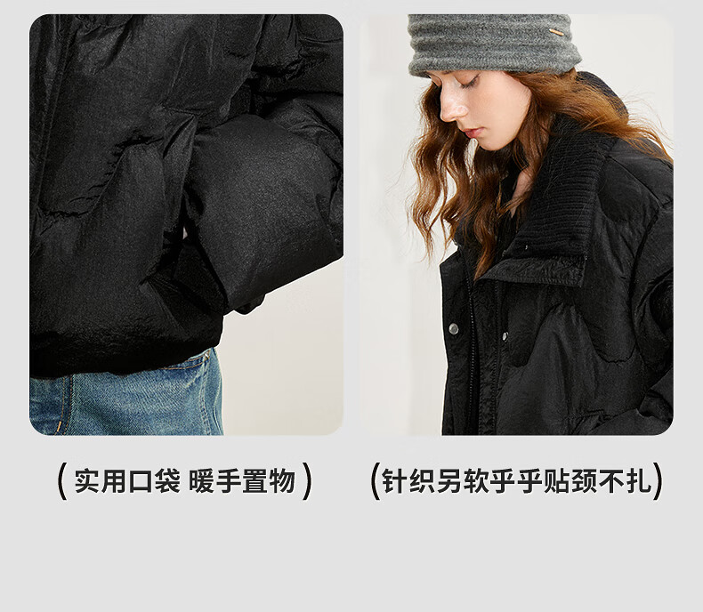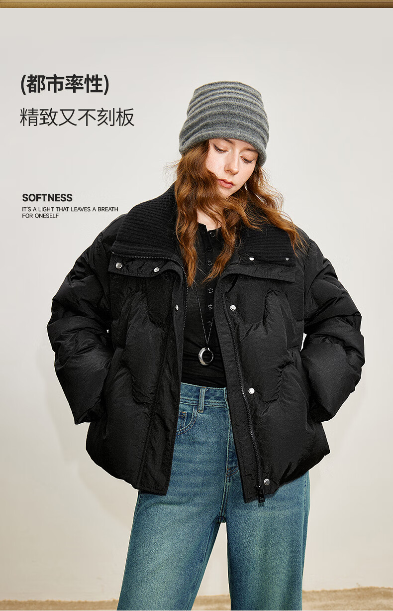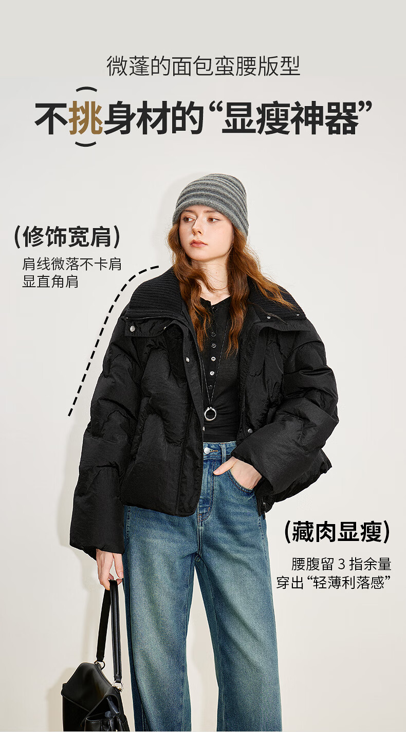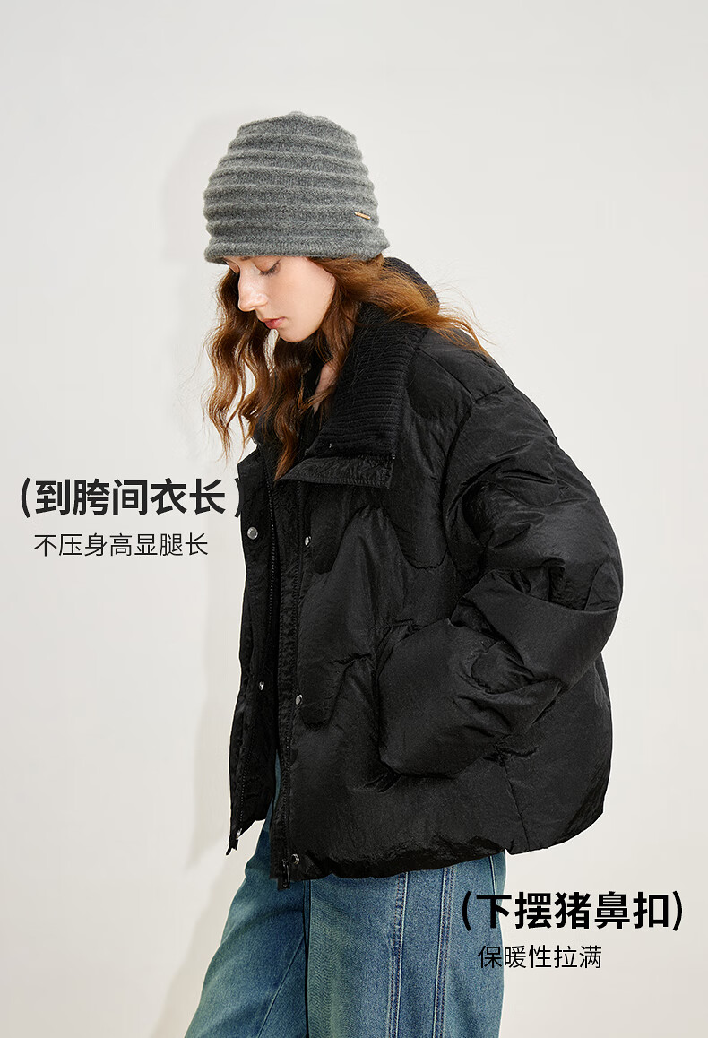初语羽绒服女2025冬季新款毛织翻领面包服90绒轻盈保暖藏蓝色外套 黑色 M