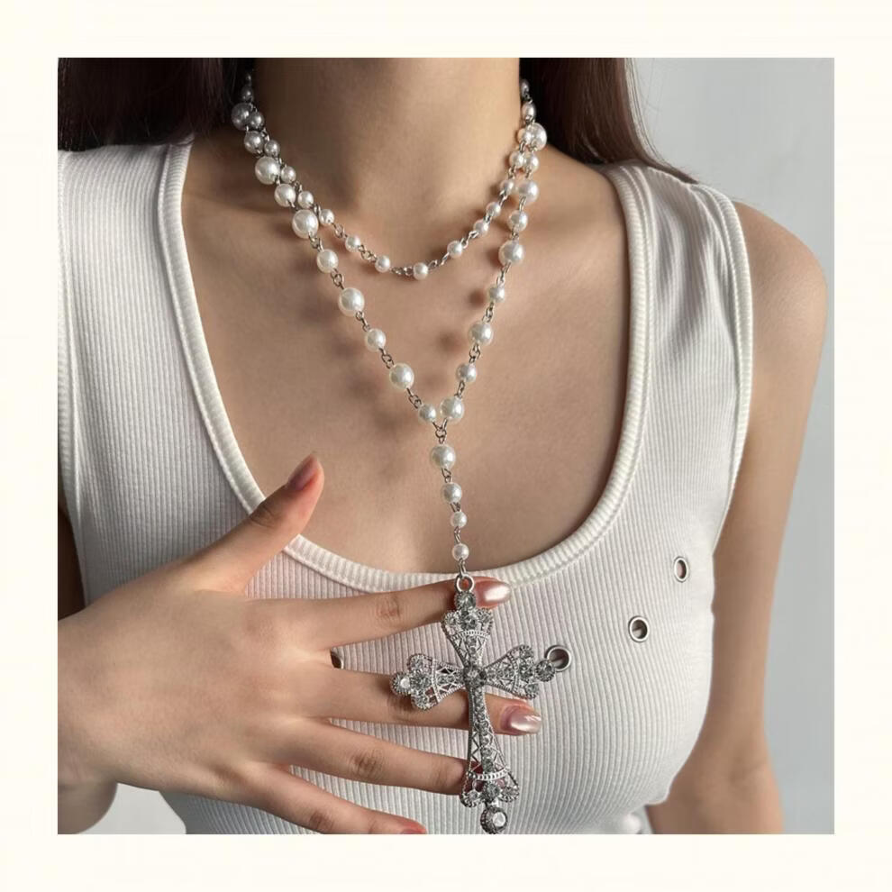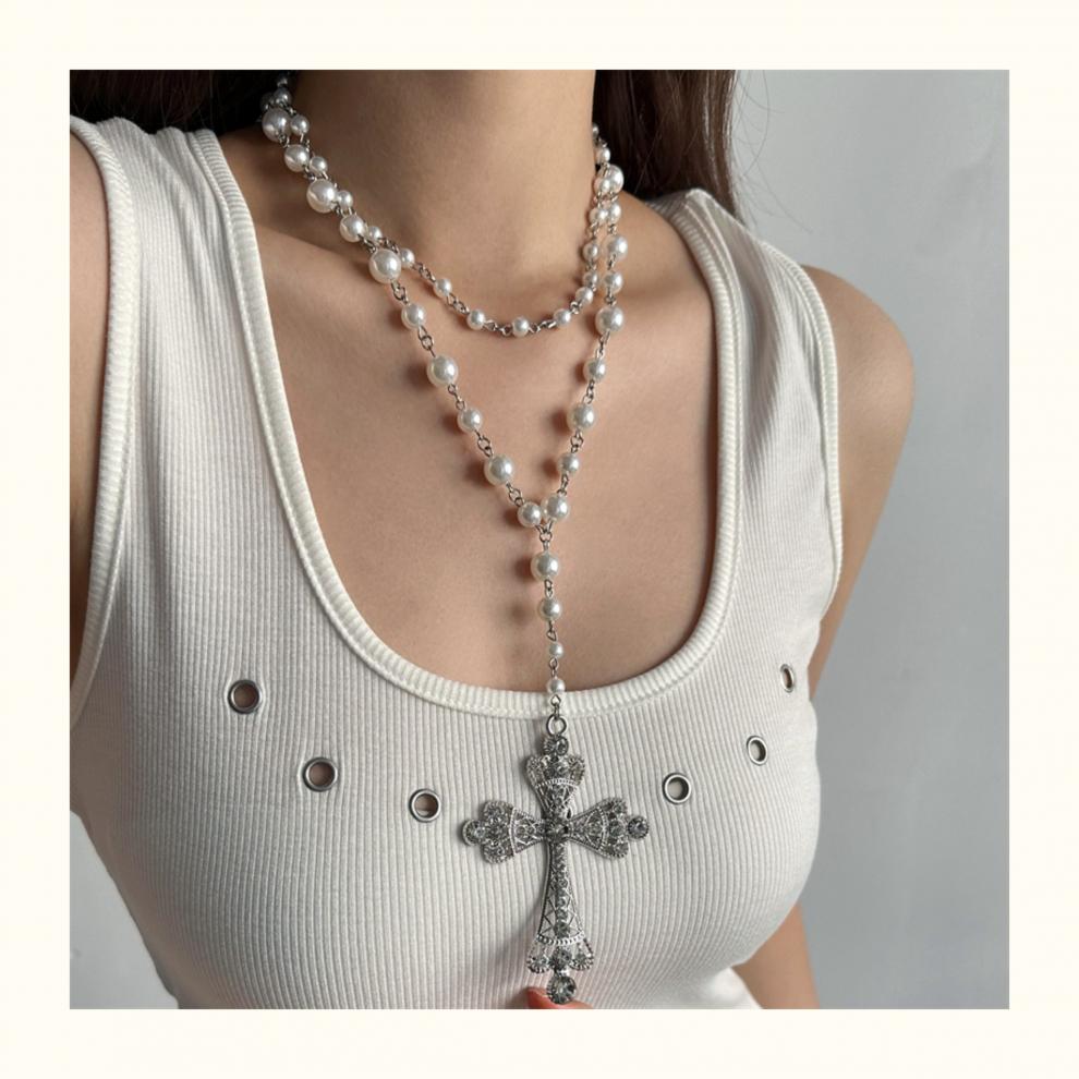D L胖东来同款珍珠项链长款珍珠十字架项链女长款毛衣链秋冬代购 白色珍珠十字架项链