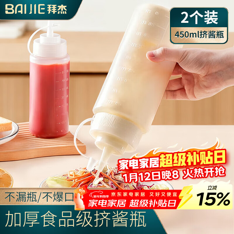 拜杰挤酱瓶食品级番茄酱沙拉挤压瓶酱料蜂蜜果酱汁壶调料瓶2个装450ml