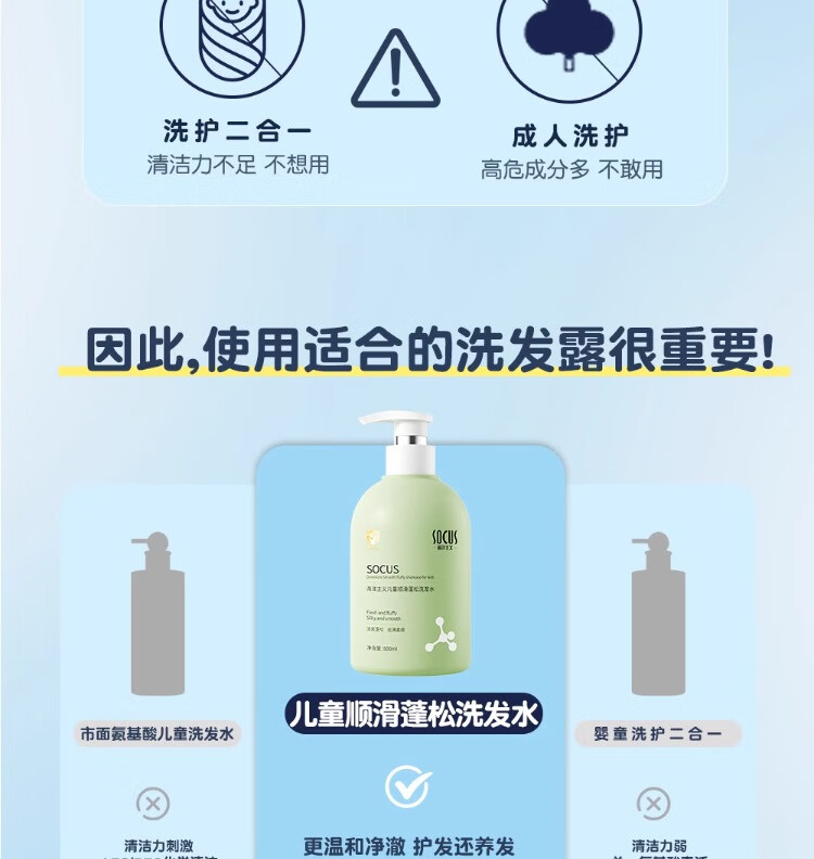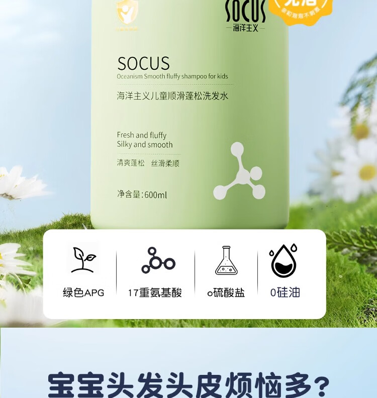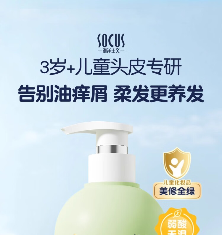 海洋主义 SOCUS儿童洗发水3-6-12岁柔顺控油止痒中大童婴儿男女宝青少年专用 【小金盾认证】600ml*2