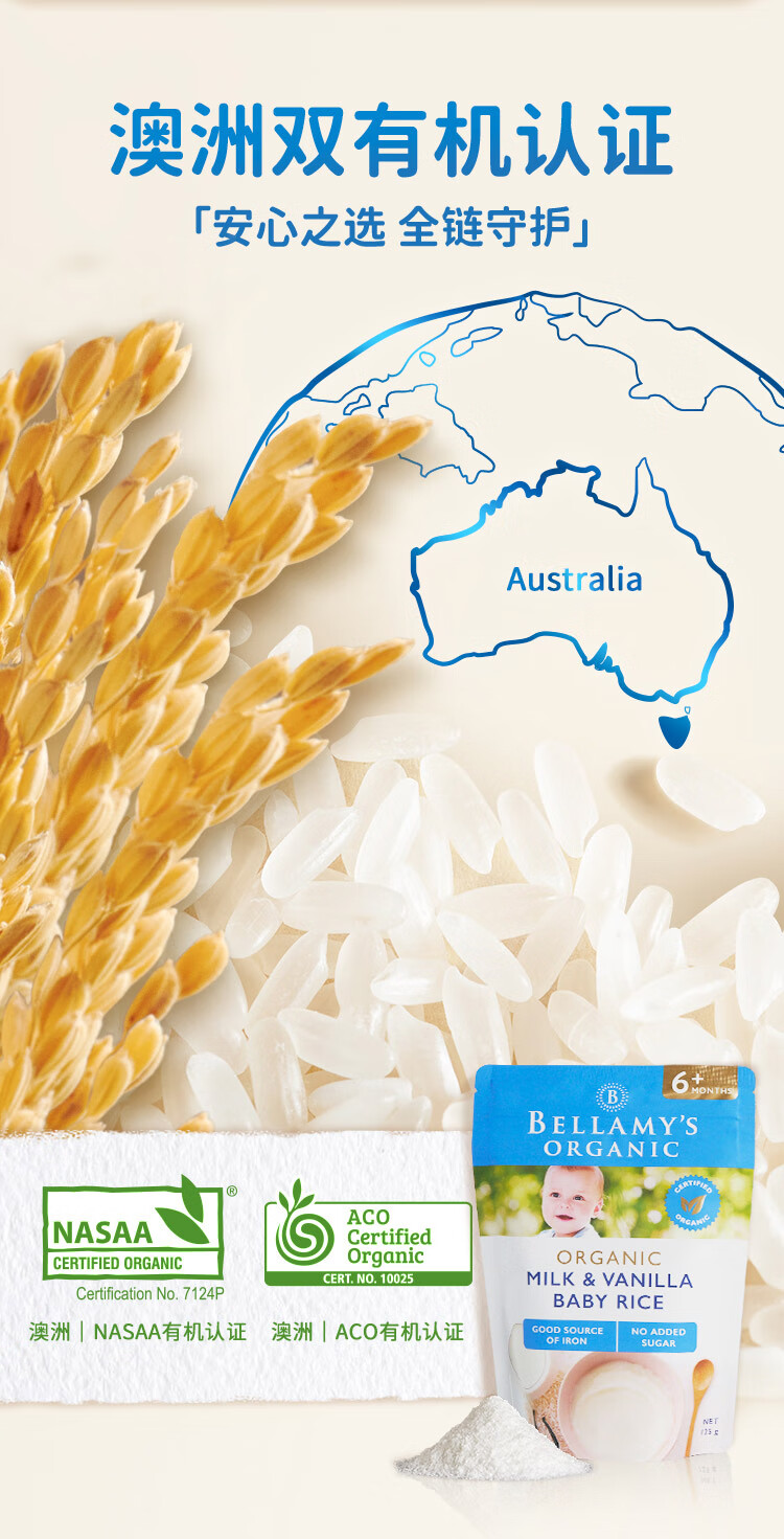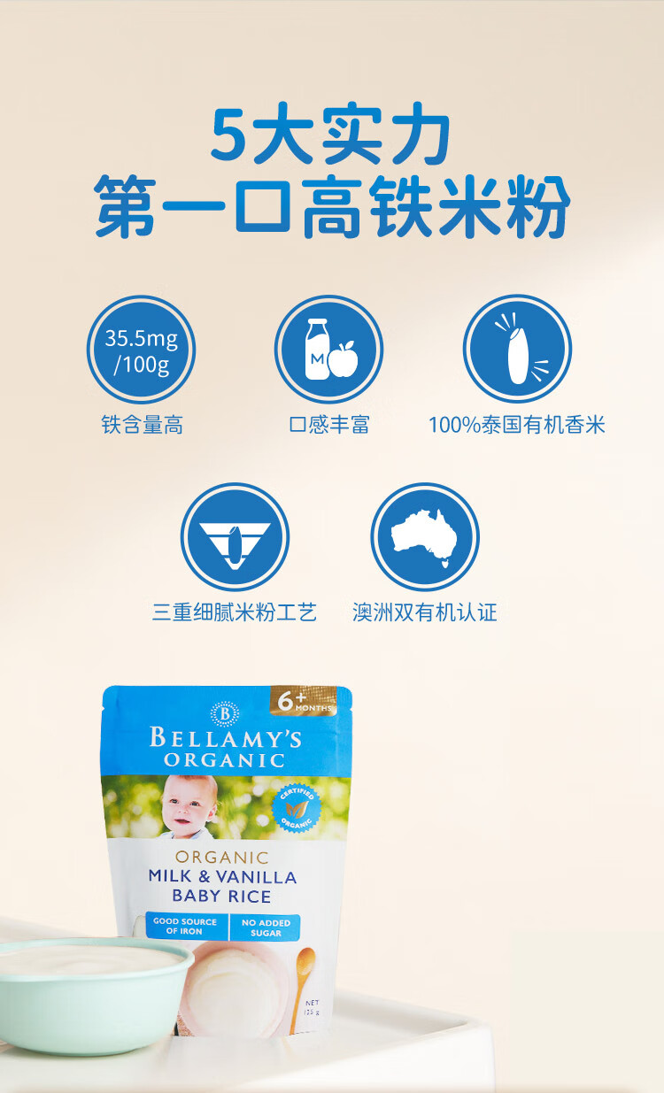 贝拉米(Bellamy's)香草高铁米粉125g 婴儿宝宝辅食 有机 6个月以上 澳洲原装进口
