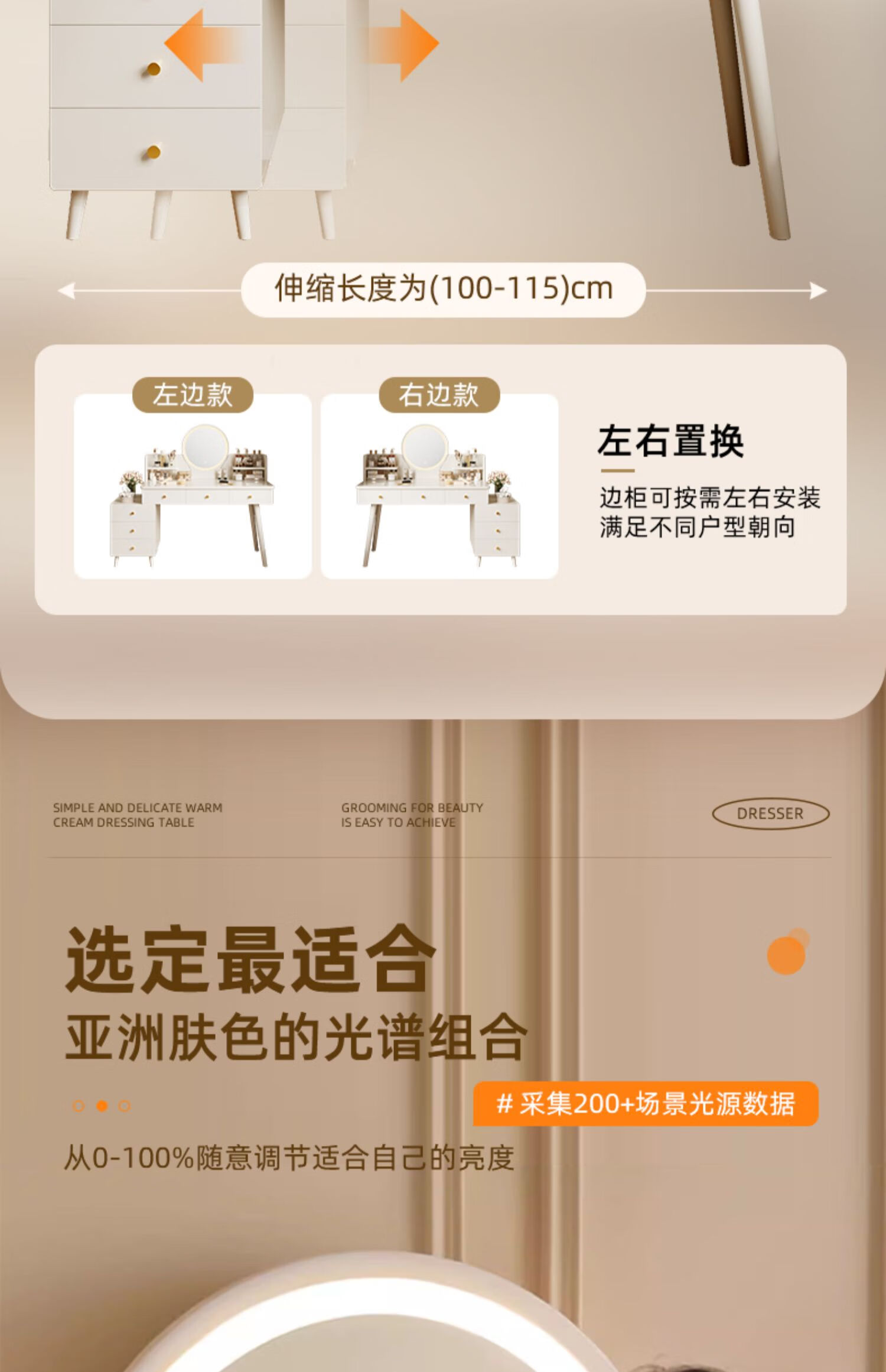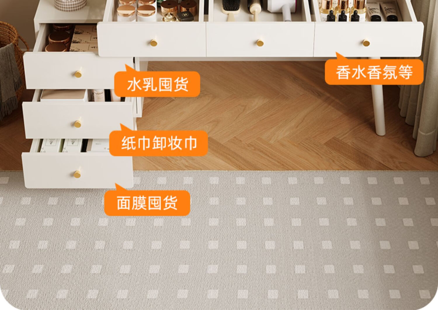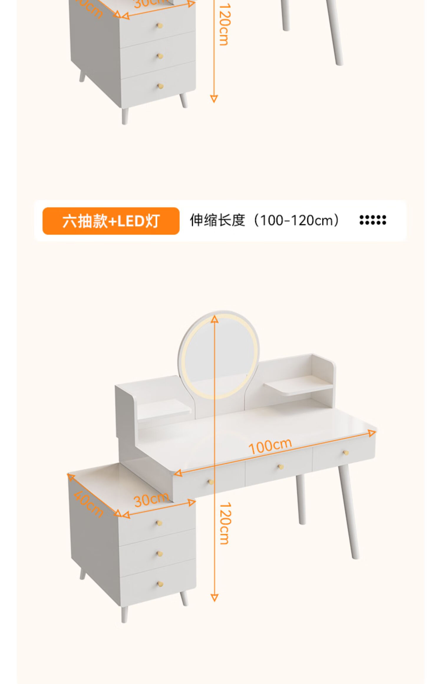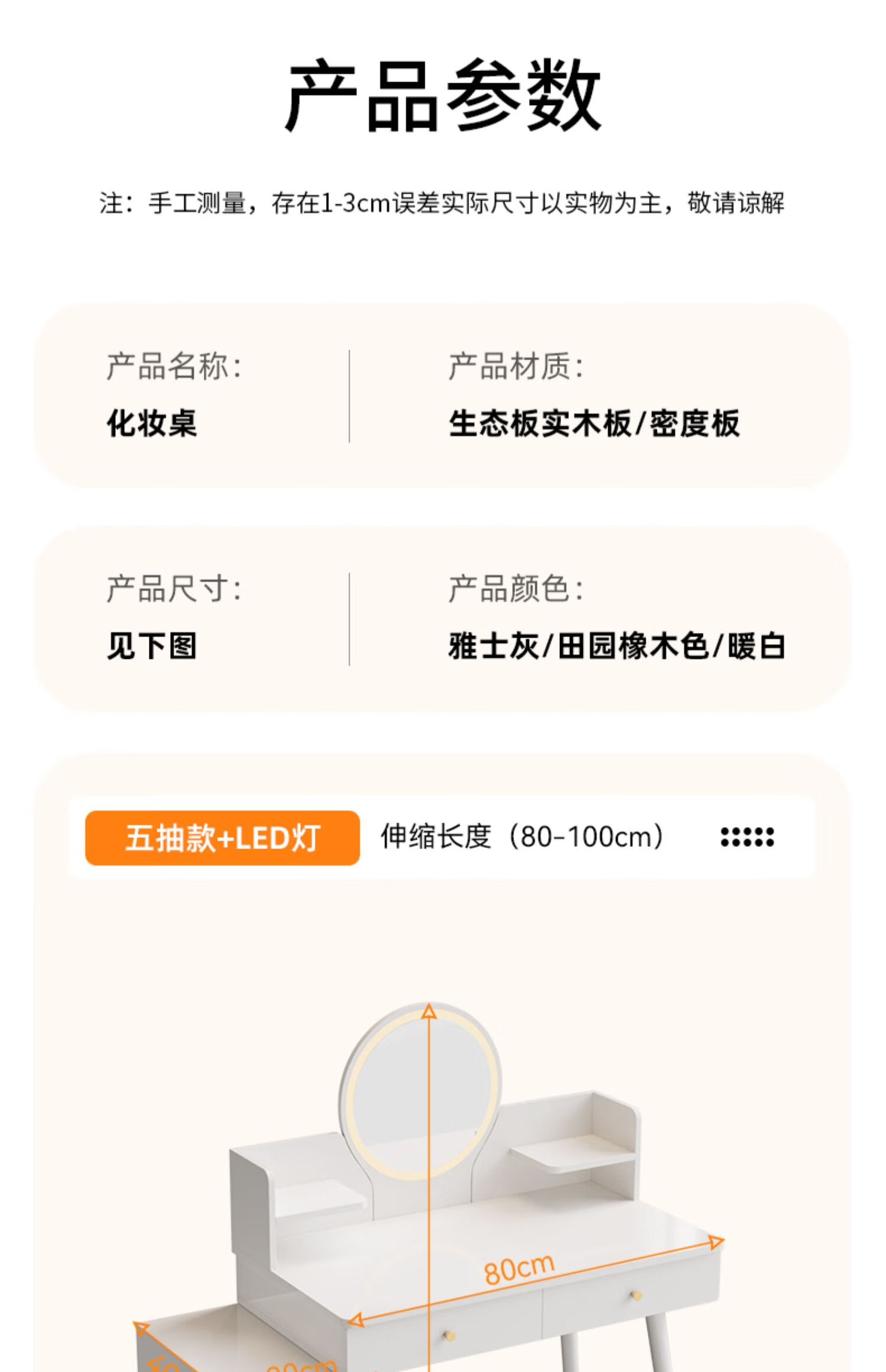 御乐欣实木梳妆台斗柜收纳一体化妆桌家用卧室可伸缩简约灯镜化妆台桌子 力荐【高密度板-单桌】五抽灰色100cm 加厚板材 3年质保