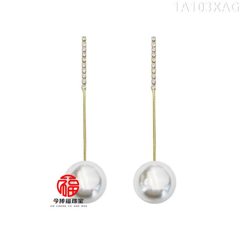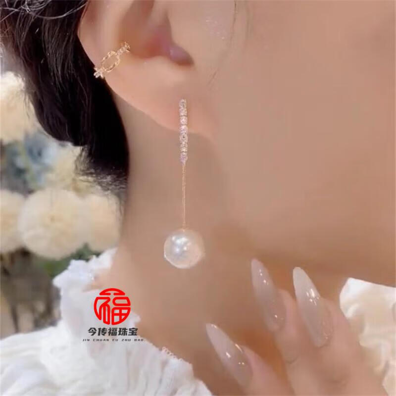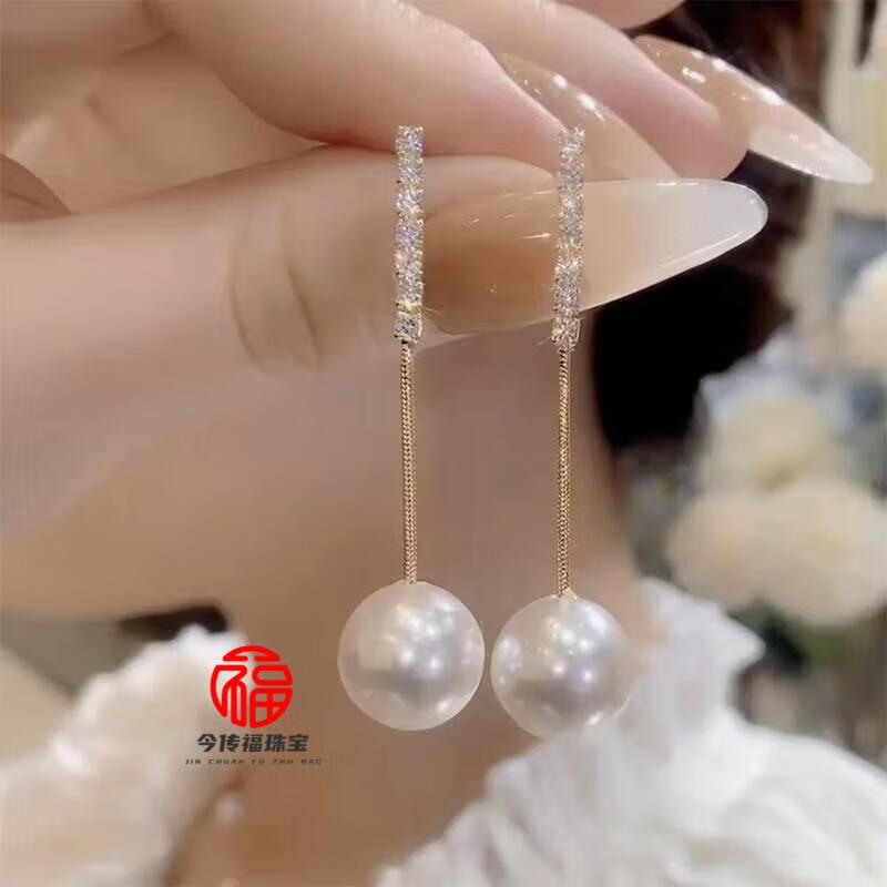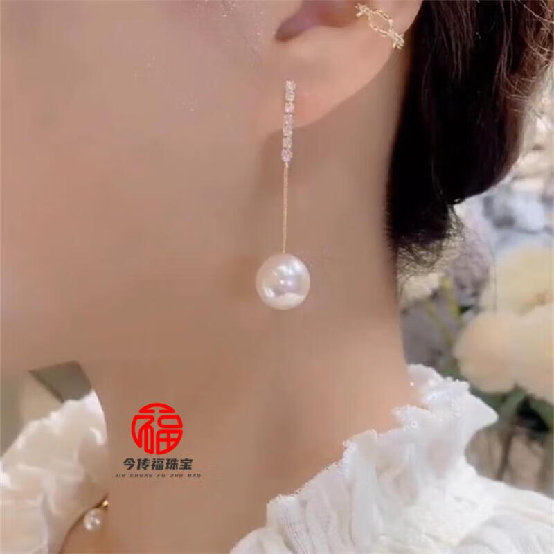 胖东来同款品质白18K金珍珠耳线镶钻耳钉耳环耳坠耳饰女配饰 148珍珠镶钻耳坠