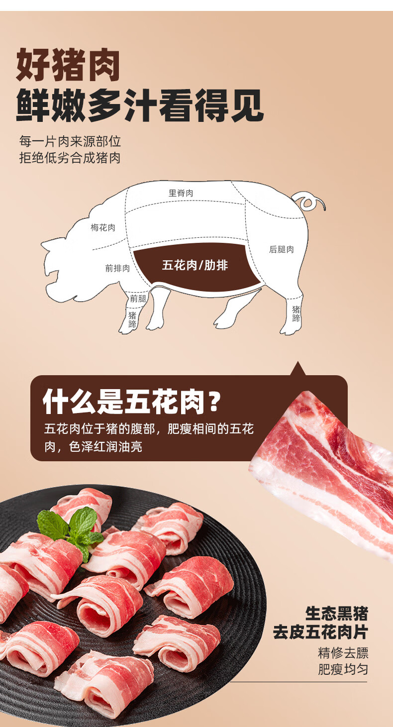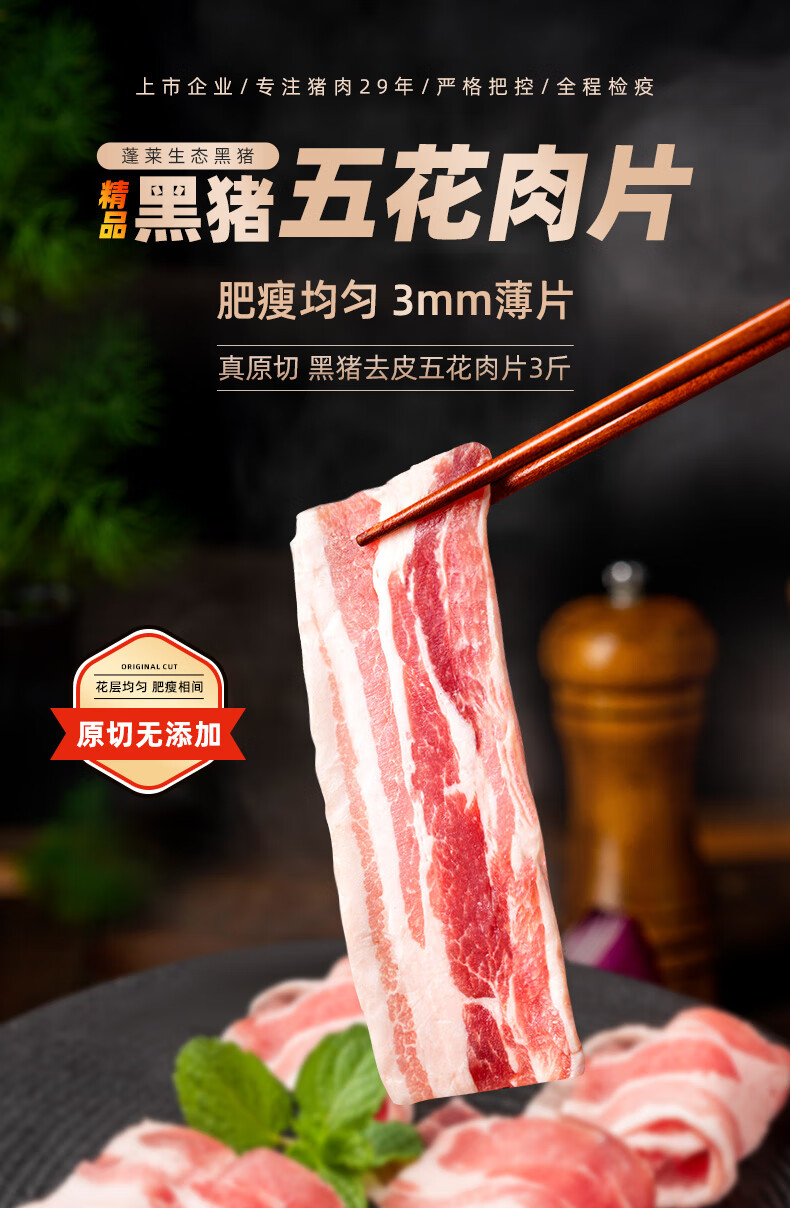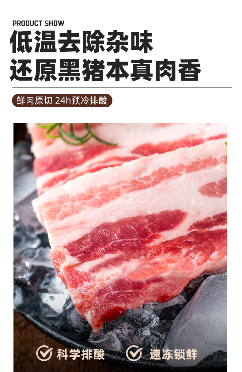 龙大肉食 黑猪去皮五花肉片净重250g*5 黑猪肉 生鲜五花肉烧烤肉 火锅食材