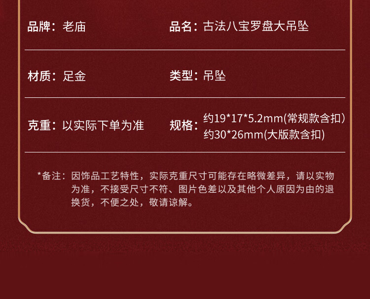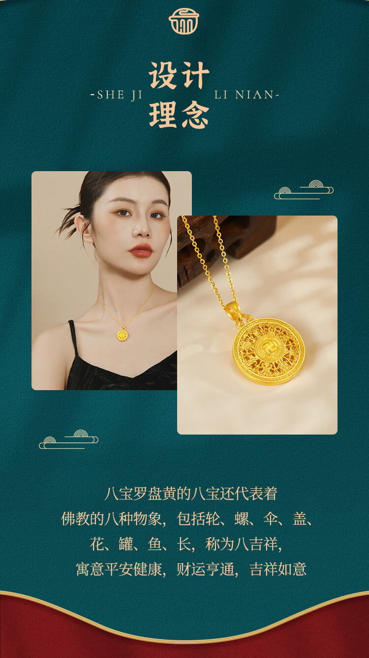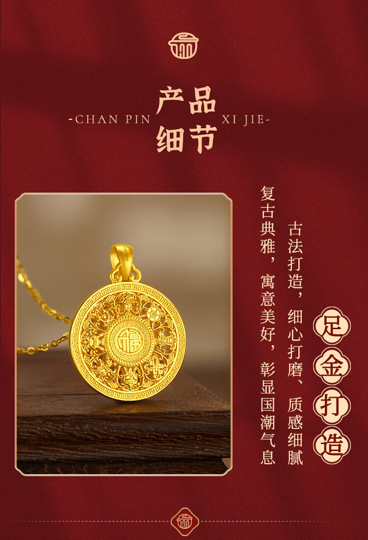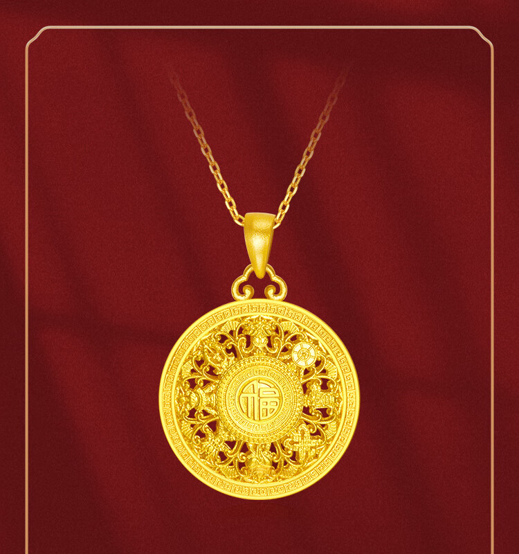 老庙黄金吊坠八宝罗盘古法金项链福字挂坠送长辈男女款情侣款节日礼物 约1g(圆扣头)