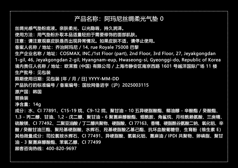 阿玛尼【明星同款】黑奢气垫#0润贴细腻遮瑕滋润秋冬 新年礼物女士
