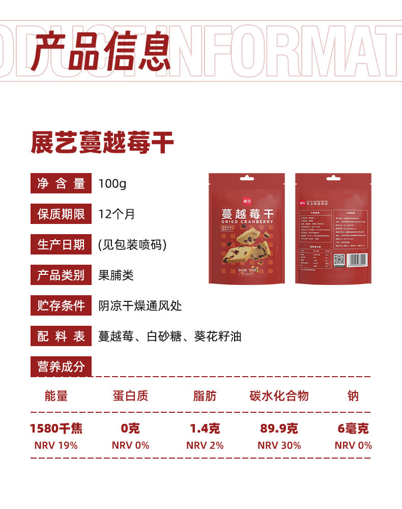 展艺蔓越莓干 雪花酥牛轧糖蜜饯果干休闲零食烘焙原料 100g