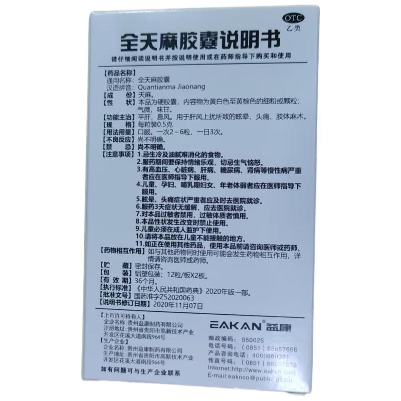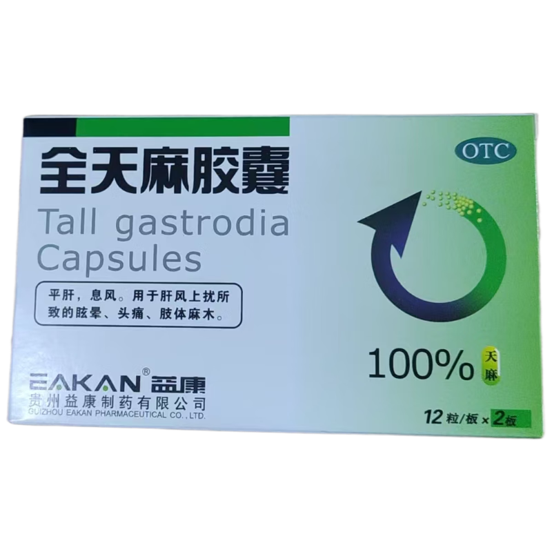 益康 全天麻胶囊 0.5g/粒*12粒/板*2板 平肝 息风 用于肝风上扰所致的眩晕 头痛 肢体麻木 科学保肝护肝