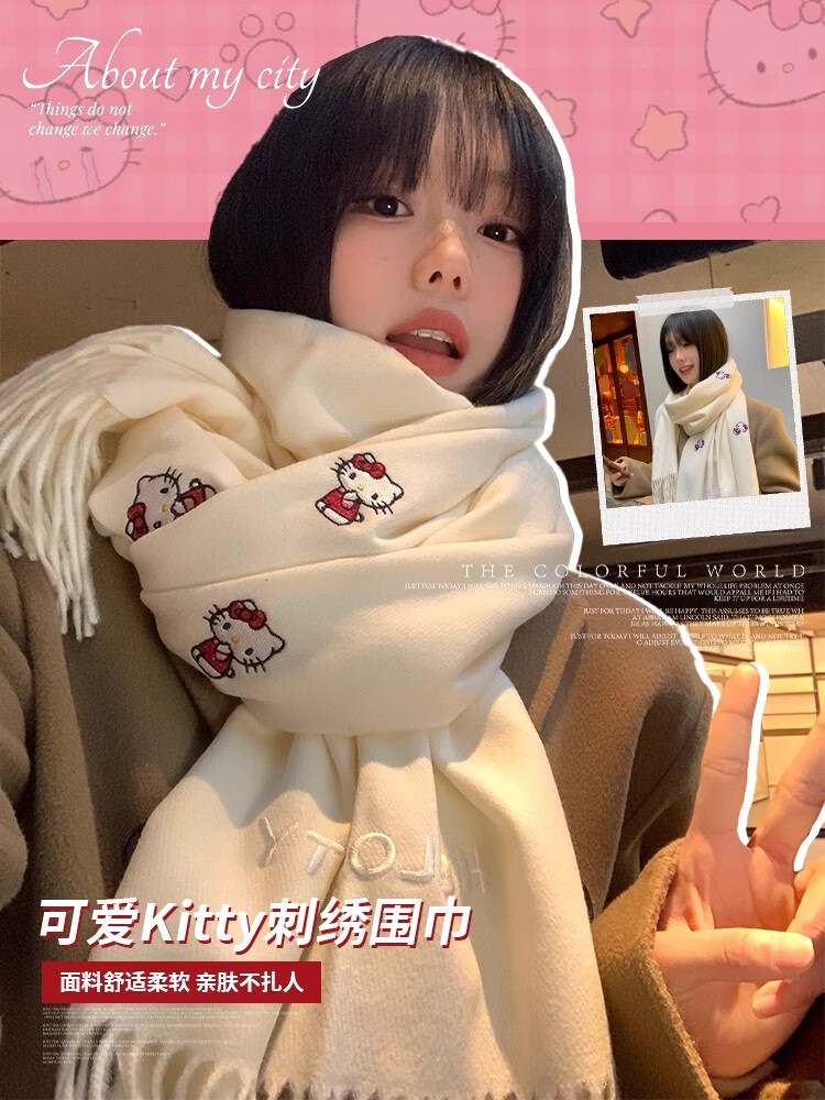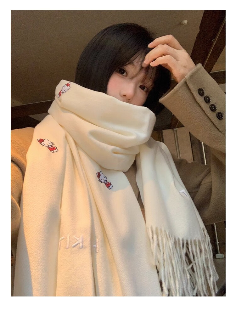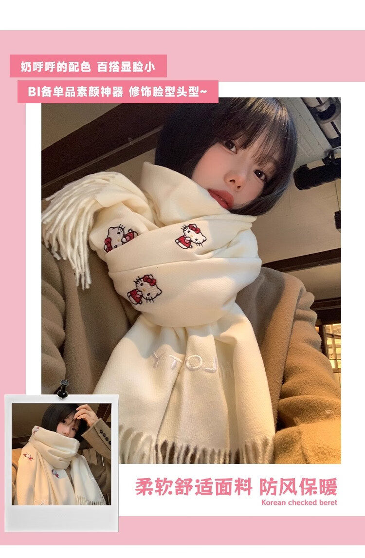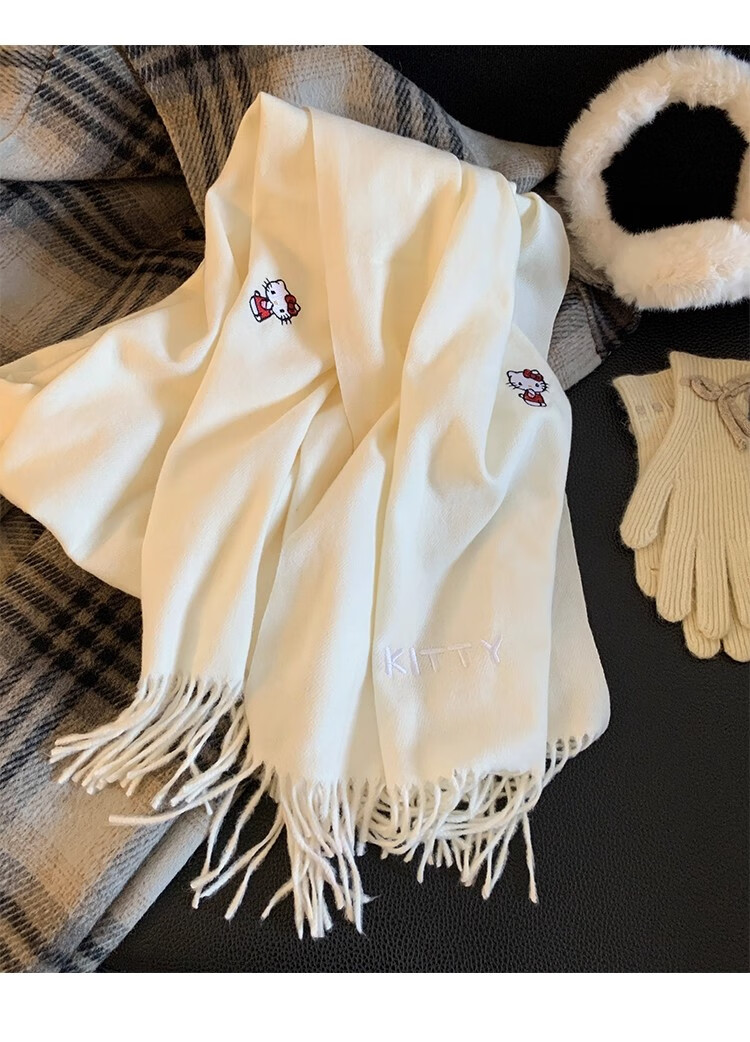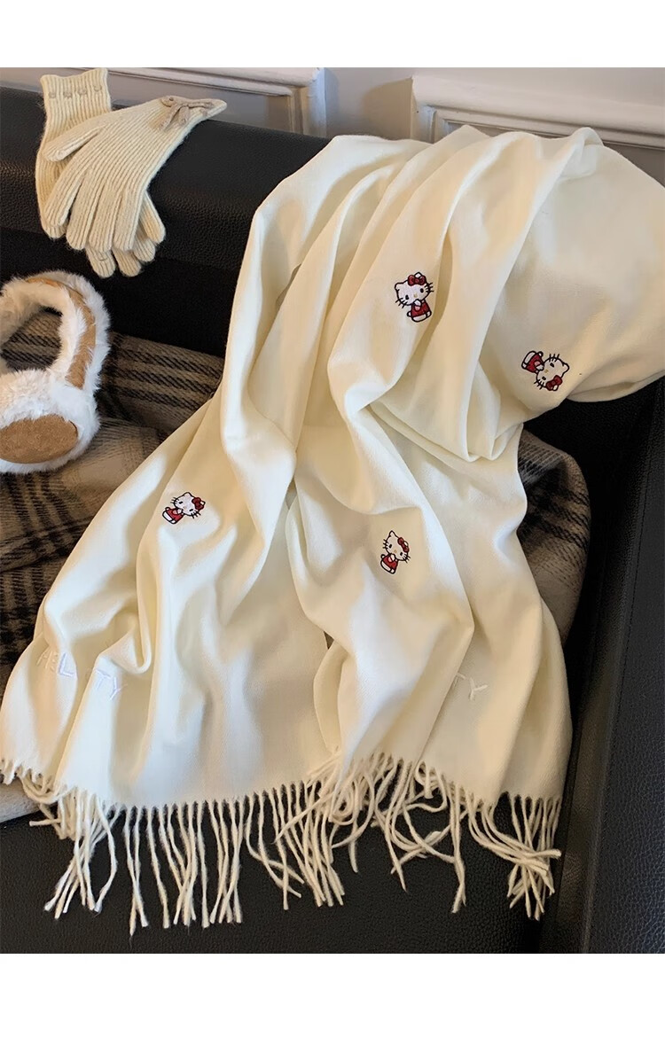 女王饰界正版授权Hellokitty刺绣仿羊绒围巾女2025年冬季保暖护颈学生围脖 Hellokitty刺绣凯蒂猫-米白色