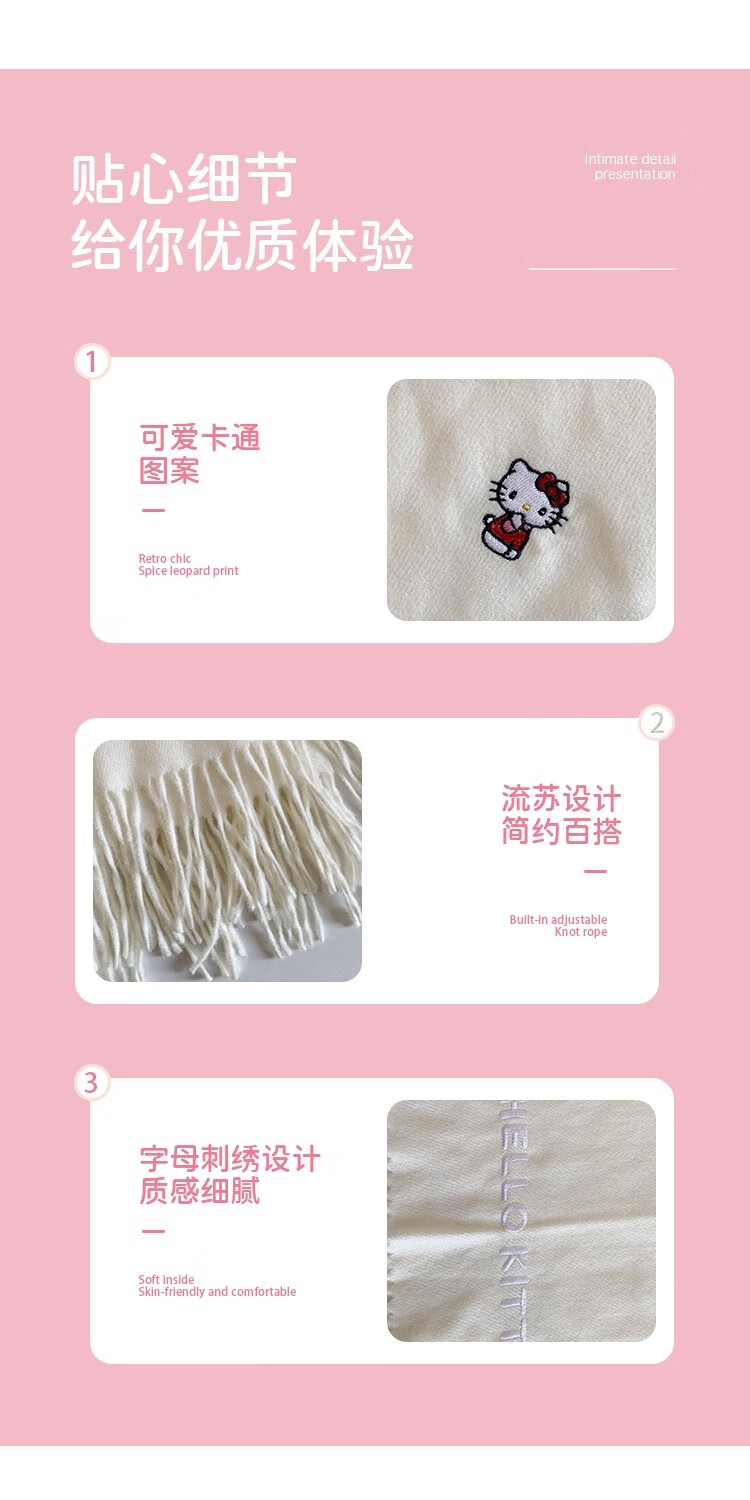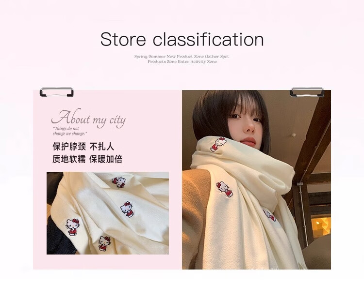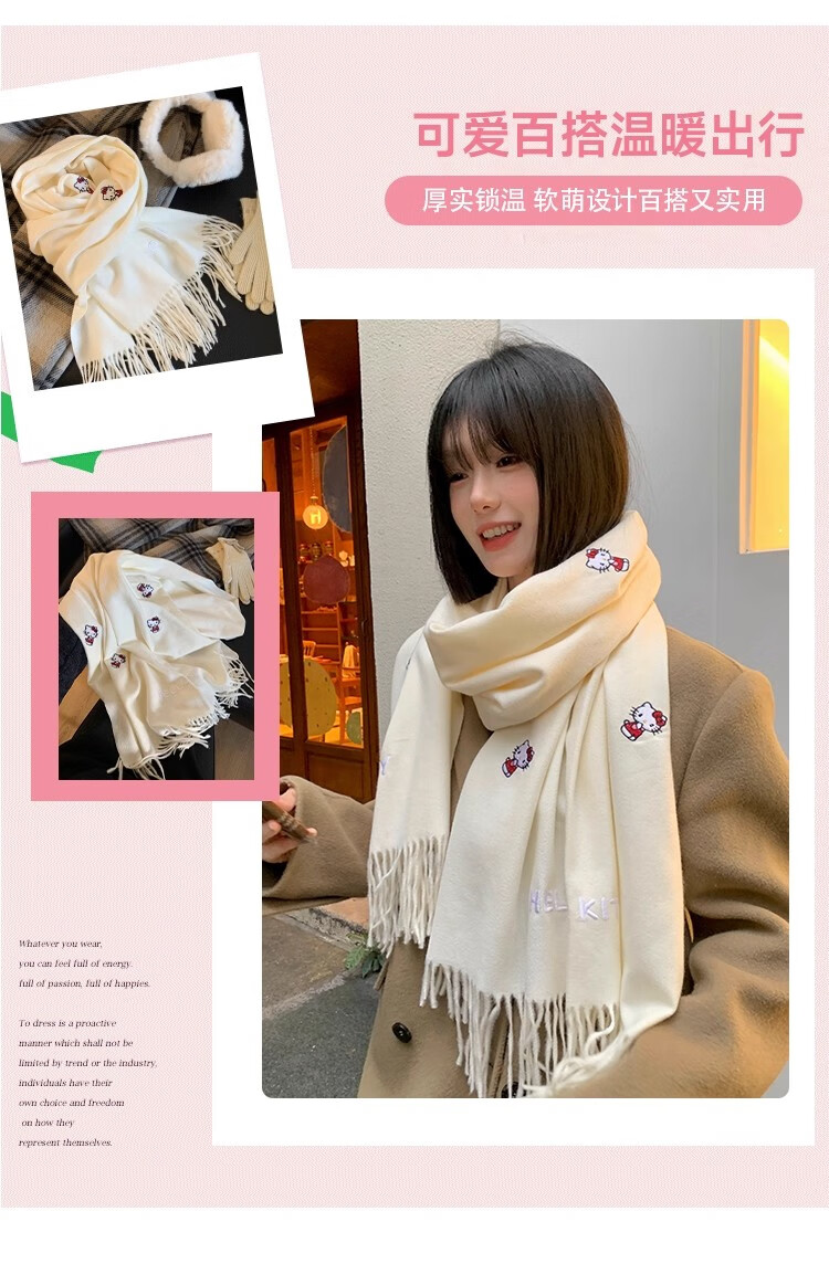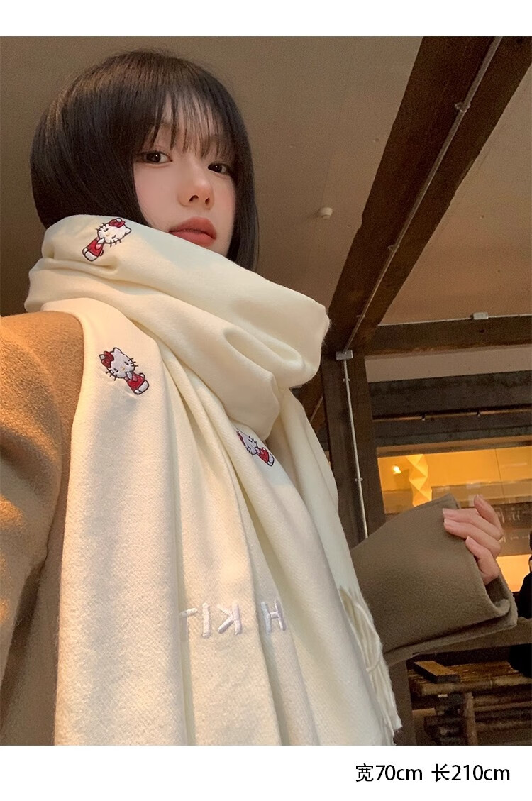 女王饰界正版授权Hellokitty刺绣仿羊绒围巾女2025年冬季保暖护颈学生围脖 Hellokitty刺绣凯蒂猫-米白色