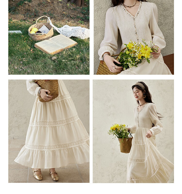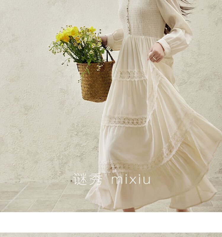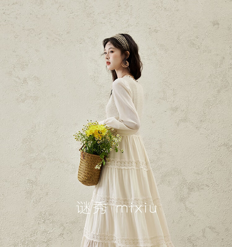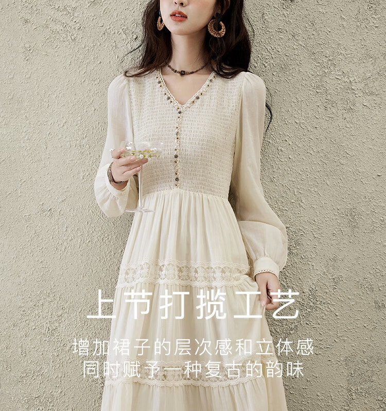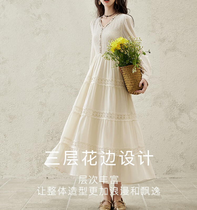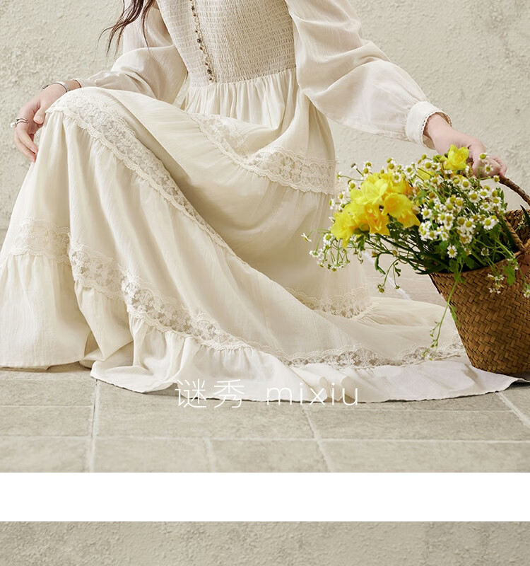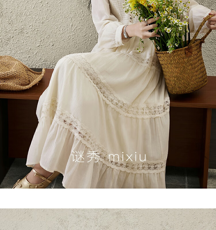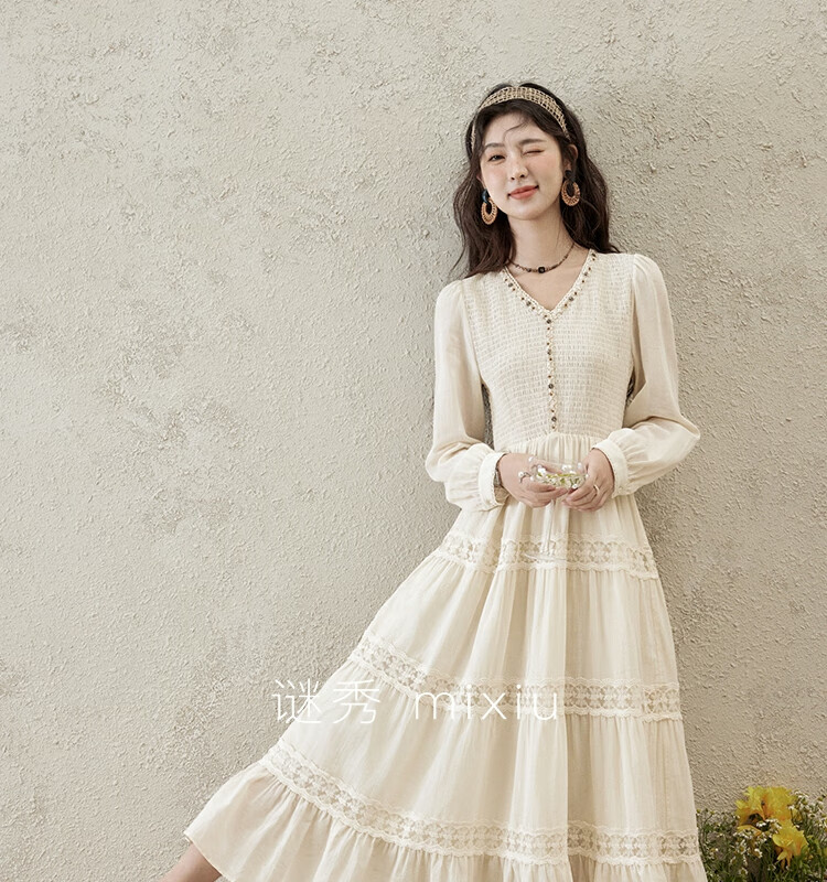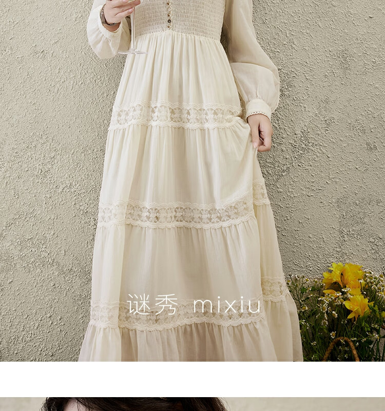 谜秀杏色连衣裙女2025春夏季花边蕾丝拼接复古收腰显瘦度假风长裙 奶糖杏 长款 M