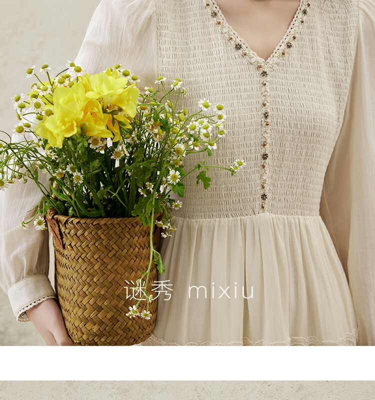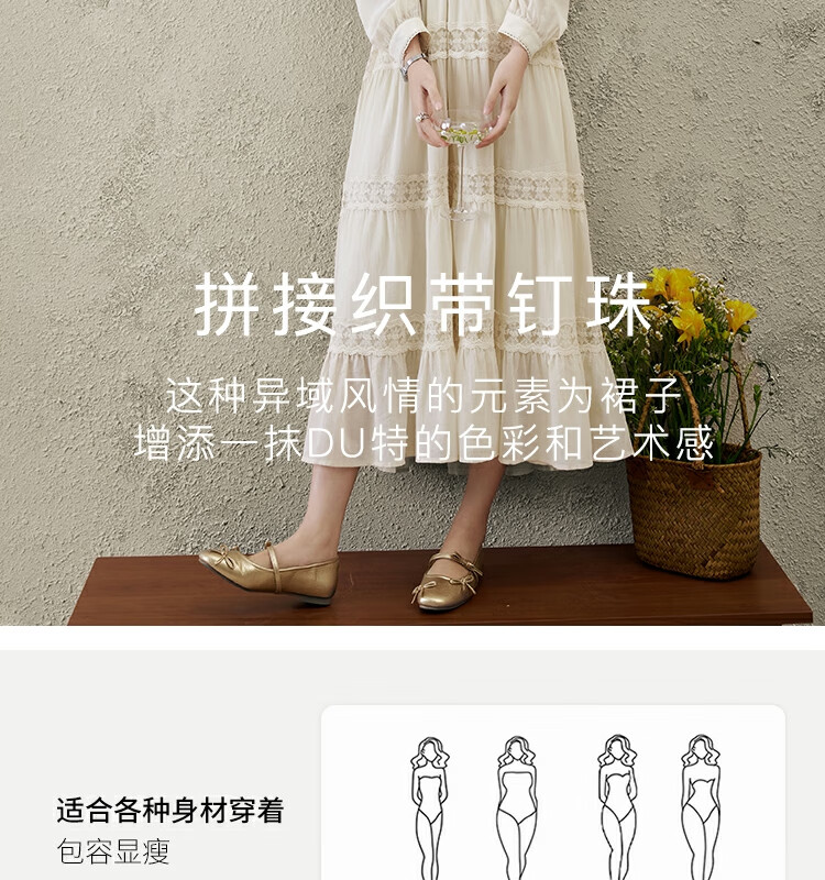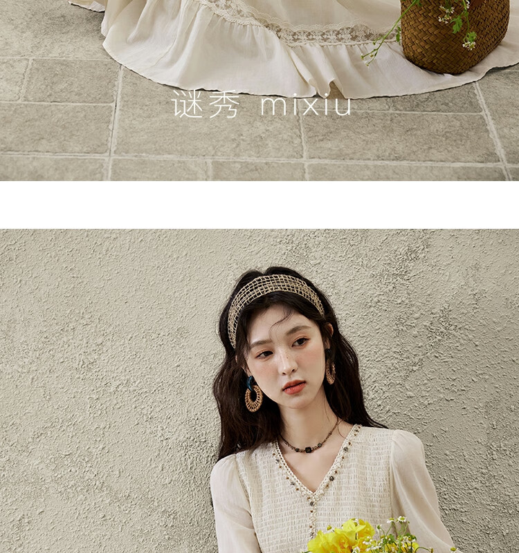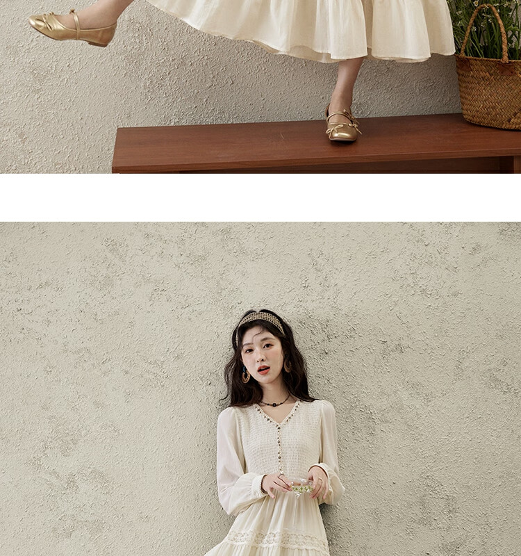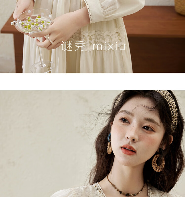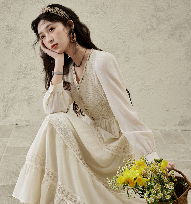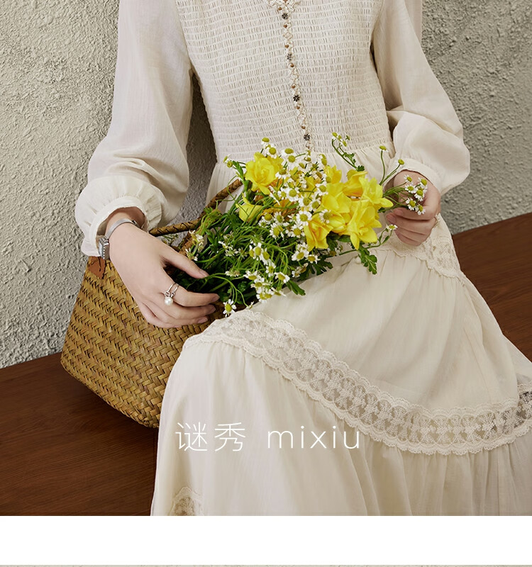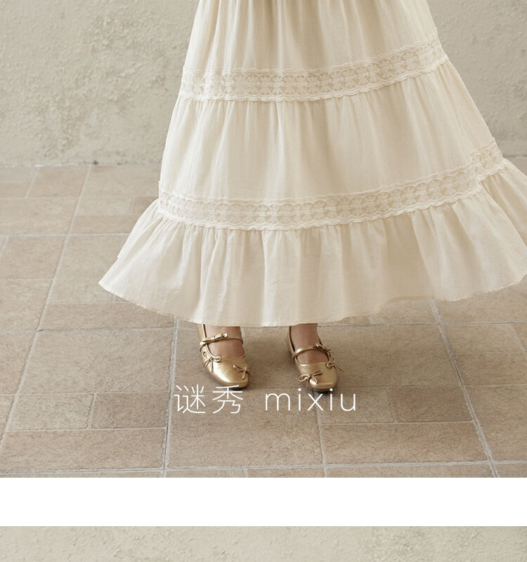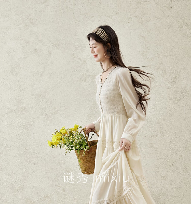 谜秀杏色连衣裙女2025春夏季花边蕾丝拼接复古收腰显瘦度假风长裙 奶糖杏 长款 M