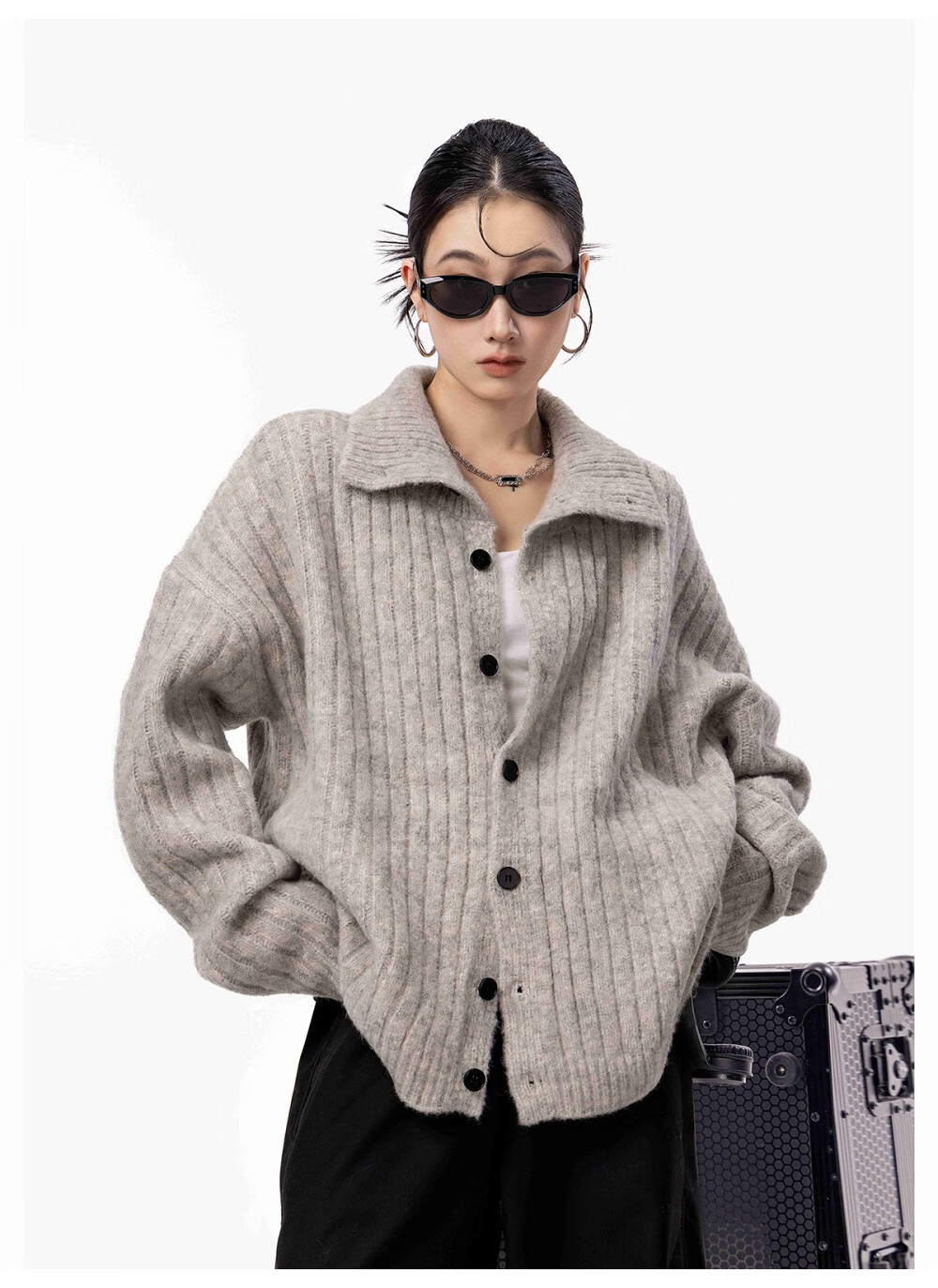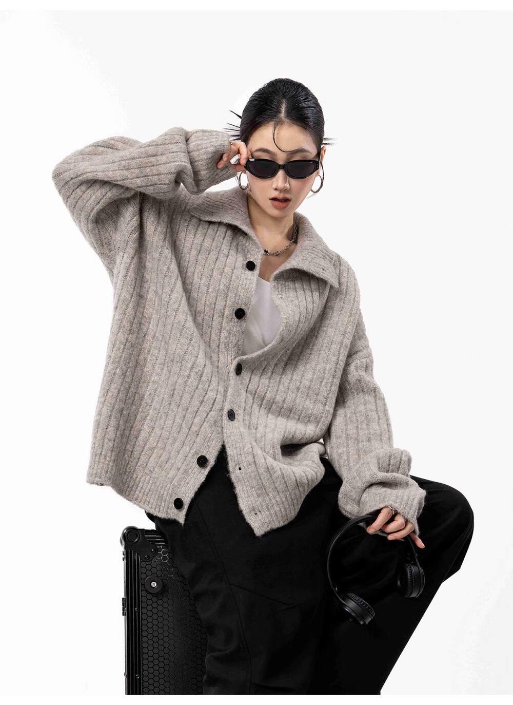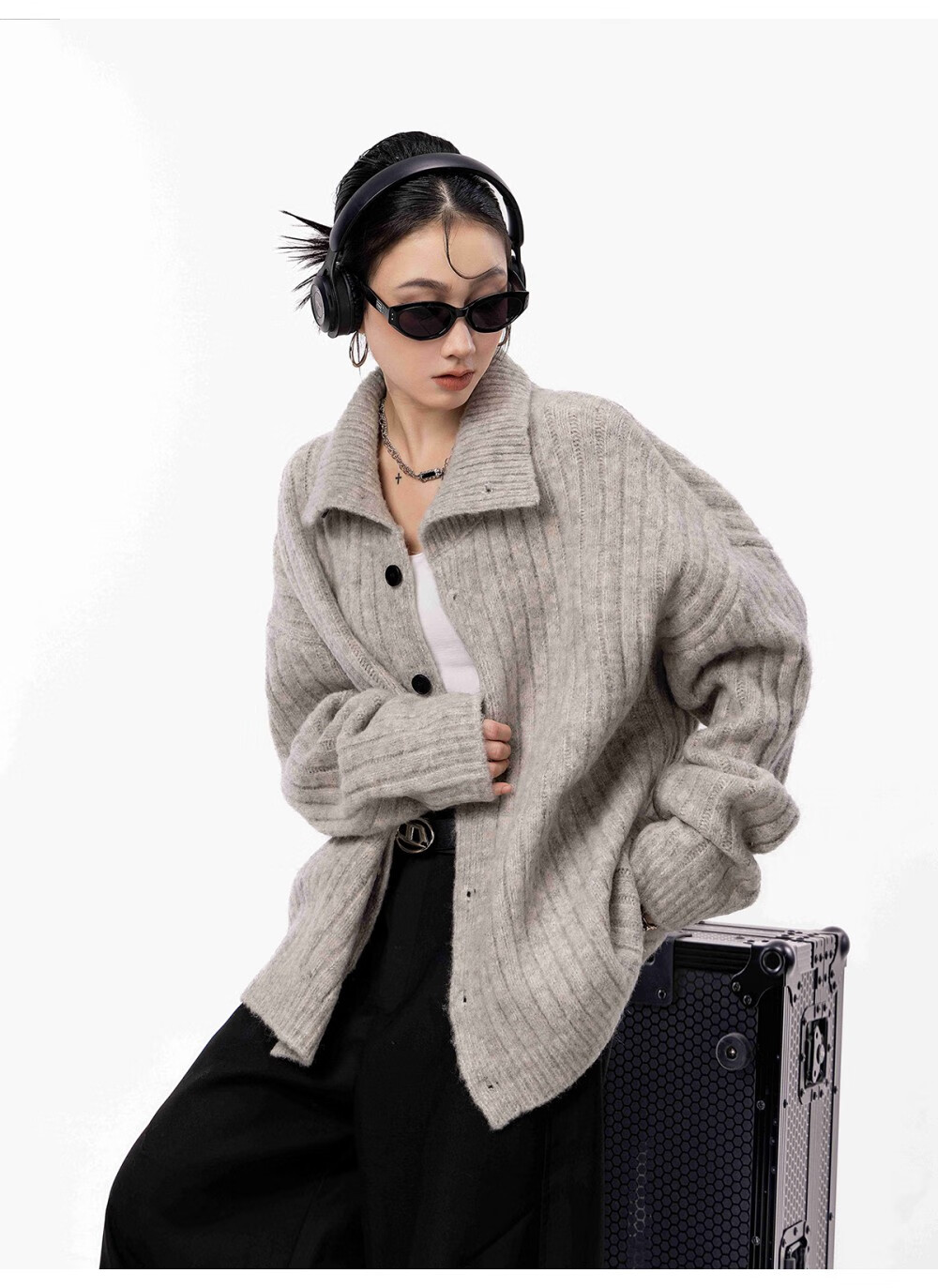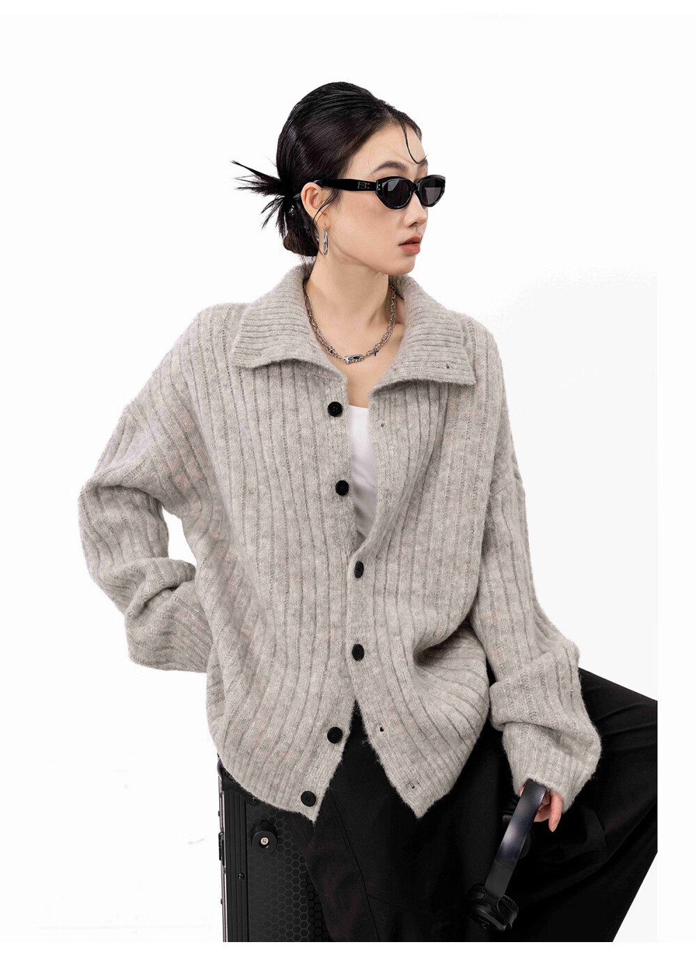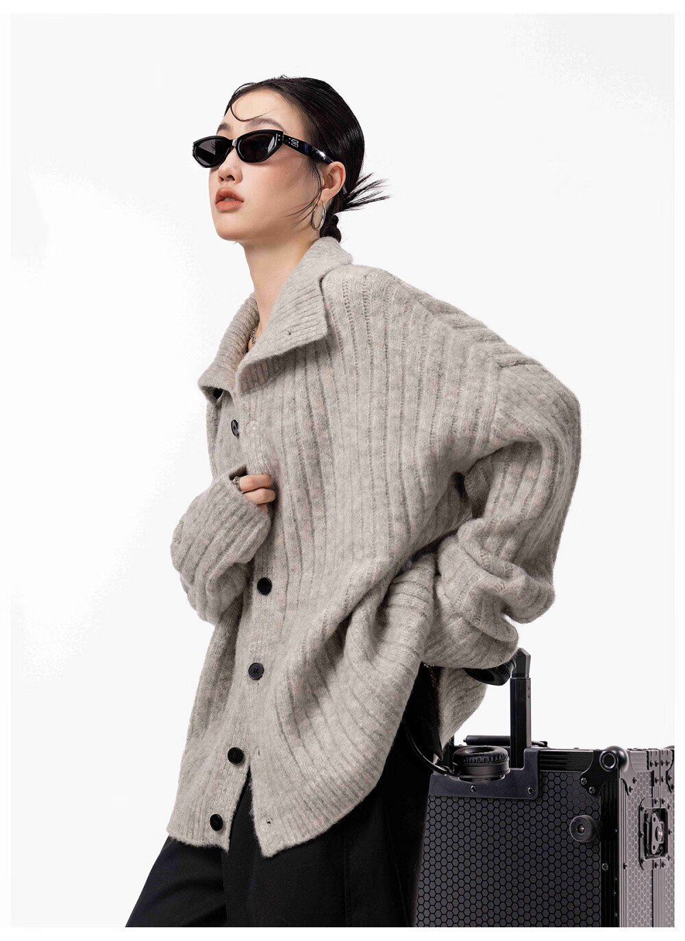 ICH MODE美式老钱风翻领针织开衫女秋冬季慵懒毛衣外套宽松上衣浅灰色 L