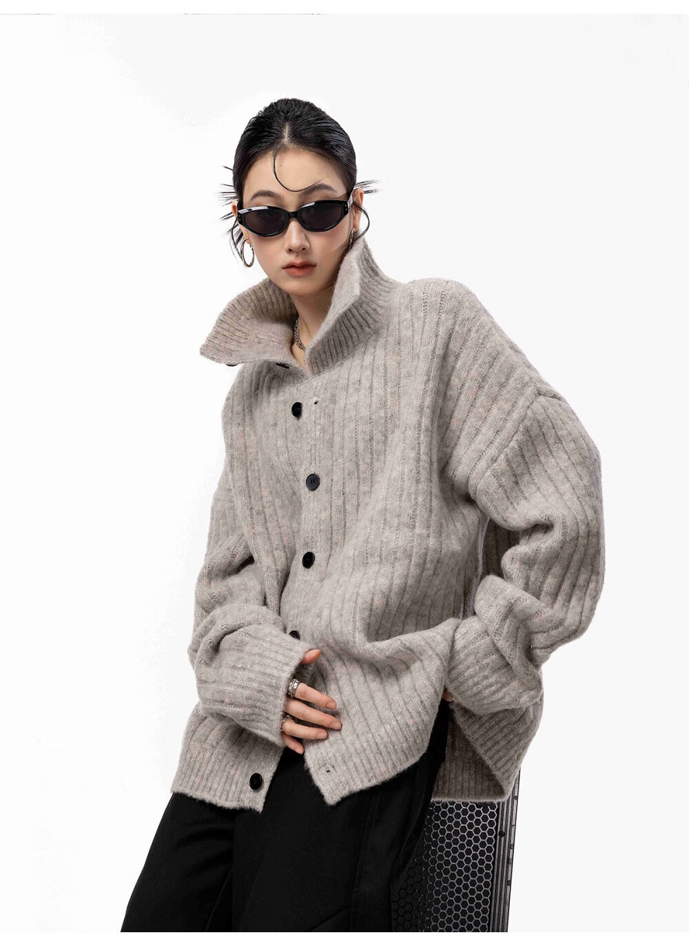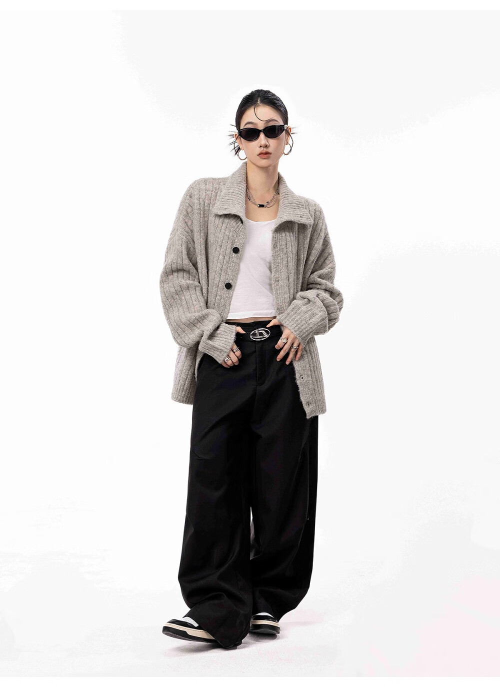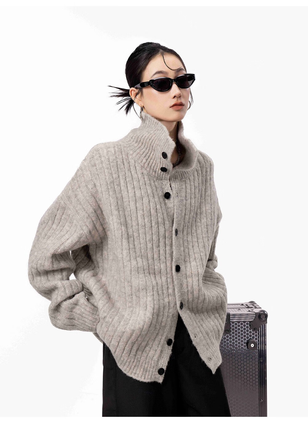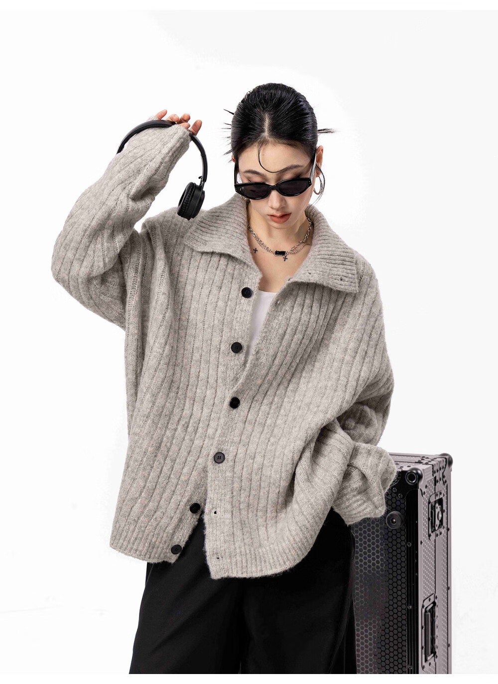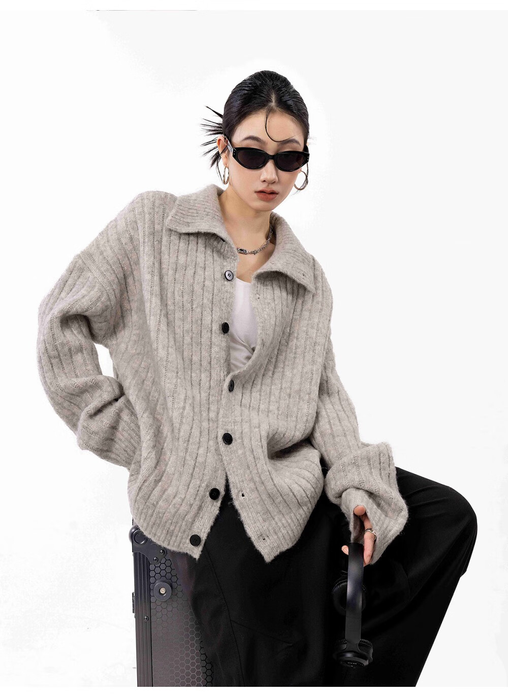 ICH MODE美式老钱风翻领针织开衫女秋冬季慵懒毛衣外套宽松上衣浅灰色 L