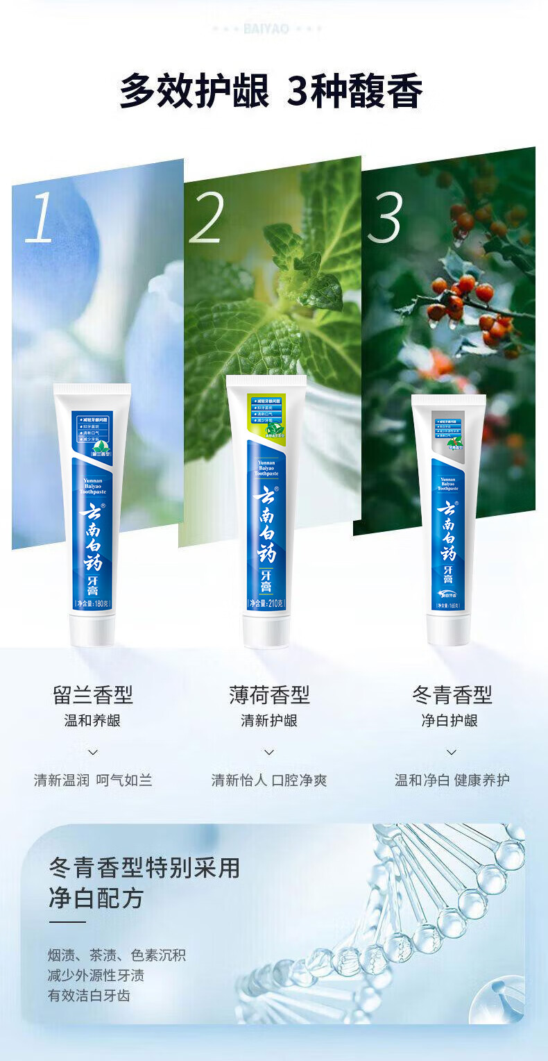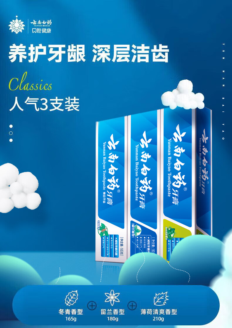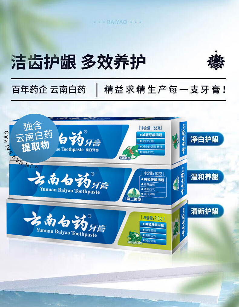 云南白药牙膏经典人气护口套装祛渍护龈亮白清新口气成人牙膏3支共555g