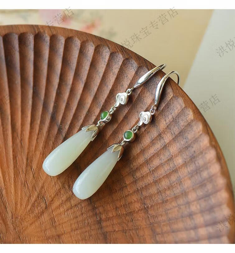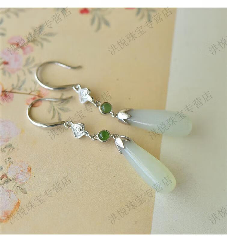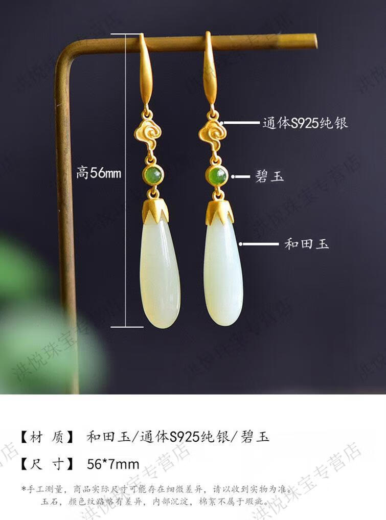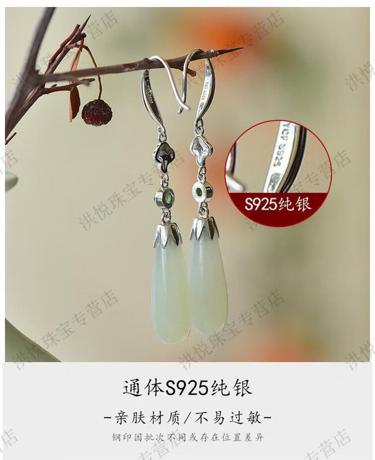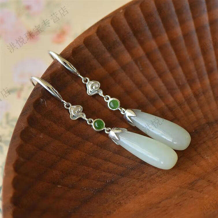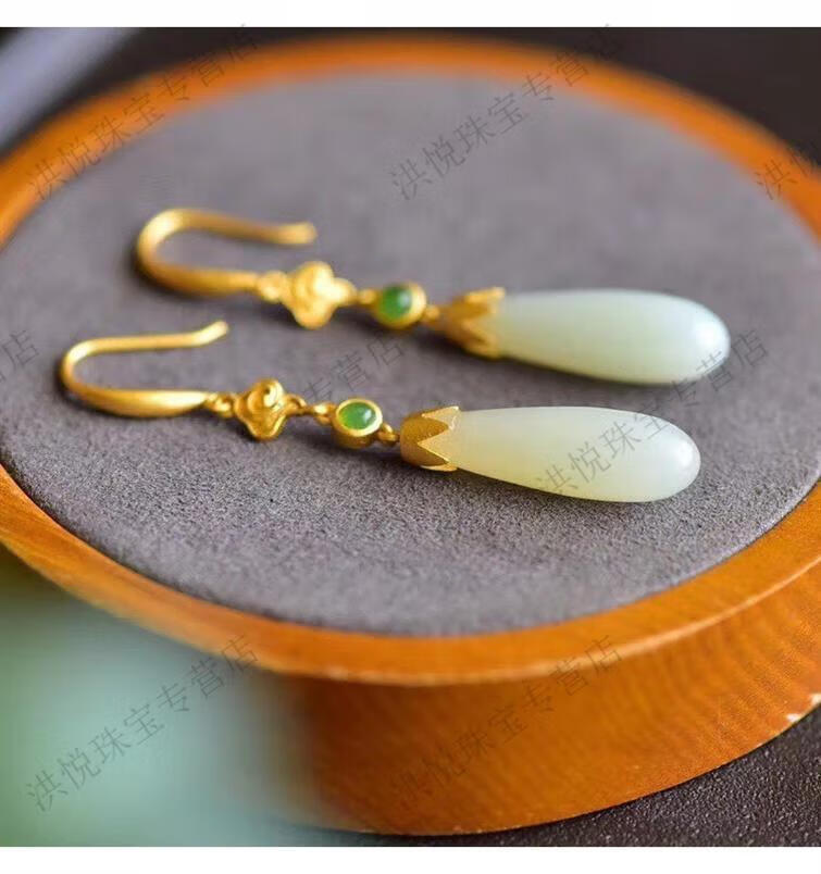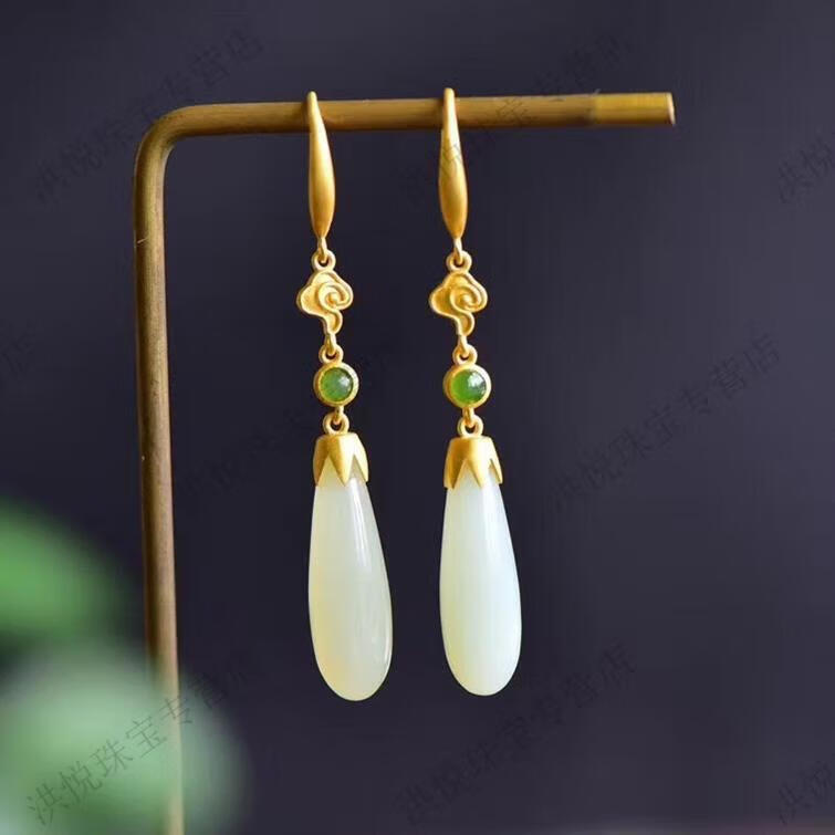 马思迷老凤凰999老凤凰18K金色水滴形和田玉耳坠耳环耳扣耳饰女配饰 水滴形和田玉耳坠-白金色
