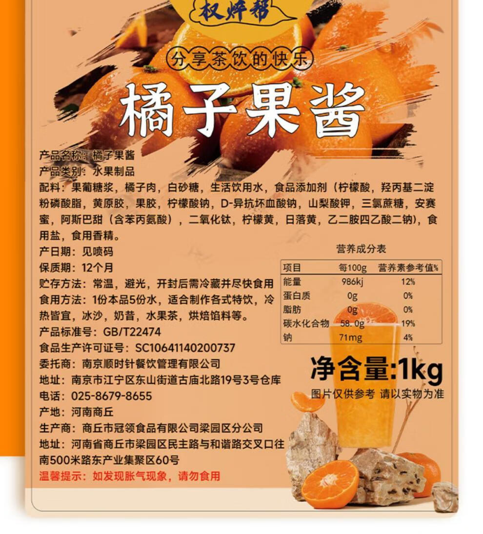 胖东来同款权焠帮权焠帮橙子果酱 爆汁大橘奶茶店专用橙子柑橘甜 橘子果酱1kg