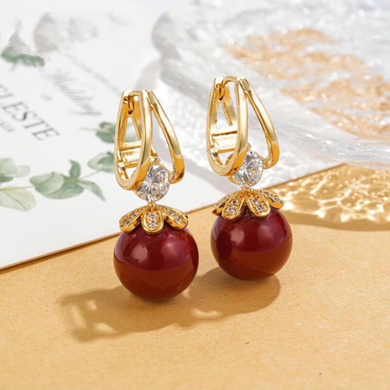 复古高级感酒红色珍珠耳扣新款气质独特日常时尚百搭镶钻耳环耳饰 白色珍珠耳扣