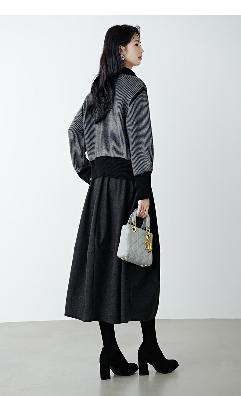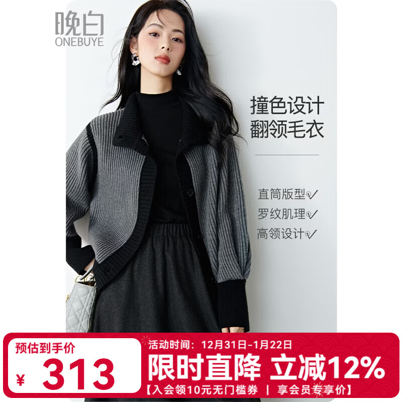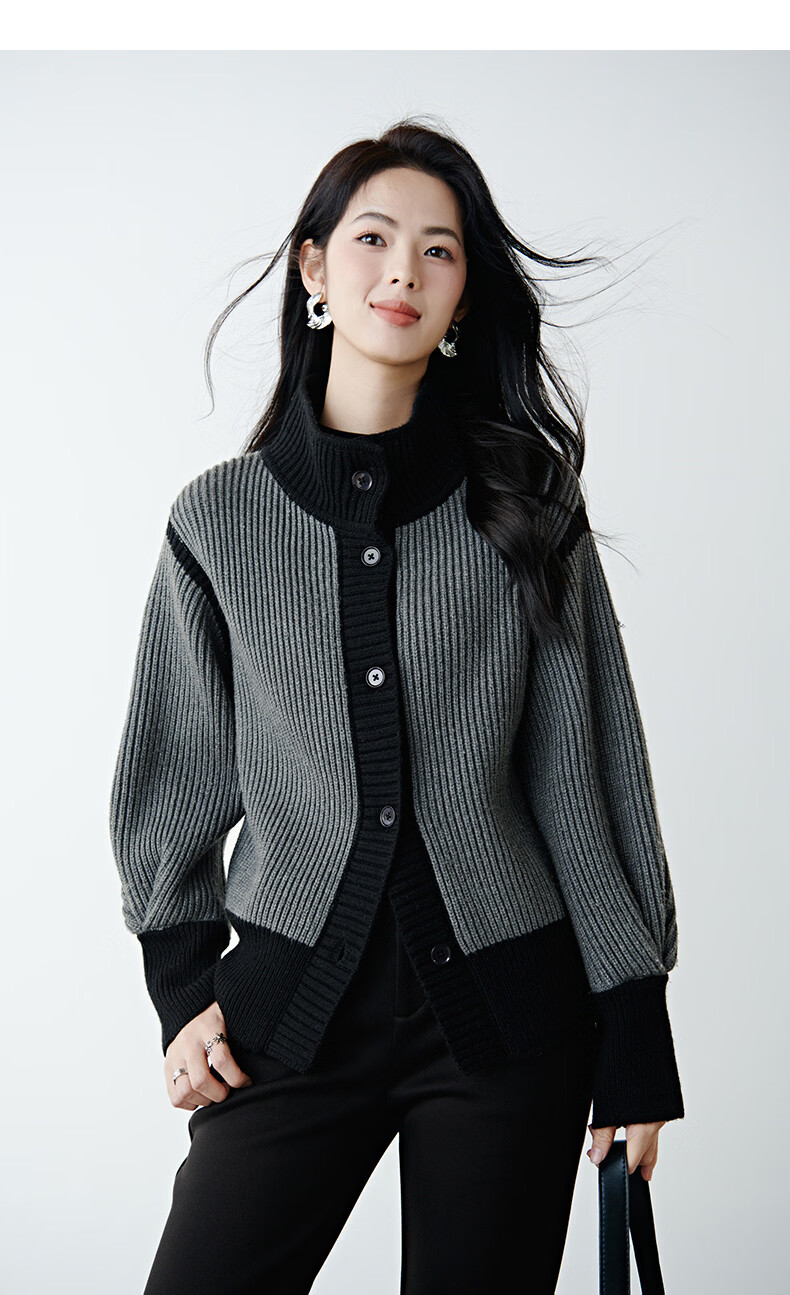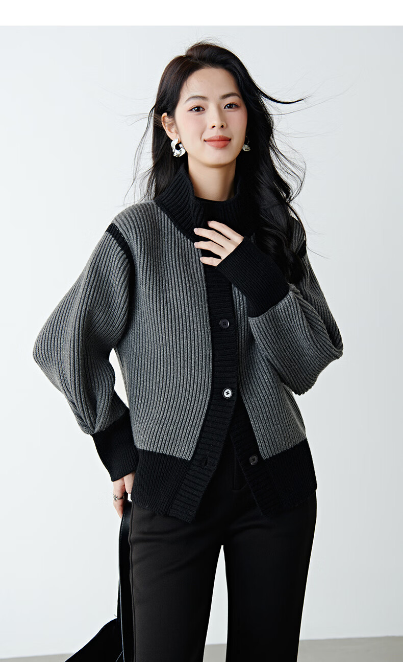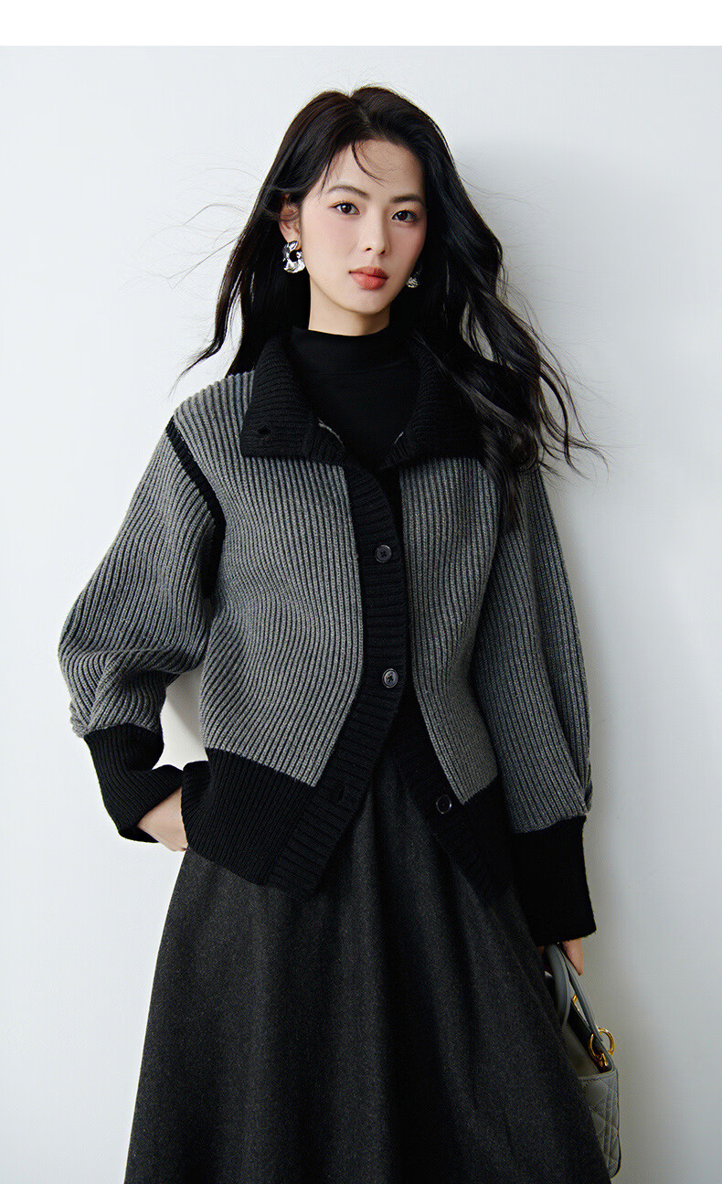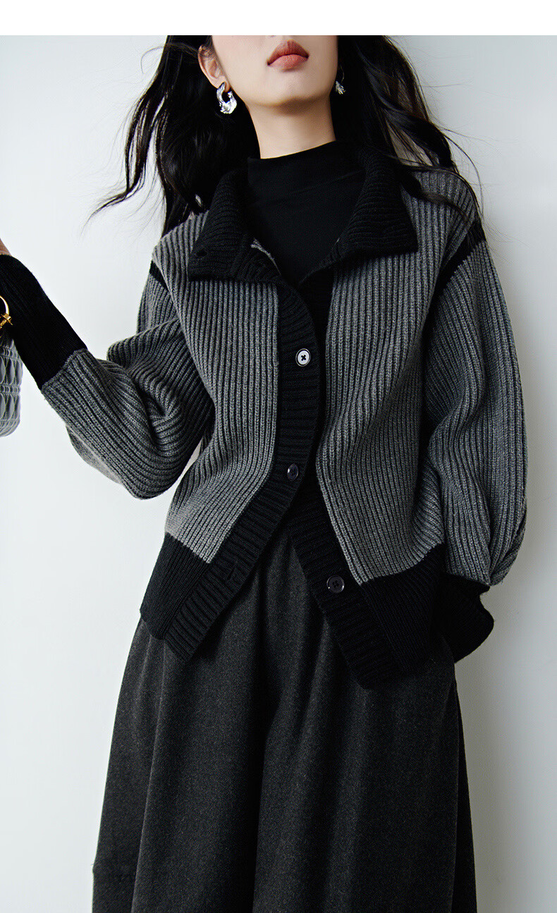 晚白2026春季时尚撞色翻领毛衣宽松显瘦舒适百搭针织外套女 灰色 L