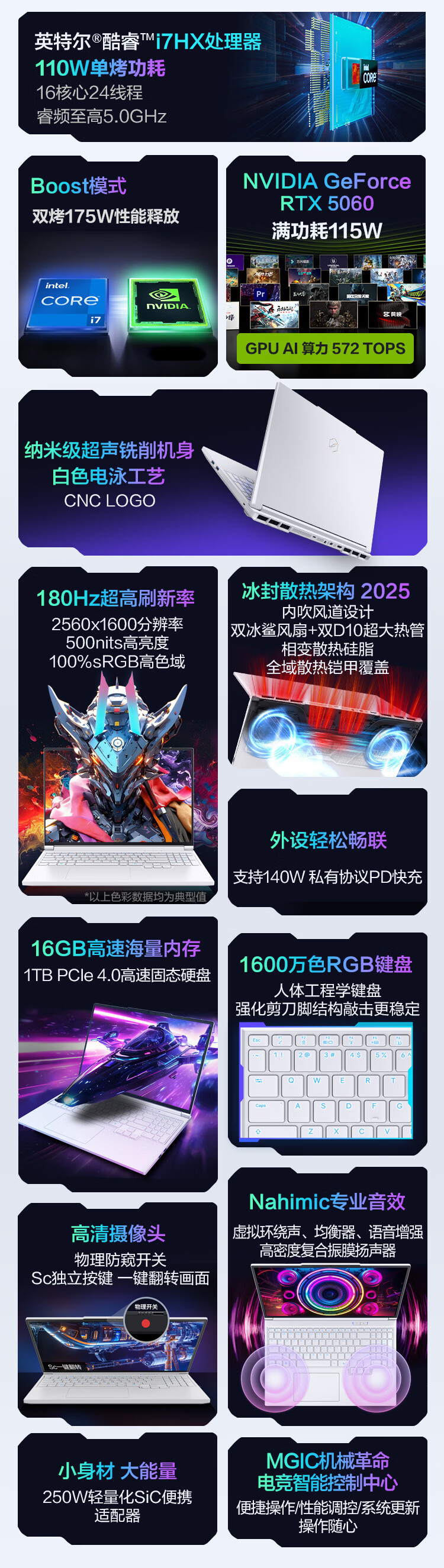 机械革命【国家补贴】极光X 酷睿i7HX 游戏本笔记本电脑(i7-13700HX 16G 1T RTX5060 2.5K屏 180Hz 白)